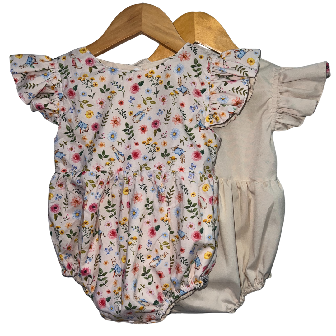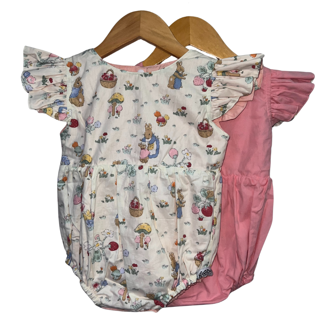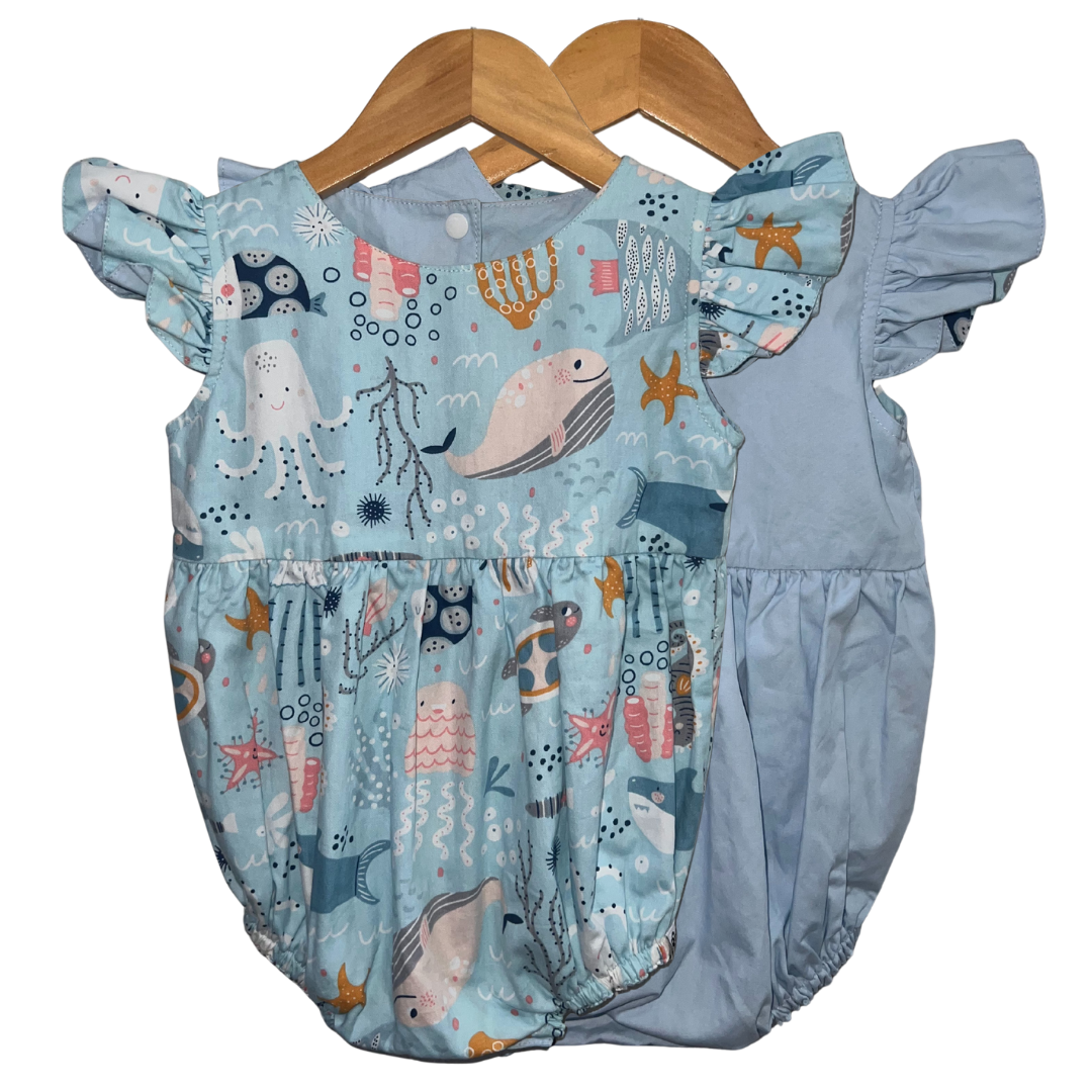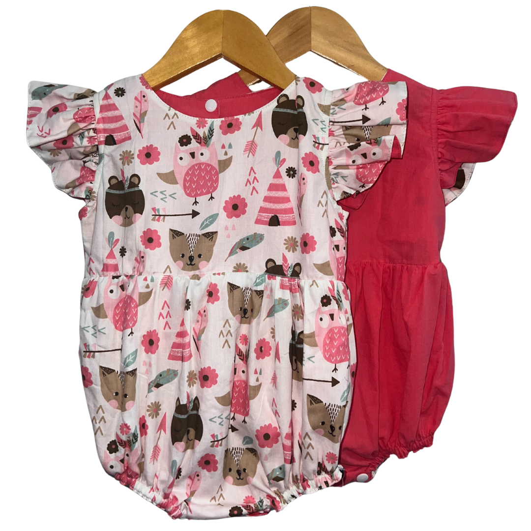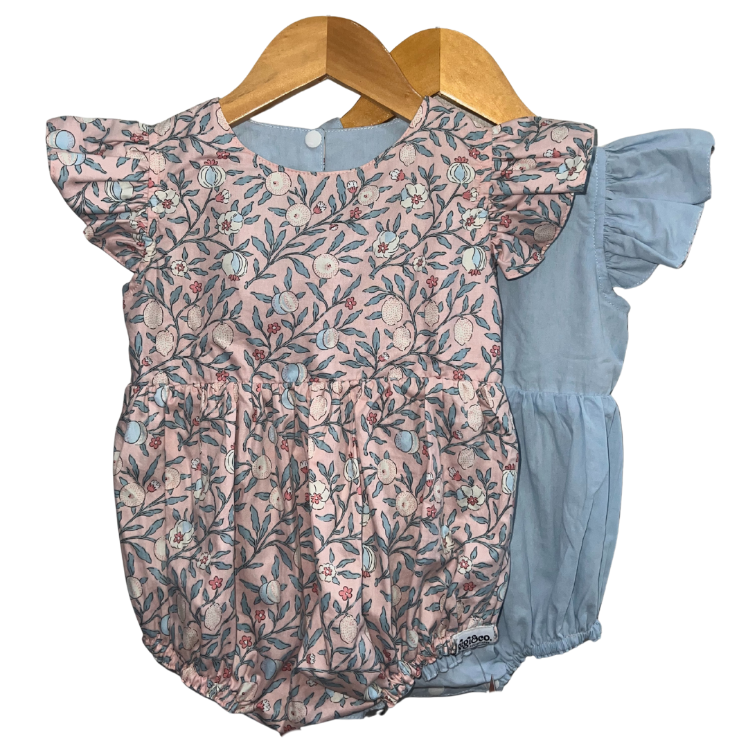 Product Feature: A reversible onesie for girls ages 6-12 mos. with complementary snap buttons.Features a reversible romper with collar and short sleeves.This is a reversible apparel.  Material is 100% cotton on print and cotton poplin on plain side. Snap closure at the bottom of the onesie to make changing diapers easier and more convenient.  Care Instructions: Gentle machine wash, on cold.Wash with like colors.Do not bleach.Do not soak.Iron on medium heat. Do not iron over brand labels or snap closure buttons.When washing, be mindful of the amount of detergent used as this, in some cases, may affect the durability and color of the cotton.