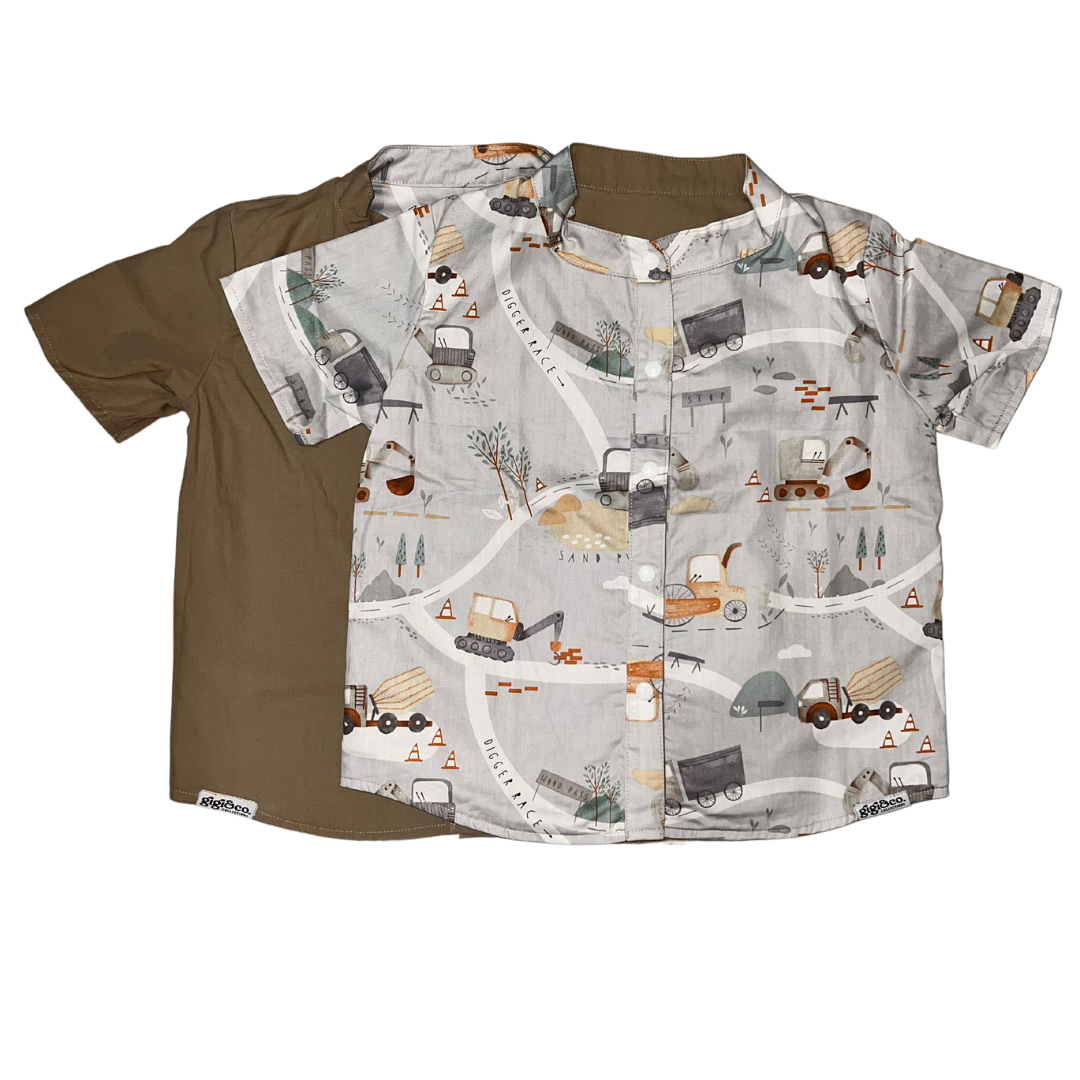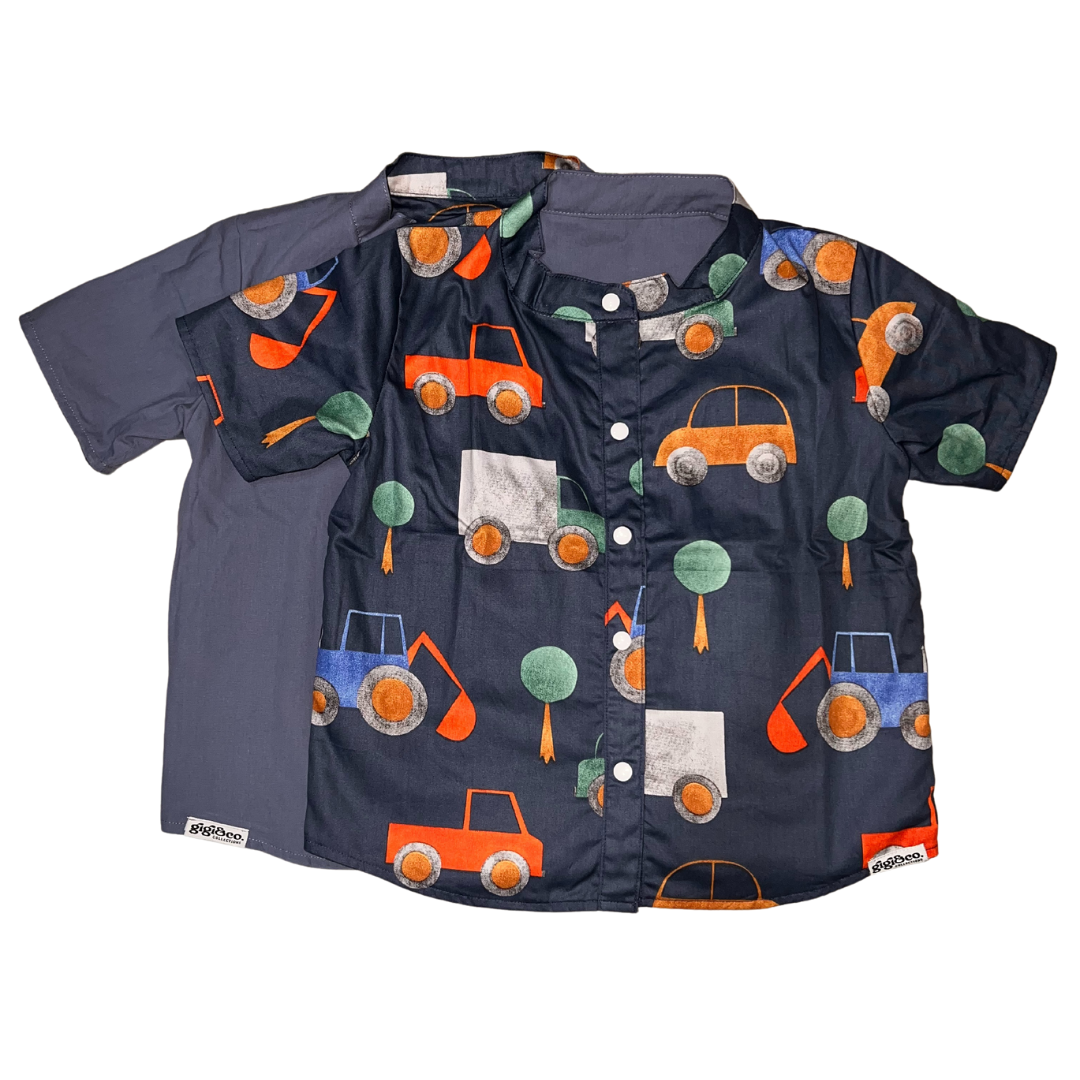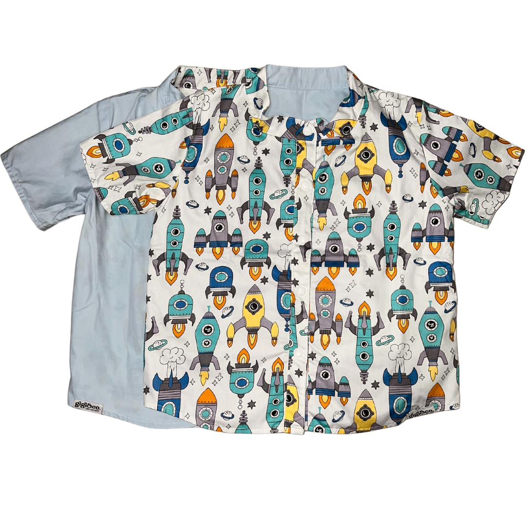 Product Feature: A short-sleeved smart polo for boys with snap closure buttons down the front. This is a reversible apparel.  Material is 100% cotton on print and cotton poplin on plain side. Fabric design is 100% custom-tailored for this product.  Care Instructions: Gentle machine wash, on cold. Wash with like colors. Do not bleach. Do not soak. Iron on medium heat. Do not iron over brand labels or snap closure buttons. When washing, be mindful of the amount of detergent used as this, in some cases, may affect the durability and color of the cotton.