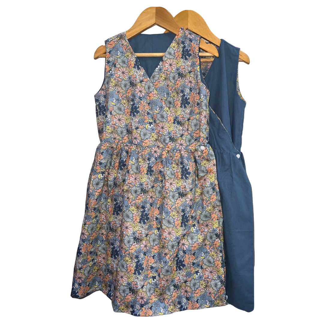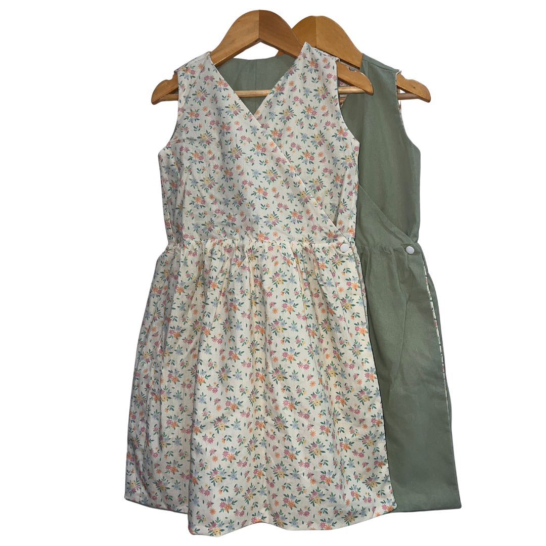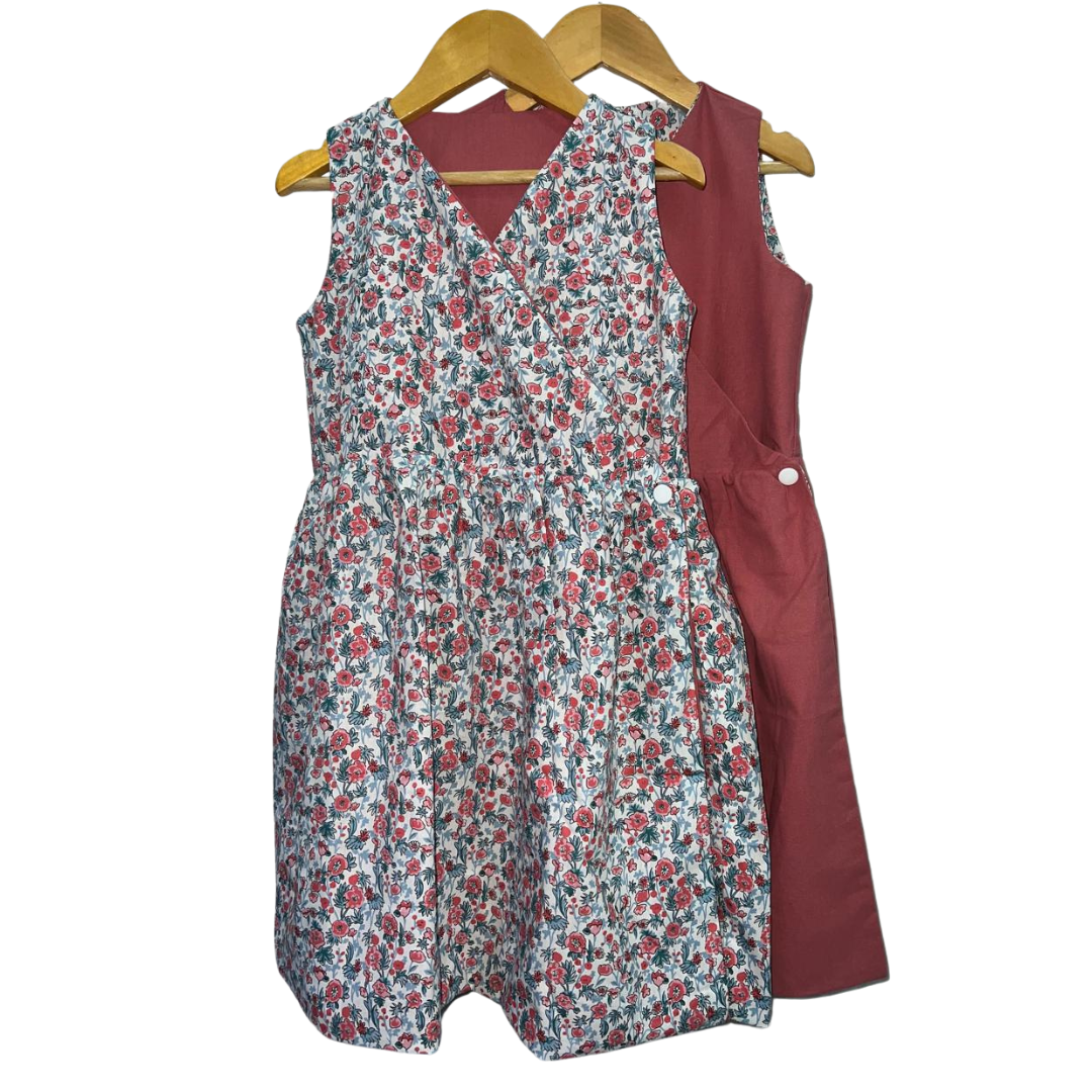 Product Feature: An elegant reversible wrap around sleeves dress for girls ages 2-10 Yrs. with complementary snap buttons. Perfect for older kids who prefer simplicity and elegance. Features an A-line silhouette and vibrant plain side colors for a dreamy feel when worn. This is a reversible apparel.  Material is 100% cotton on print and cotton linen on plain side. Fabric design is 100% custom-tailored for this dress.   Care Instructions: Gentle machine wash, on cold.Wash with like colors.Do not bleach.Do not soak.Iron on medium heat. Do not iron over brand labels or snap closure buttons.When washing, be mindful of the amount of detergent used as this, in some cases, may affect the durability and colour of the cotton.