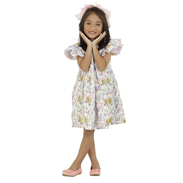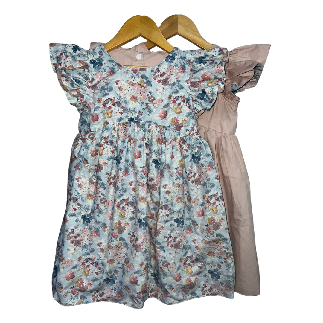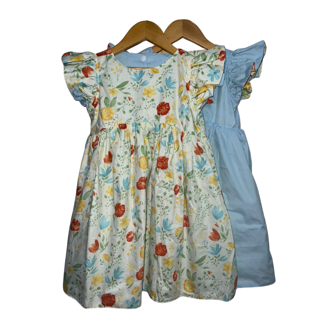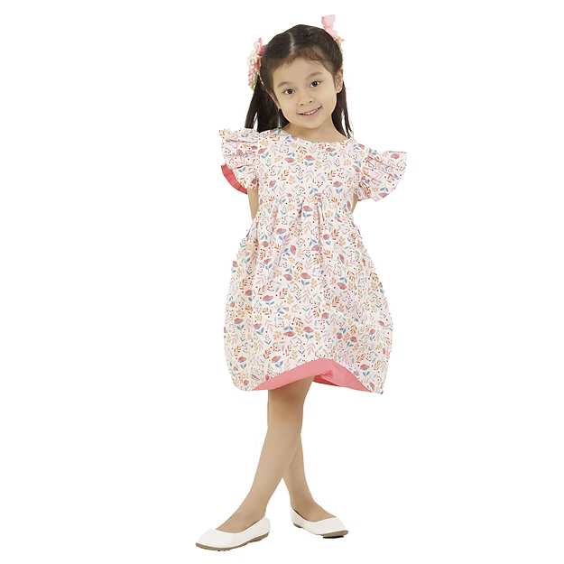 An elegant reversible flap sleeves dress for girls ages 2-8 Yrs. with complementary snap buttons. Features an A-line silhouette and vibrant plain side colors for a dreamy feel when worn. This is a reversible apparel.  Material is 100% cotton on print and cotton poplin on plain side. Fabric design is 100% custom-tailored for this dress