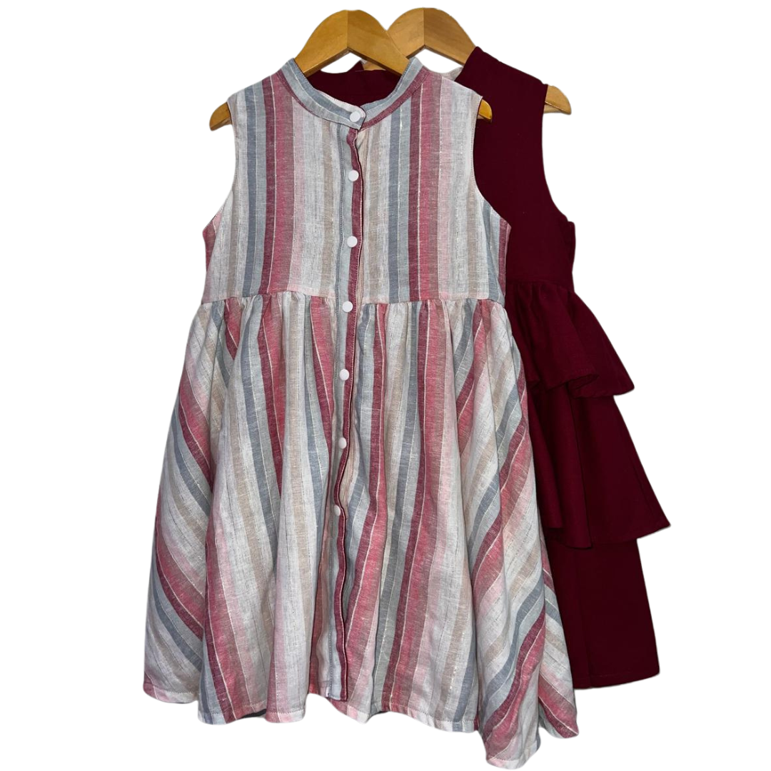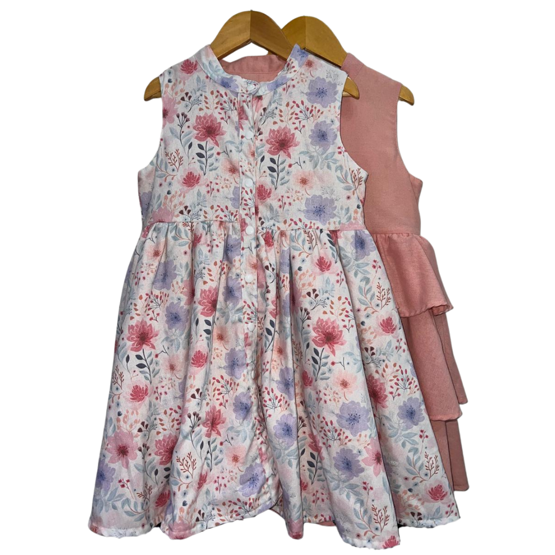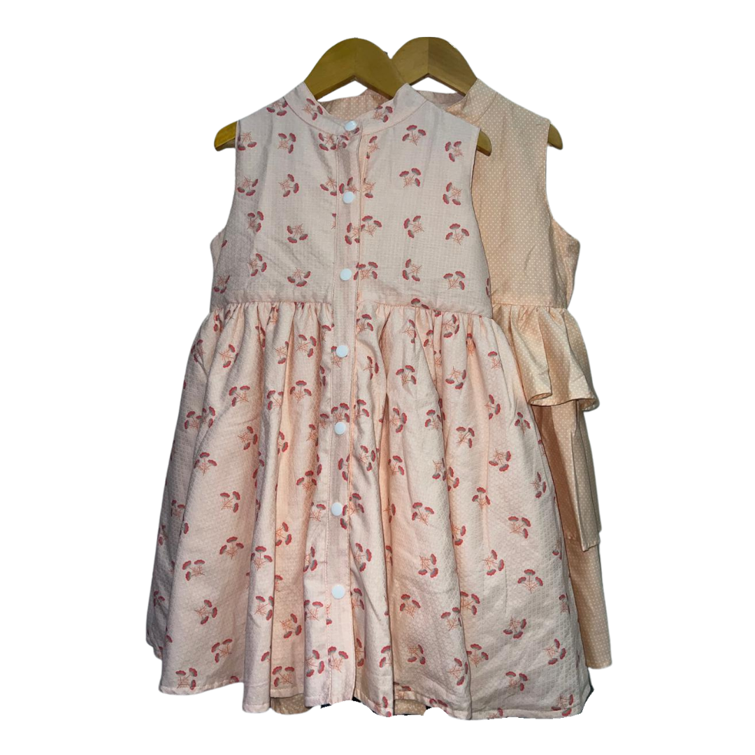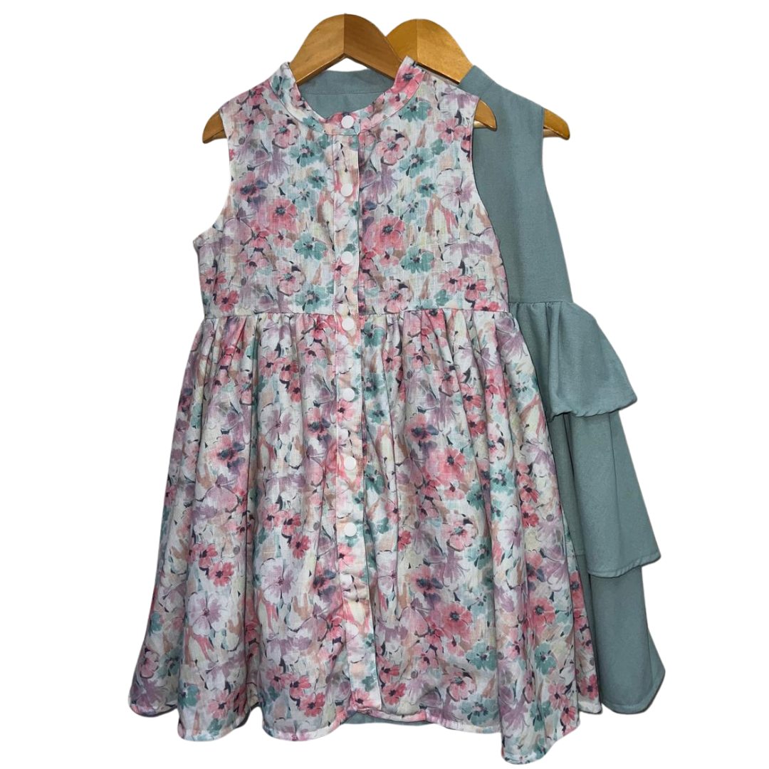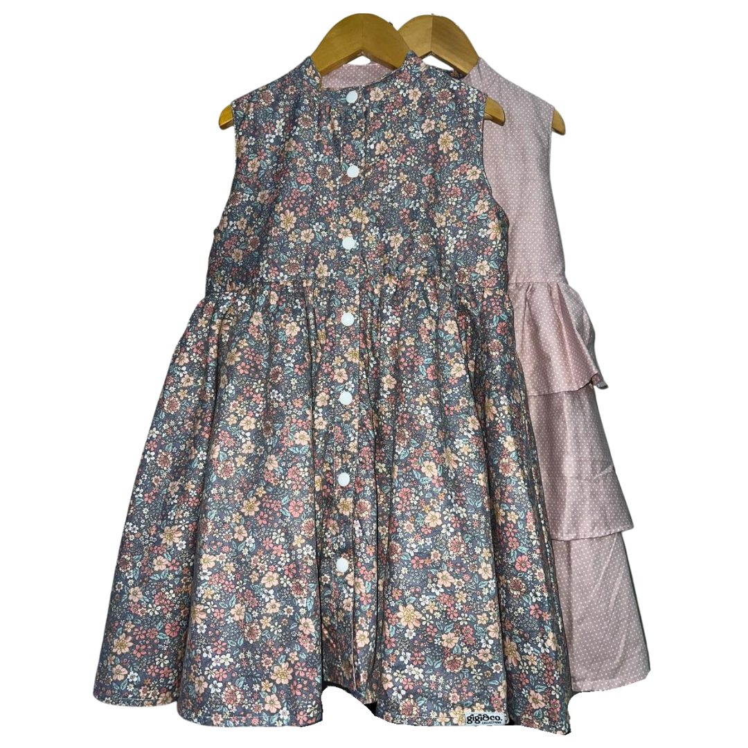 Product Feature: An elegant reversible sleeveless dress for girls ages 2-10 Yrs. with complementary snap buttons. Features a gathered skirt and vibrant layered side colors for a dreamy feel when worn. This is a reversible apparel. Material is 100% cotton linen on print and cotton linen on plain side. Fabric design is 100% custom-tailored for this dress.   Care Instructions: Gentle machine wash, on cold. Wash with like colors. Do not bleach. Do not soak. Iron on medium heat. Do not iron over brand labels or snap closure buttons. When washing, be mindful of the amount of detergent used as this, in some cases, may affect the durability and color of the cotton.