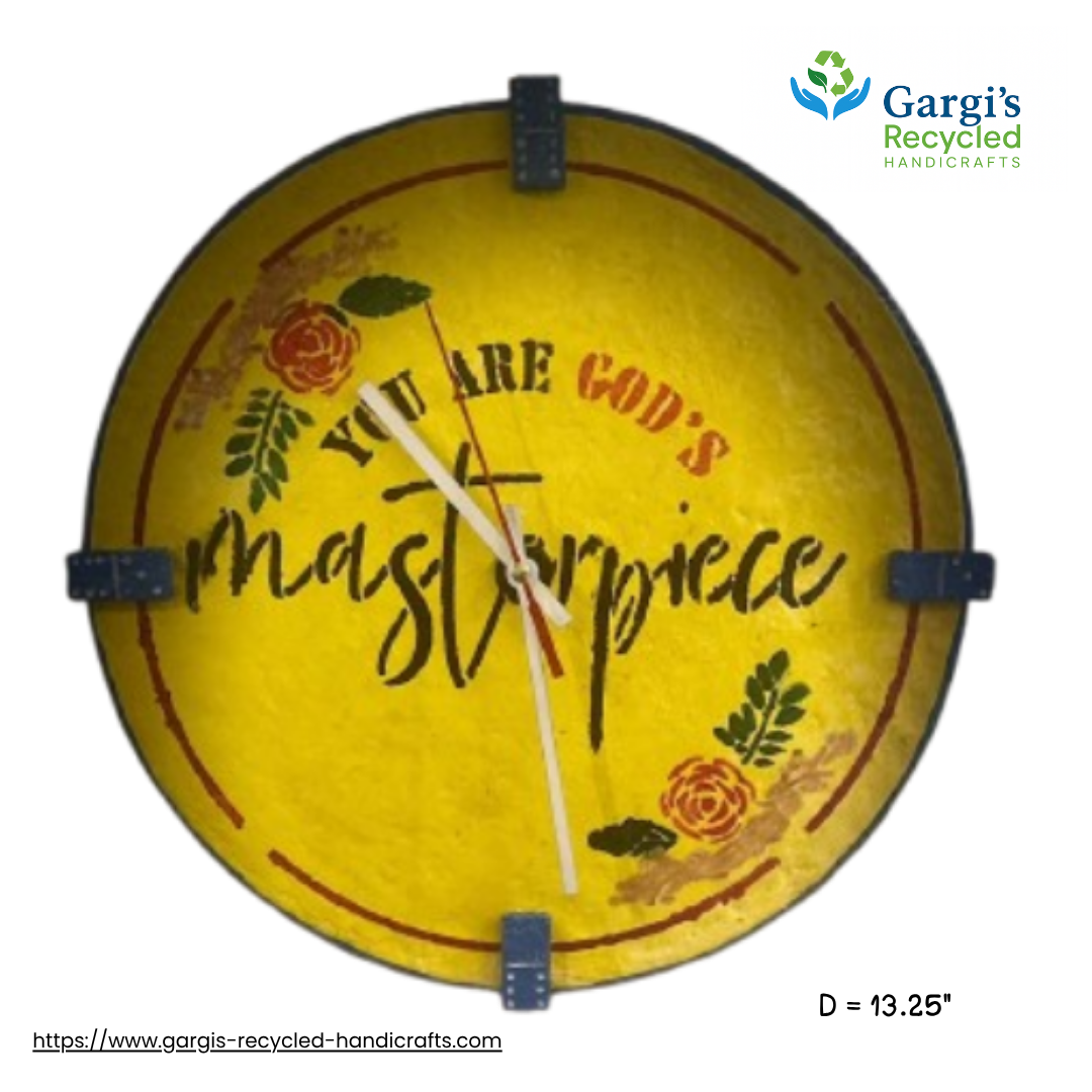 The God’s Masterpiece Wall Clock is a bold 13.25" handcrafted timepiece made from recycled shredded paper, combining sustainable living with uplifting inspiration. Its vibrant yellow face, floral details, and the words “You are God’s Masterpiece” serve as a daily reminder of your worth — and that time is ticking, so make every moment count. Fully eco-friendly and quick to decompose at the end of its life, this handmade clock carries a unique texture and charm, making it perfect for homes, offices, creative spaces, or as a thoughtful gift for someone special.