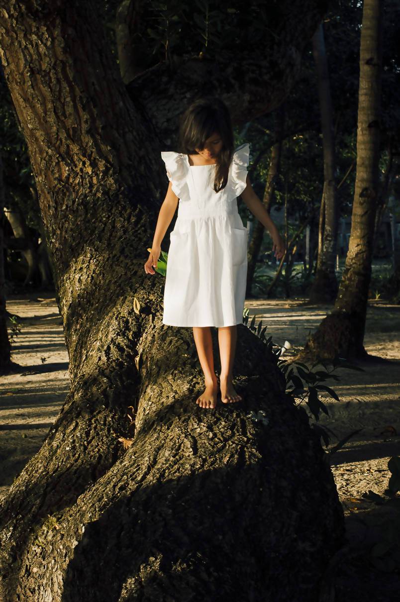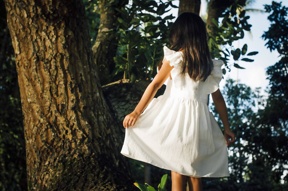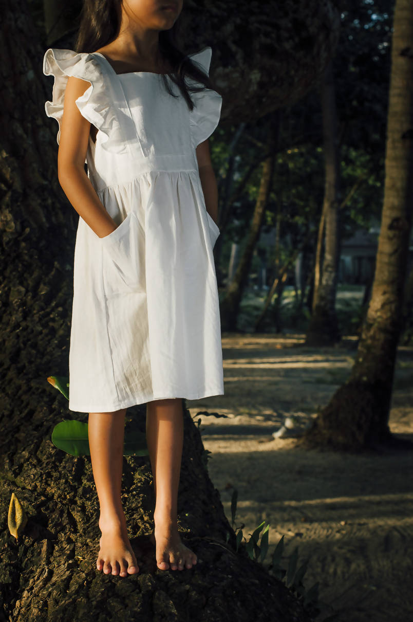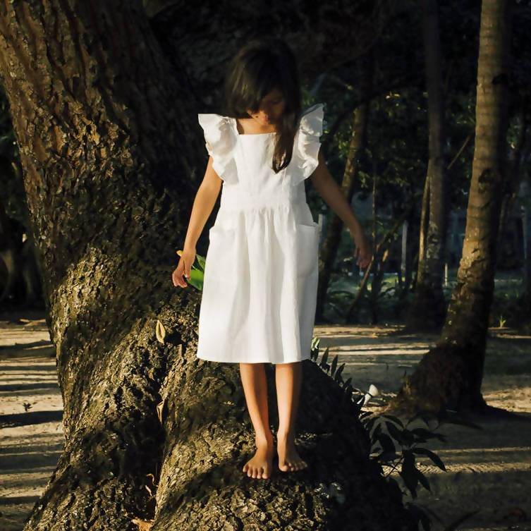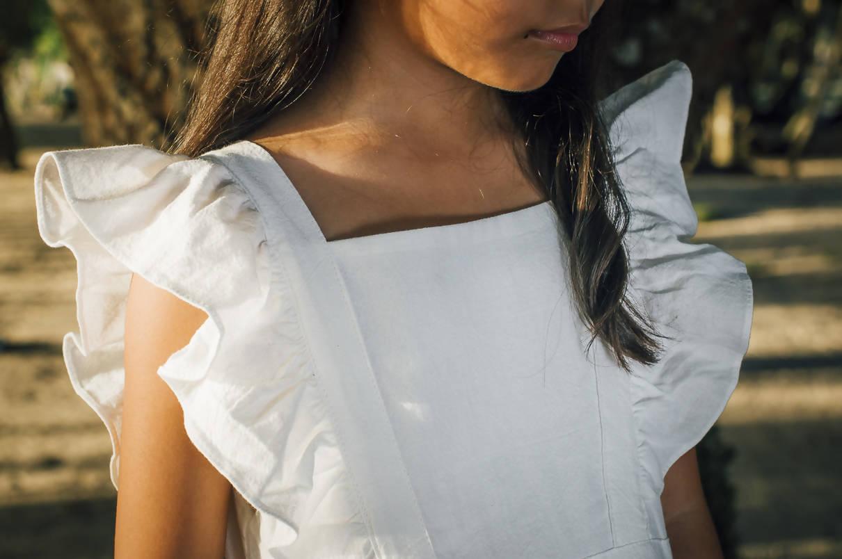 (Veya & Bloom) The Golden hour Dress makes a statement with its oversized frill shoulder details, but is sweet enough for any occasion. Made of cotton linen blend material, this high quality midi dress is lined and has opening on the back with snap closure. The material has no stretch at all but sizing runs slightly large, if you prefer a more fitted look or your child is smaller, please size down.