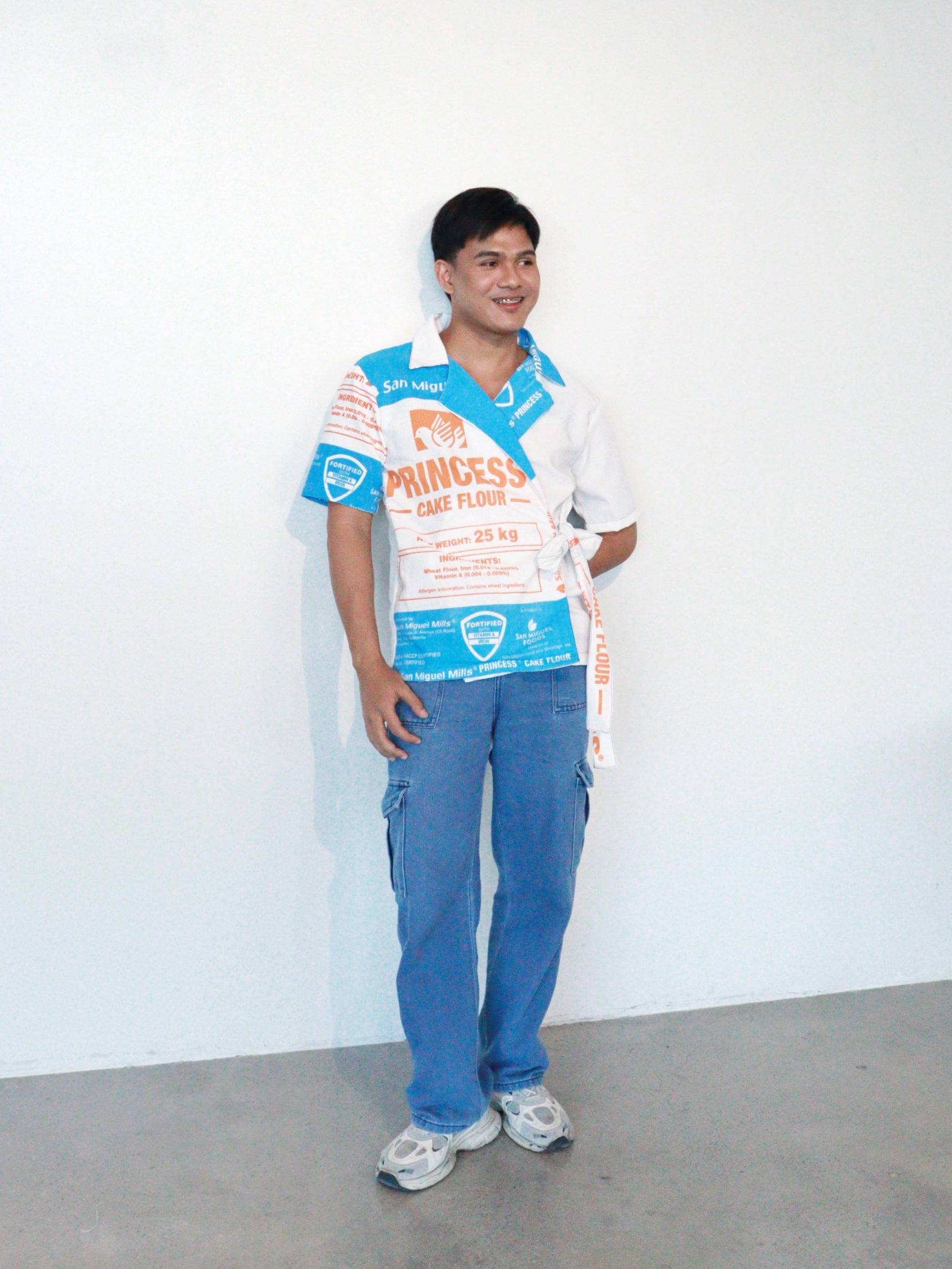 A hanbok inspired modernized with a polo silhouette made from recycled flour sacks.
