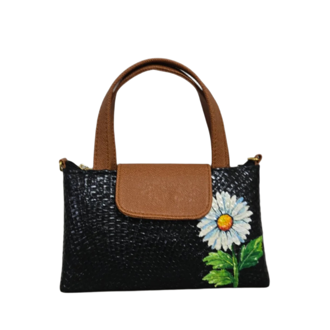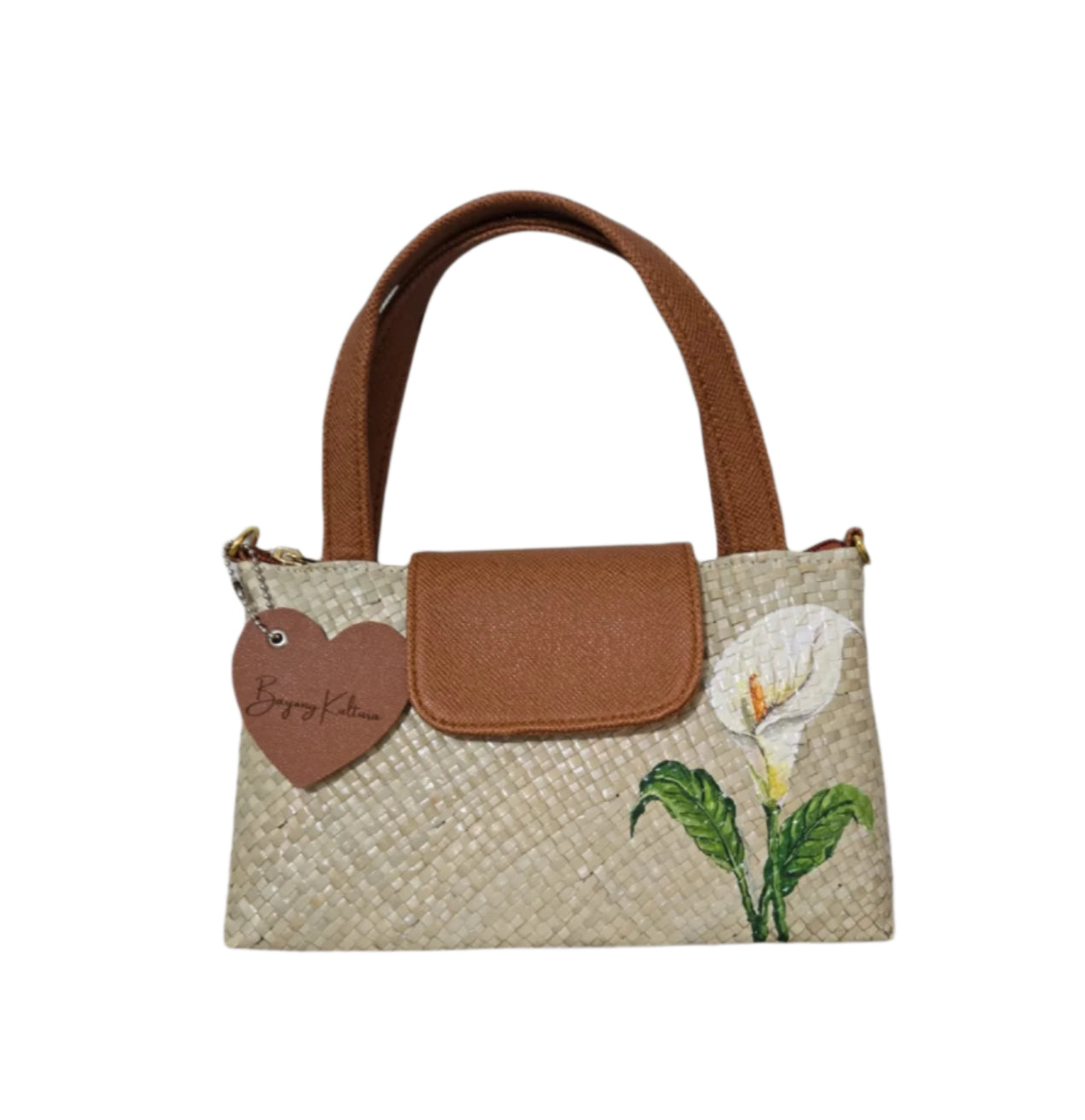 Materials: Handwoven pandan with leatherette handle, flap and adjustable sling strap