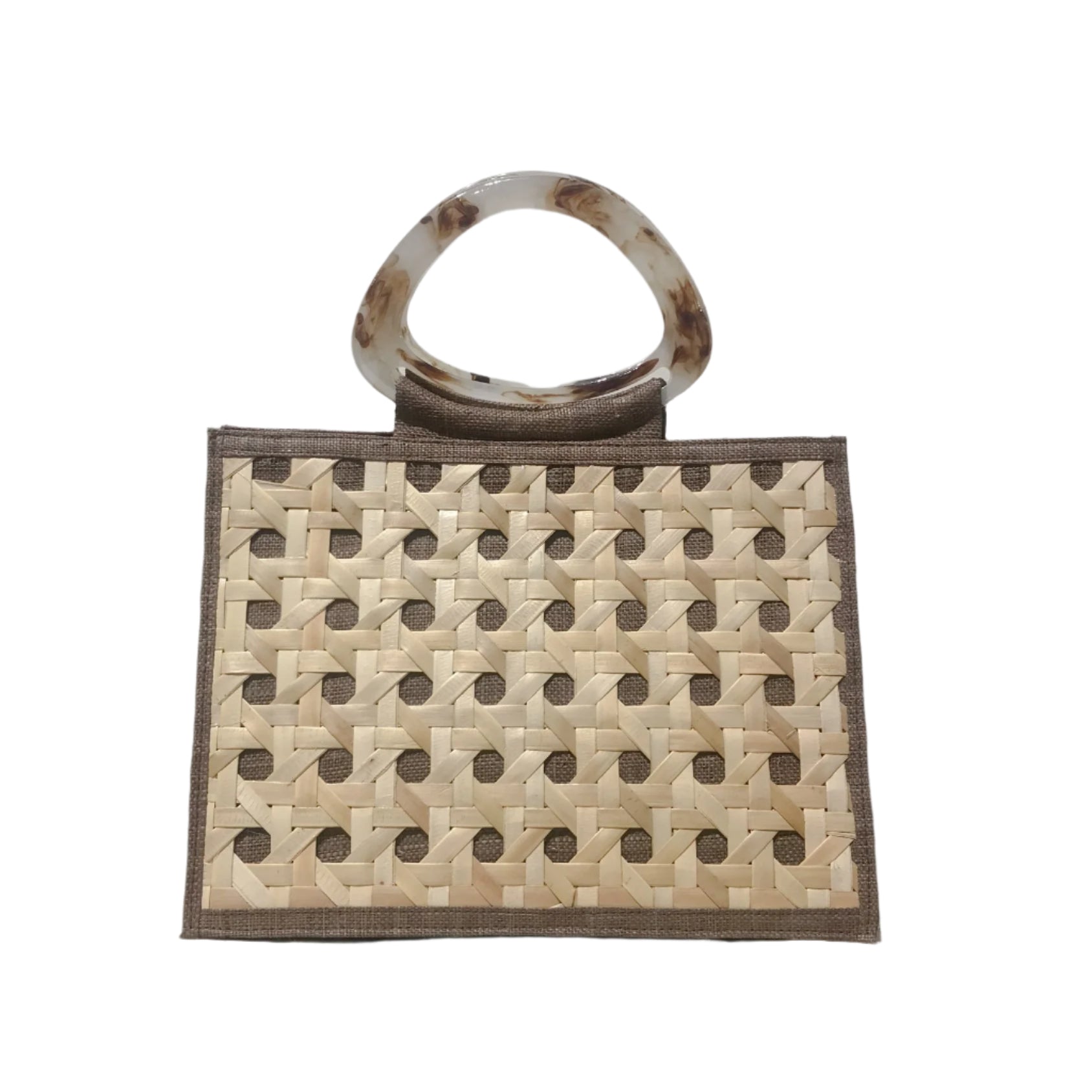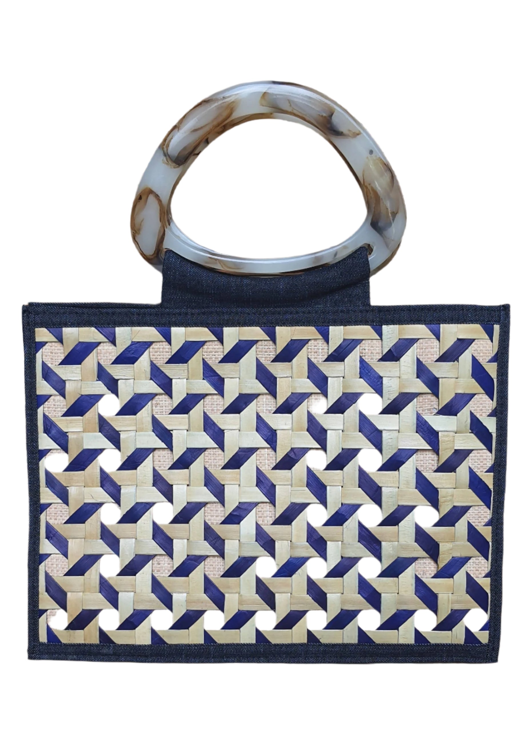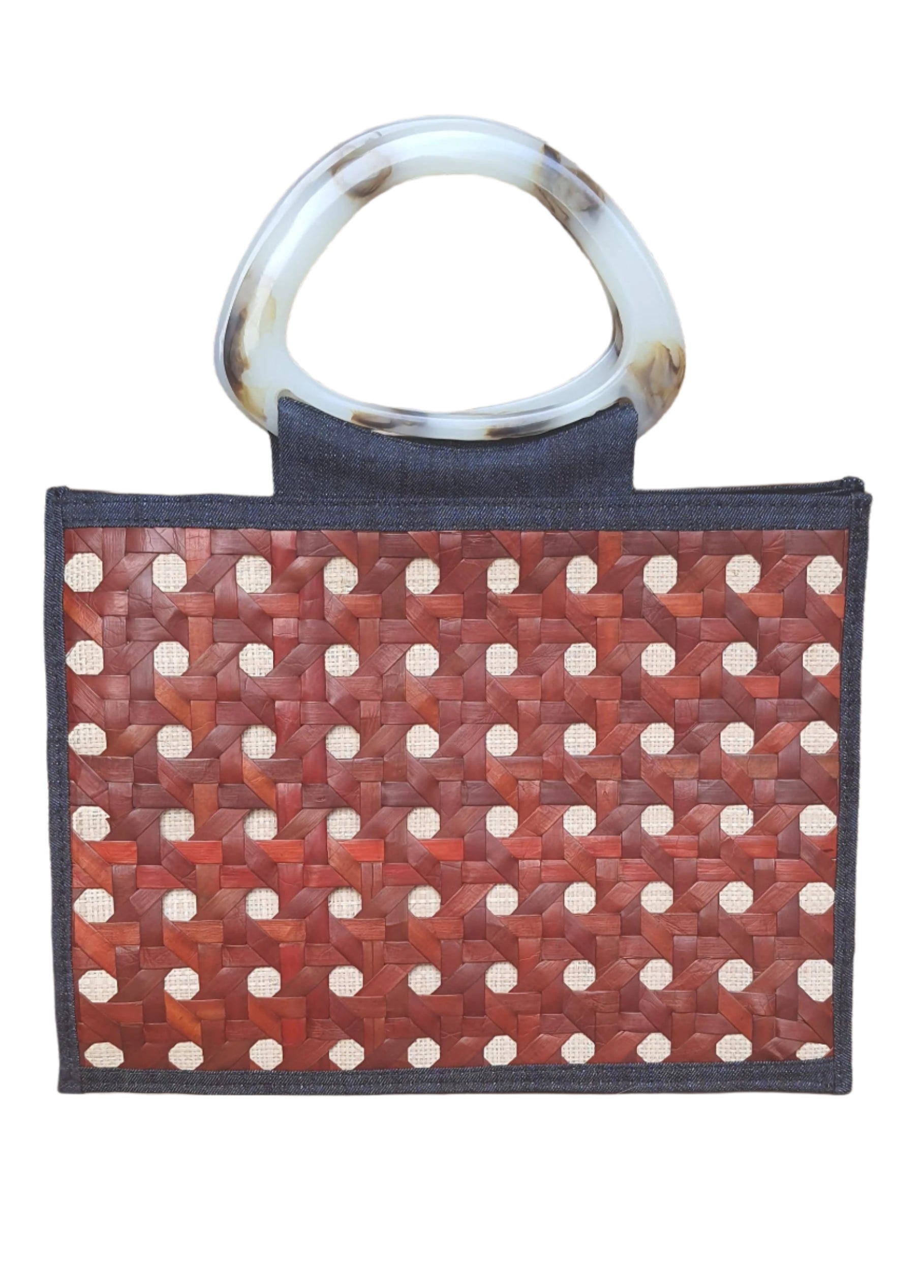 Made with Handwoven Textile, Raffia and Solihiya Patterns.  Comes in Limited Designs and Different Two Toned Variations Acrylic Handle 13” W 10” H 5.5” Depth