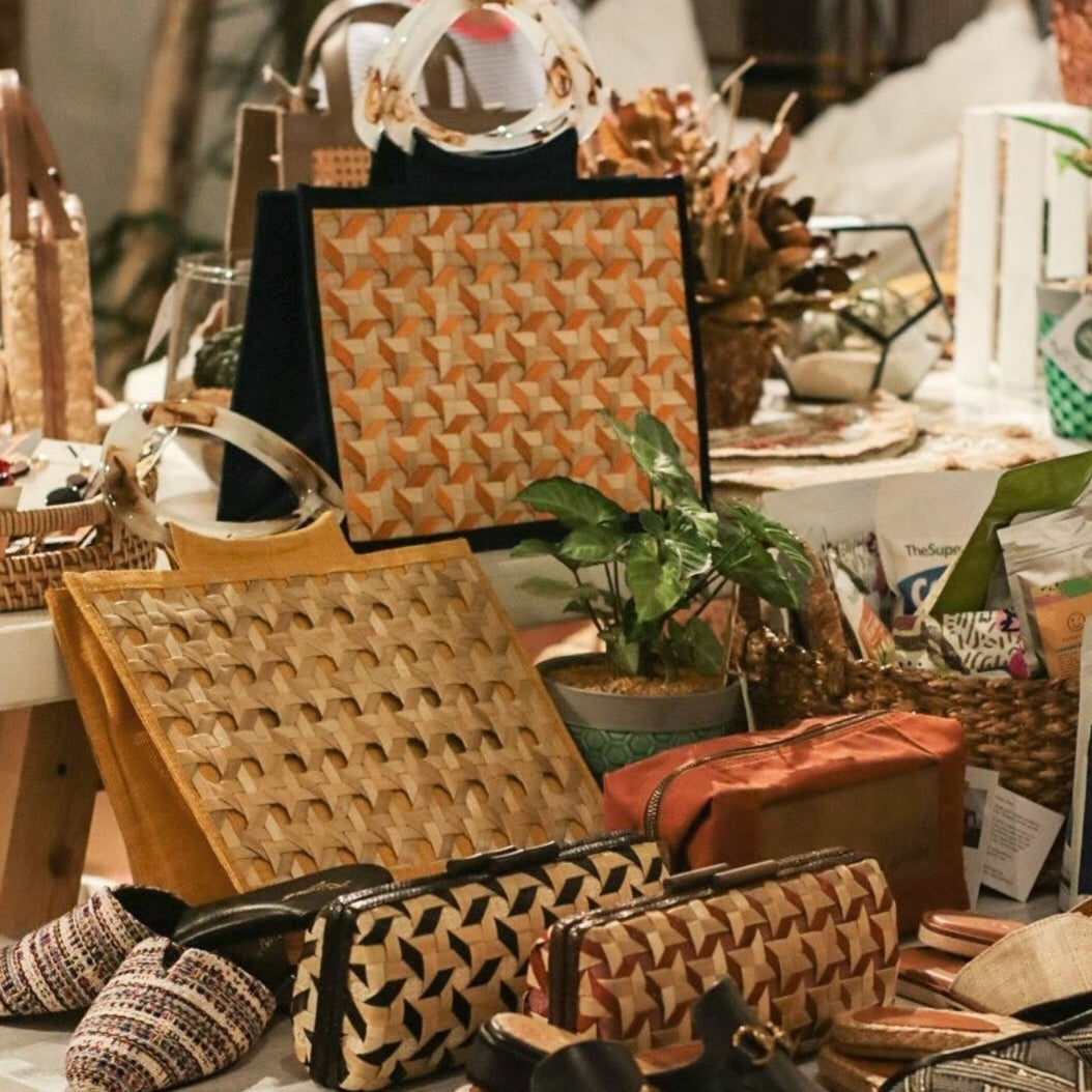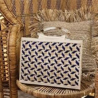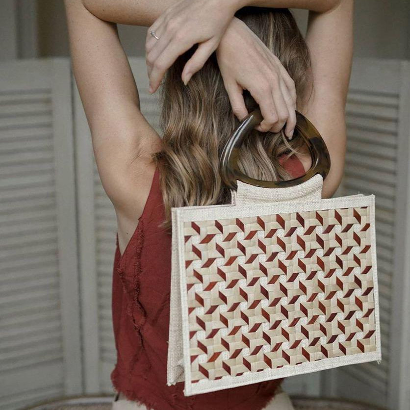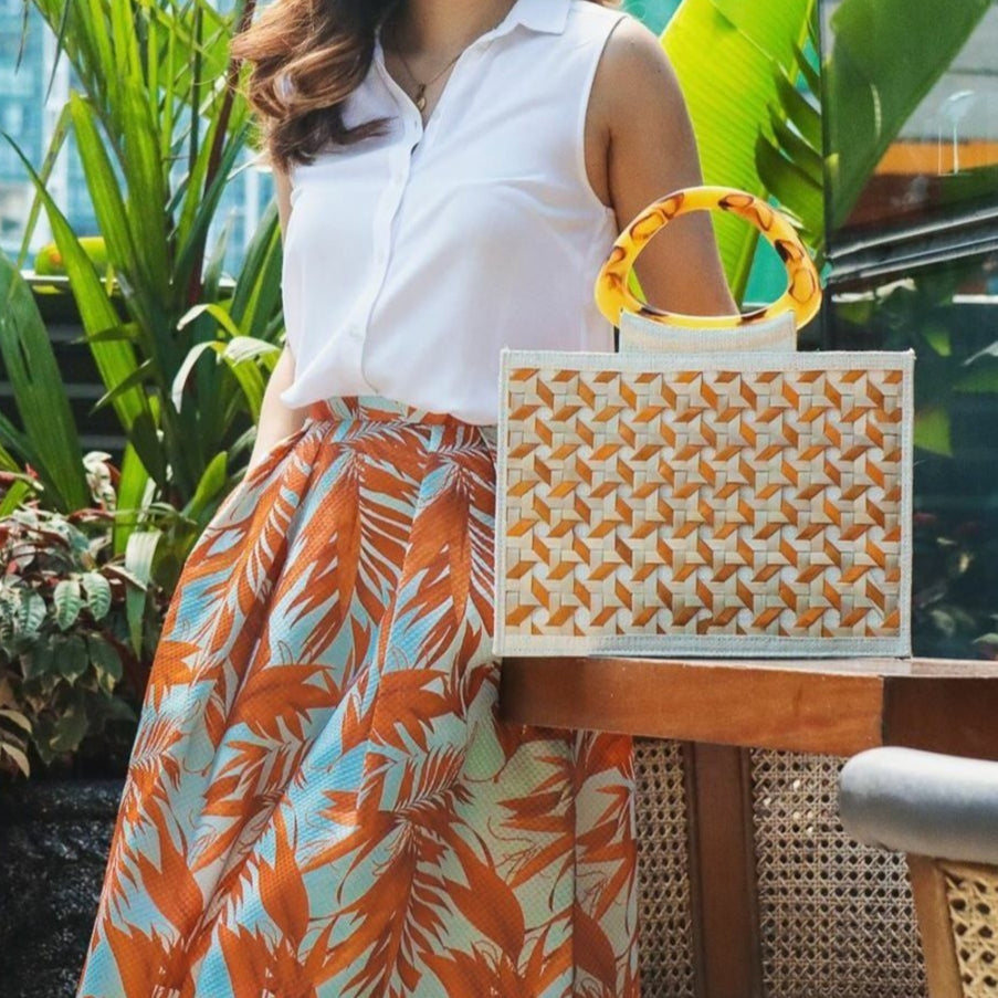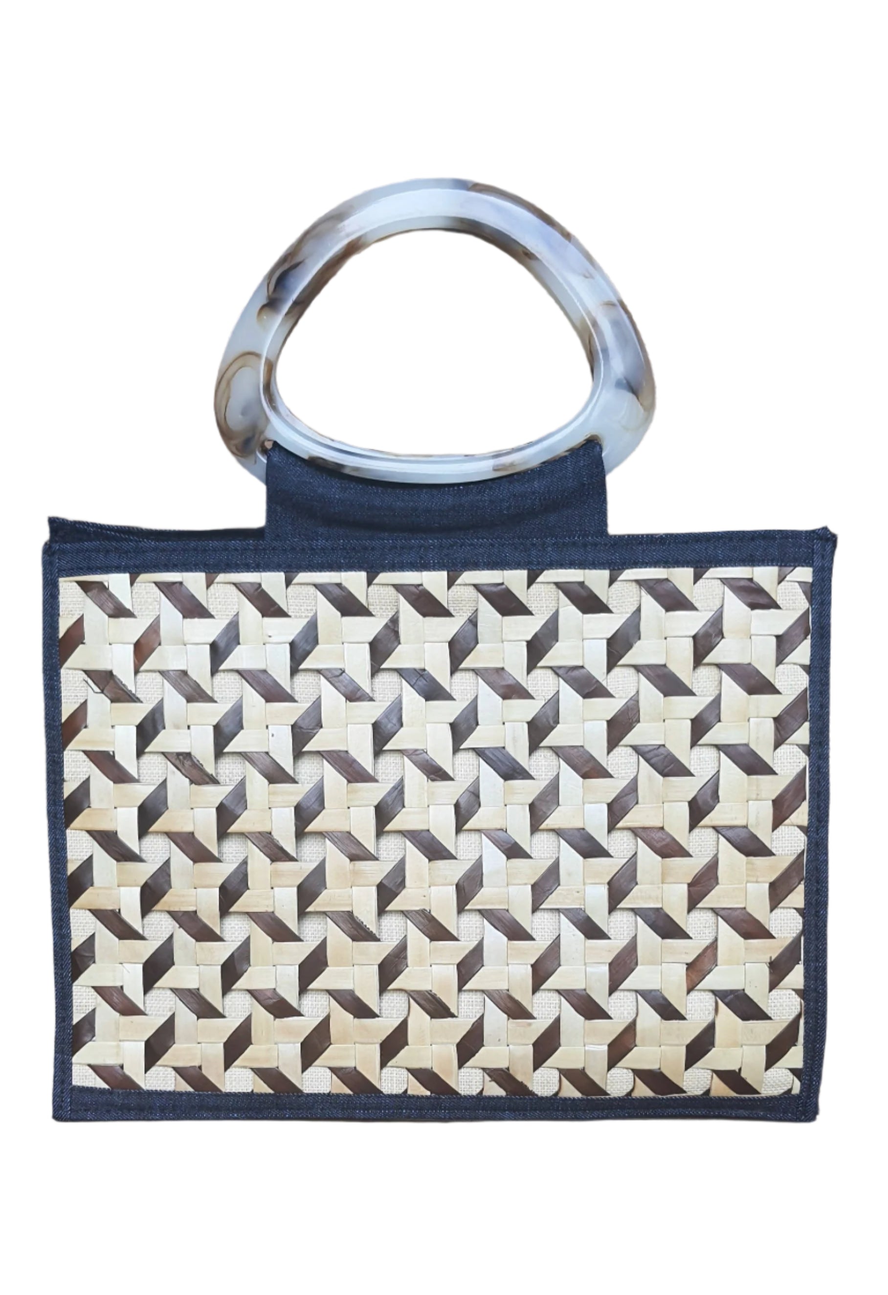 Made with Handwoven Textile, Raffia and Solihiya Patterns.  Comes in Limited Designs and Different Two Toned Variations Acrylic Handle 13” W 10” H 5.5” Depth