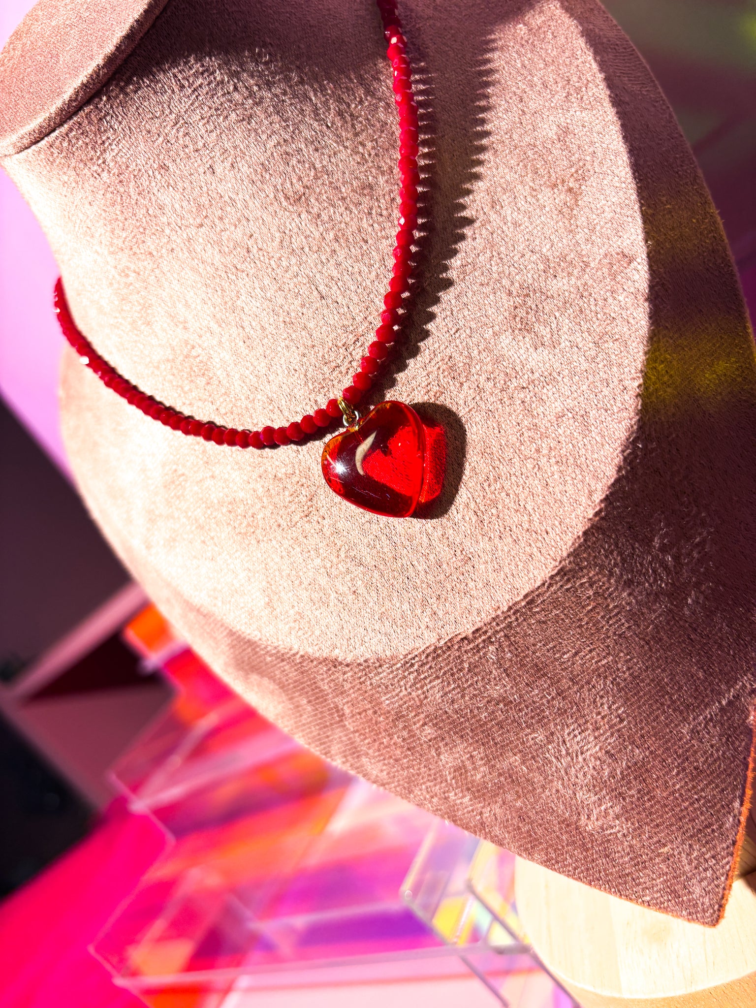 This necklace is made of a red lucite heart pendant, suspended in a dainty red ceramic crystal cord.