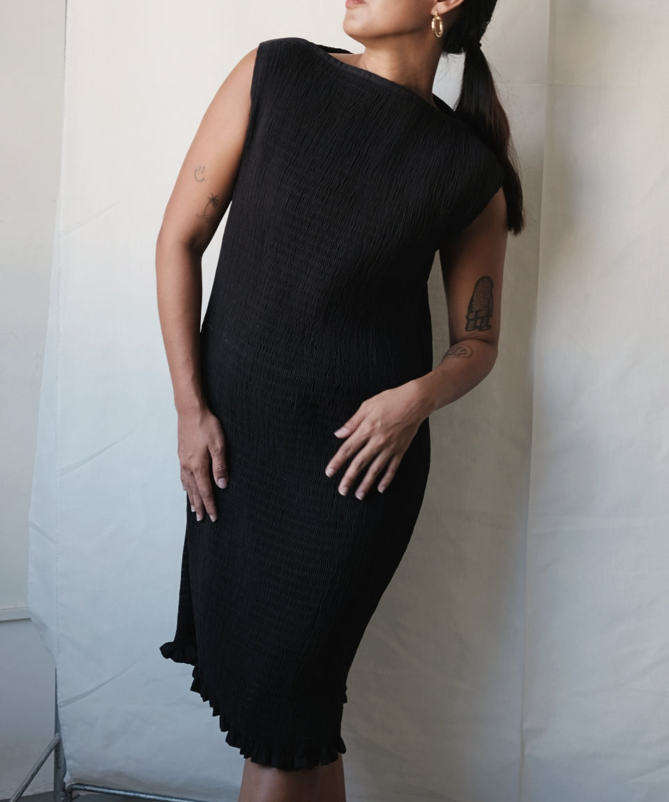 The sleek Helena Dress is sewn by finely pleating cotton linen using a meticulous hand-sewing process called smocking.
