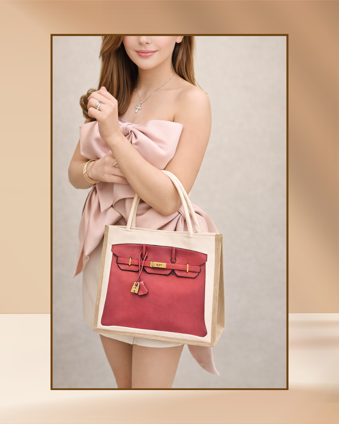 ·    Locally made and designed·    Both sides of the bag have design (front & back)·    Material: canvass and jute fiber·    Size: 32L x 13W x 22H cm·    Available in Brown and Red ·    Bag charms not included