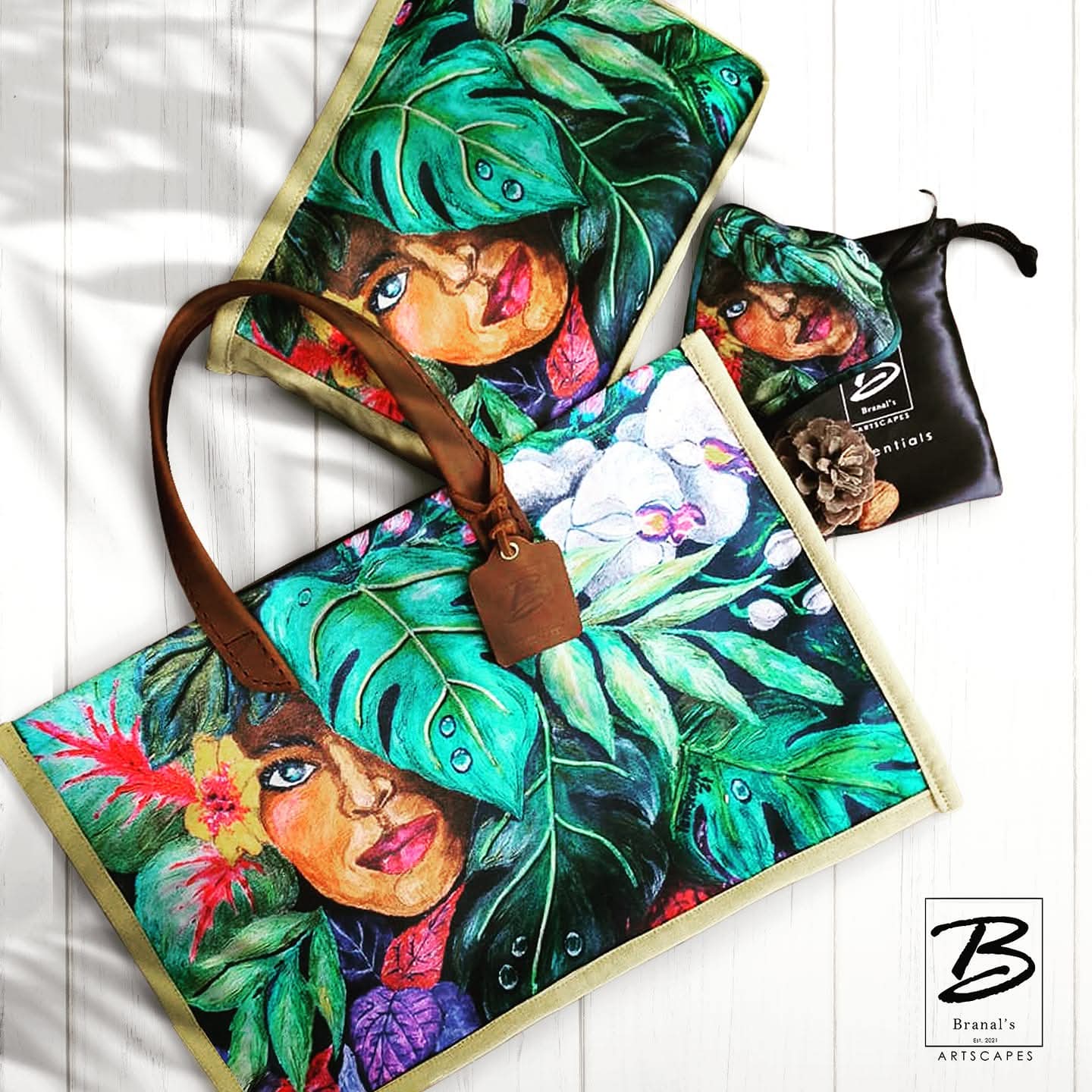 • Book tote bag (12inH x18inL x 4inS/B made of cream/beige cotton canvas with full colors sublimation print on one side, battle green satin lining, non-woven interlining fabric (pelon) at the sides, with vegetable cow leather handles by Handcrafted by Harl's. It also comes with battle green satin dust bag.