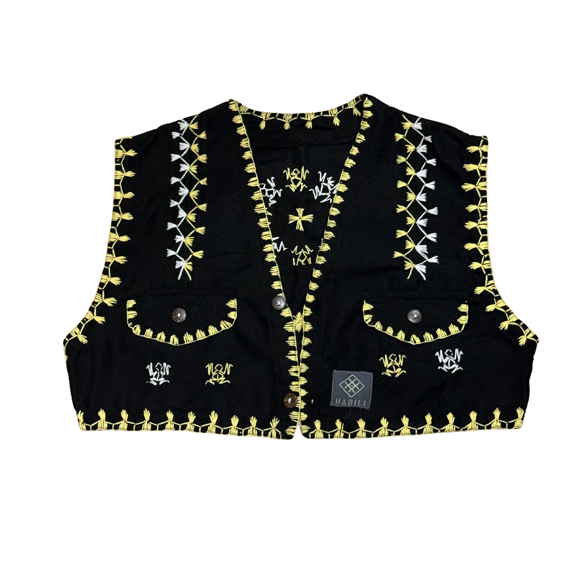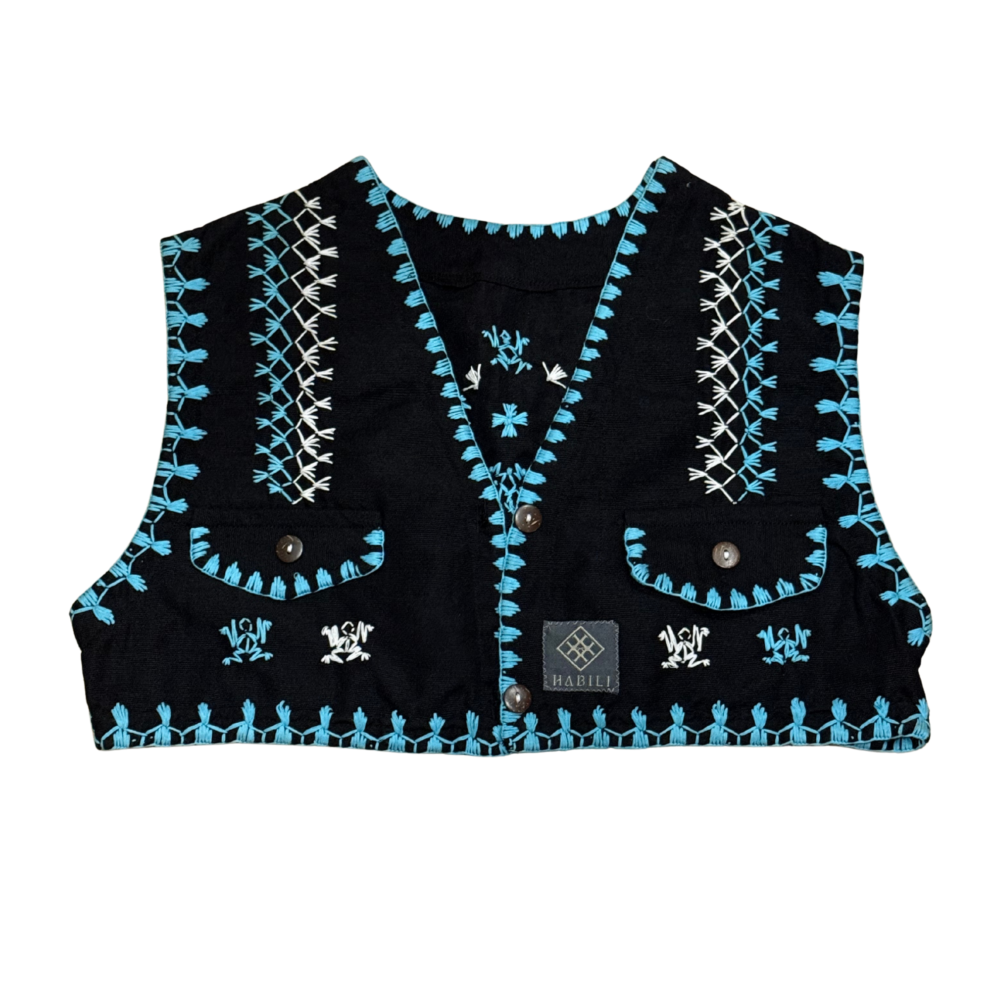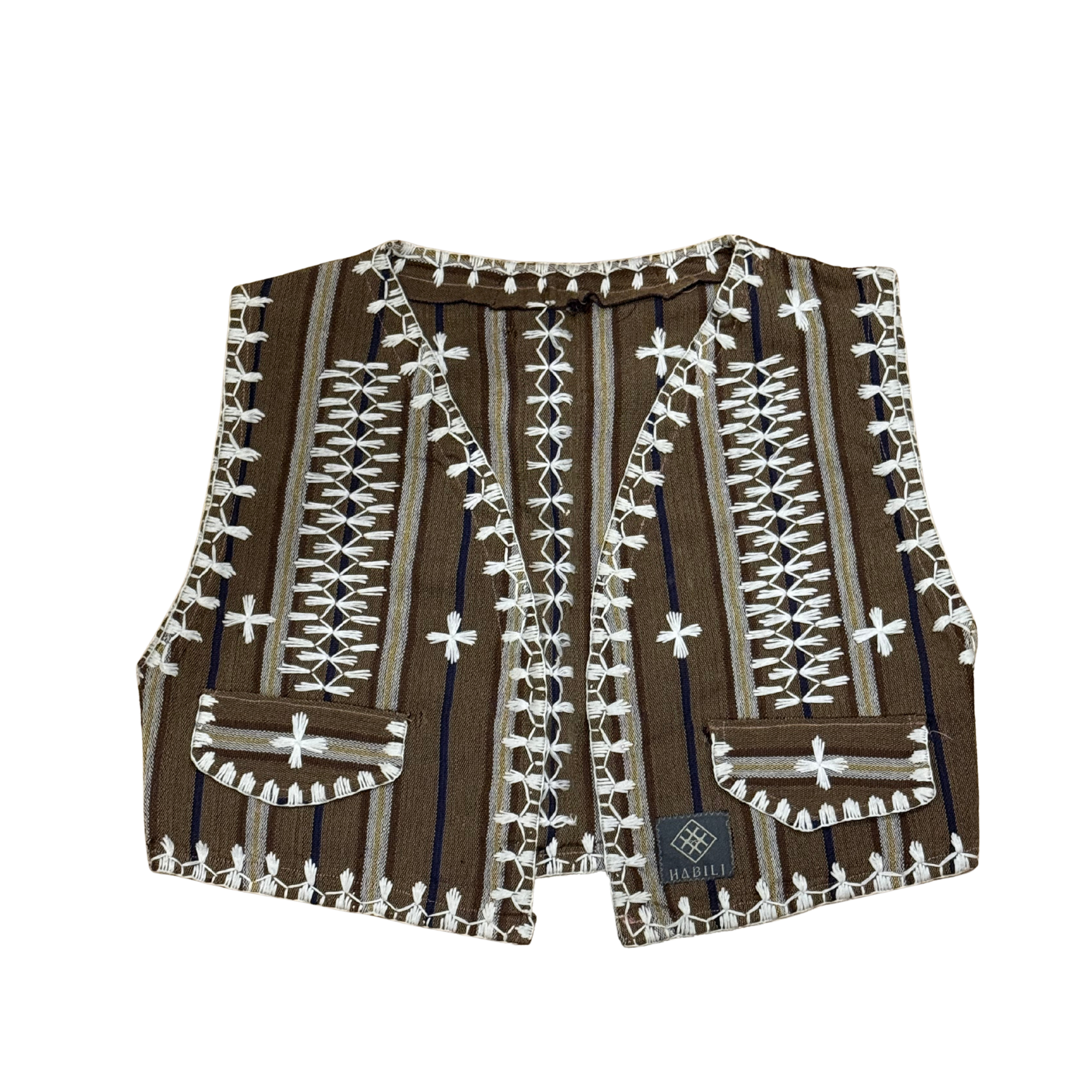 Blending tradition and modern tailoring, this vest brings cultural texture into everyday wear, perfect layered over crisp shirts or styled with relaxed silhouettes.