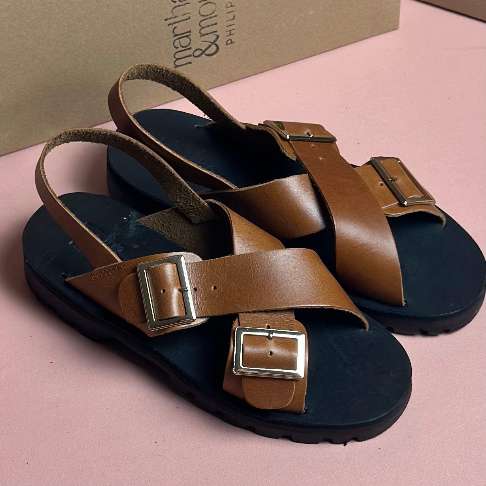"Jamie" is a platform sandals with crisscross adjustable straps and a fixed back strap; the platform height is about 1 inch. Materials used: genuine leather (straps and insole) and non-skid rubber platform soles (outer sole).
