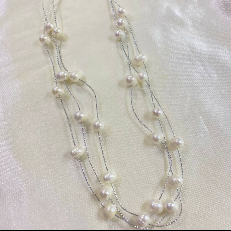 3 Layered Freshwater Pearl Necklace Material: Silver Plated Chain Length: 18-21 inches Shape: Potato Size: 8-9 mm