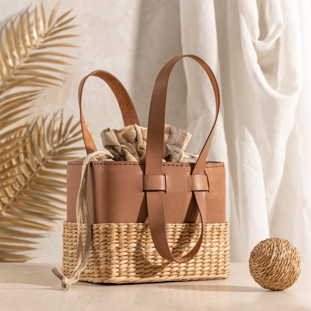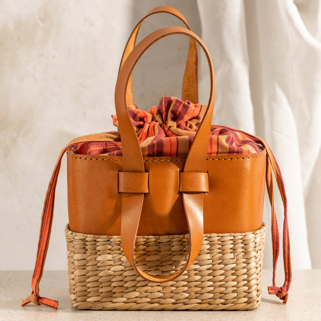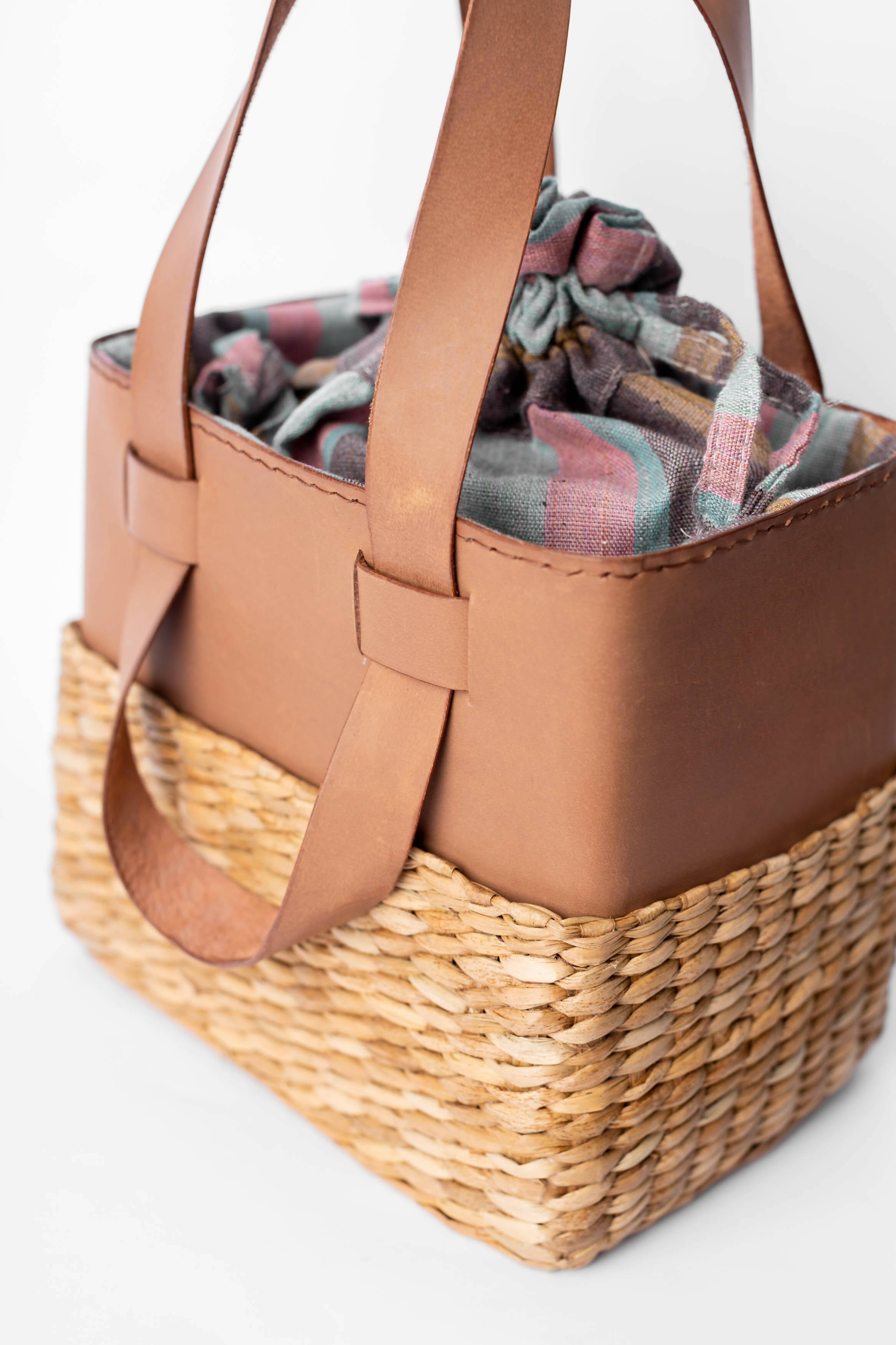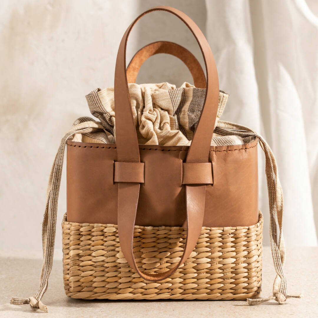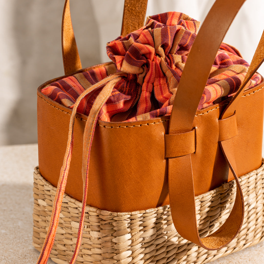 Made from vegetable-tanned leather Hand-cut and Hand-stitched Features a woven bancuan base Available in Tan & Mocha Brown Fully lined with Kantarines Fabric drawstring Length (7.5 inches) Width (5inches) Height (6.5inches) Note: This bag is painstakingly hand-cut and hand-stitched by our women leather artisans. In collaboration with our basket weaving communities in Bicol, we aim to create pieces that display Filipino ingenuity. It normally takes 3-4 hours to complete this bag.For every purchase, you would not only be able to financially support the family of our artisans but you would also aid in empowering them as an individual and as a community.