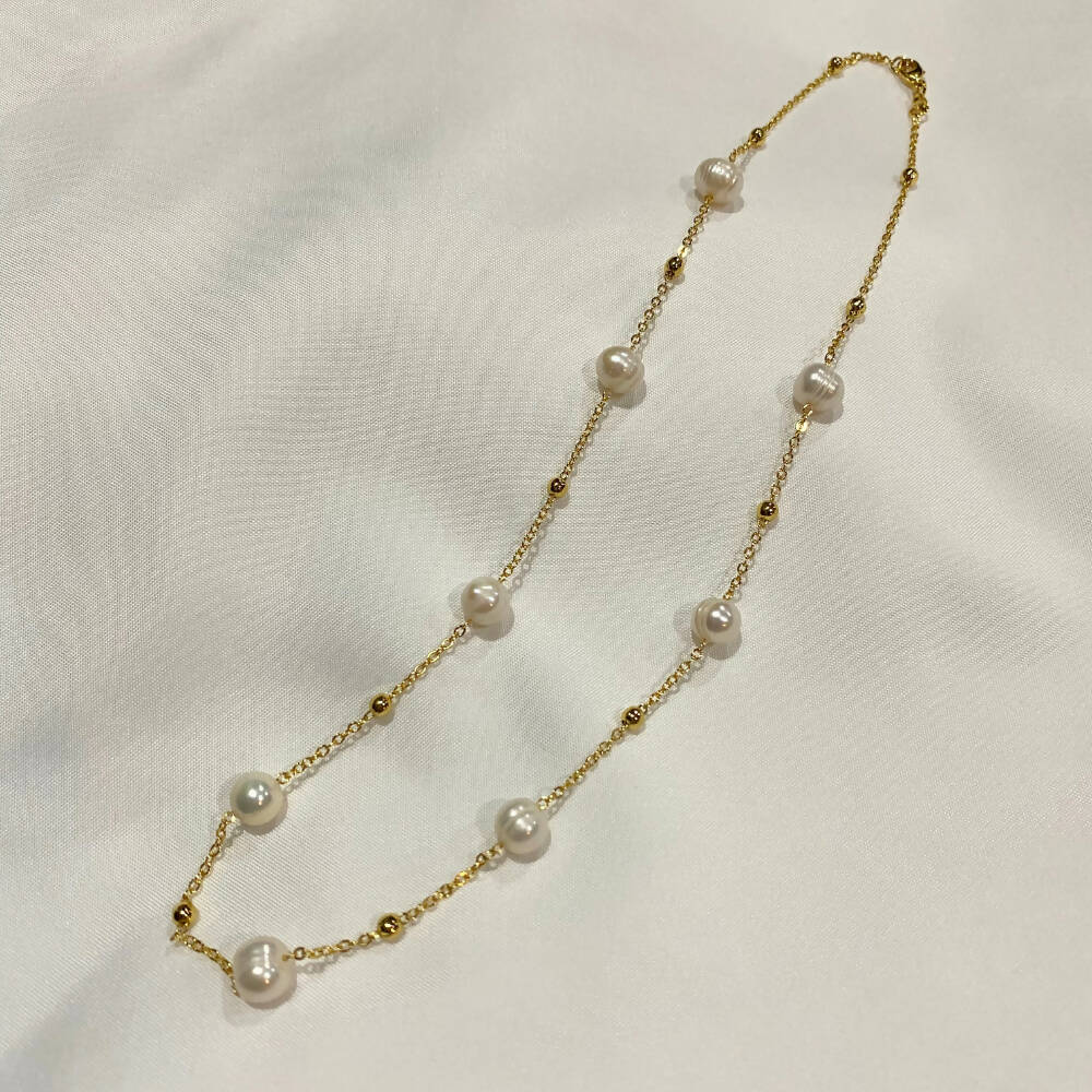Freshwater Pearl Necklace Material: Gold Plated Lock and Chain Length: 18 inches Shape: Potato Size: 8-9 mm Spacer: Gold Plated Balls