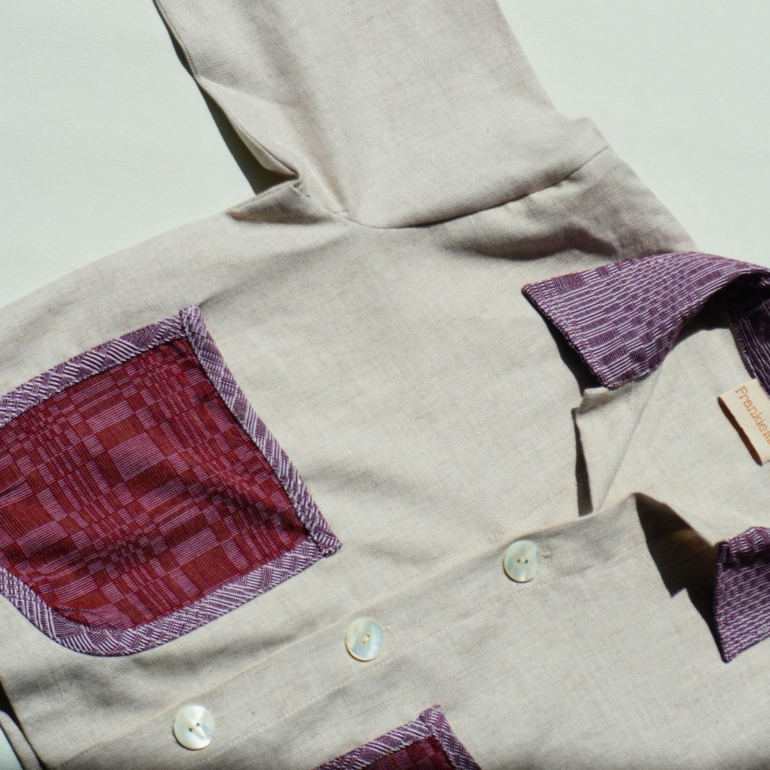 Oversized jacket made from deadstock linen (Cream) and a cotton-linen (Navy) fabric with Binakol pocket and collar accents handwoven in Abra and large pearlescent buttons