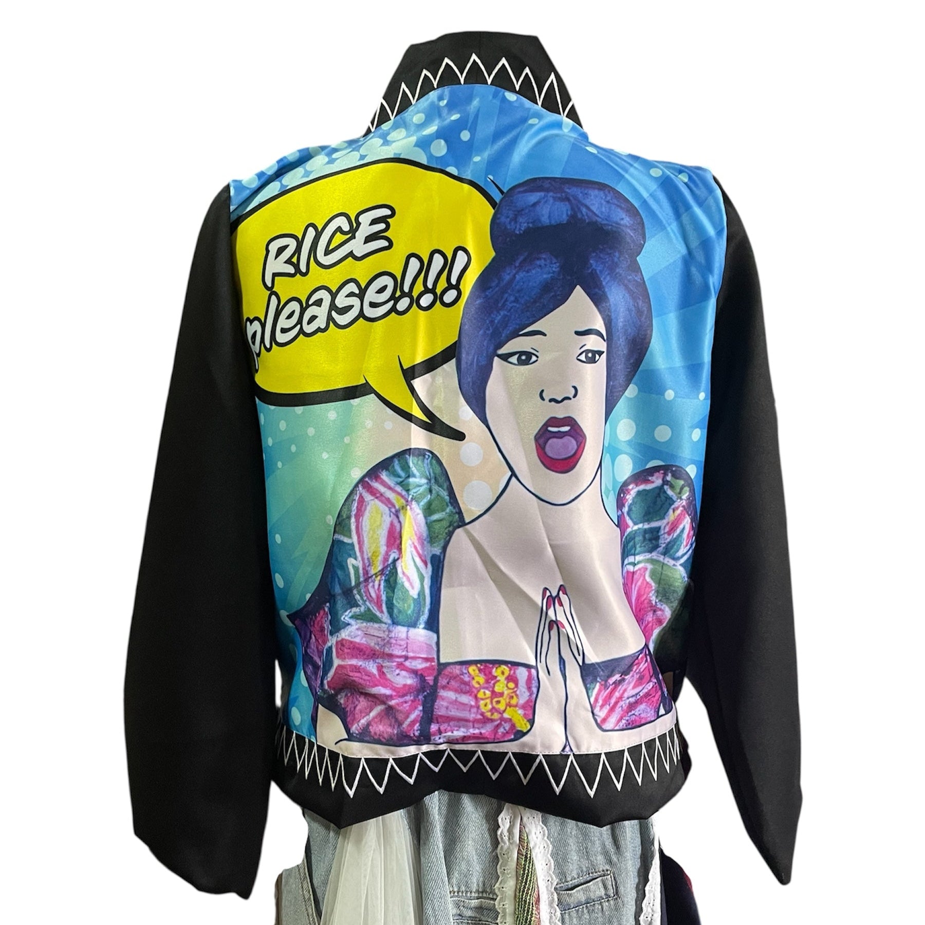 K1 Rice Please, short kimono with original PGotangco art in pop art genre. Binakol front panels