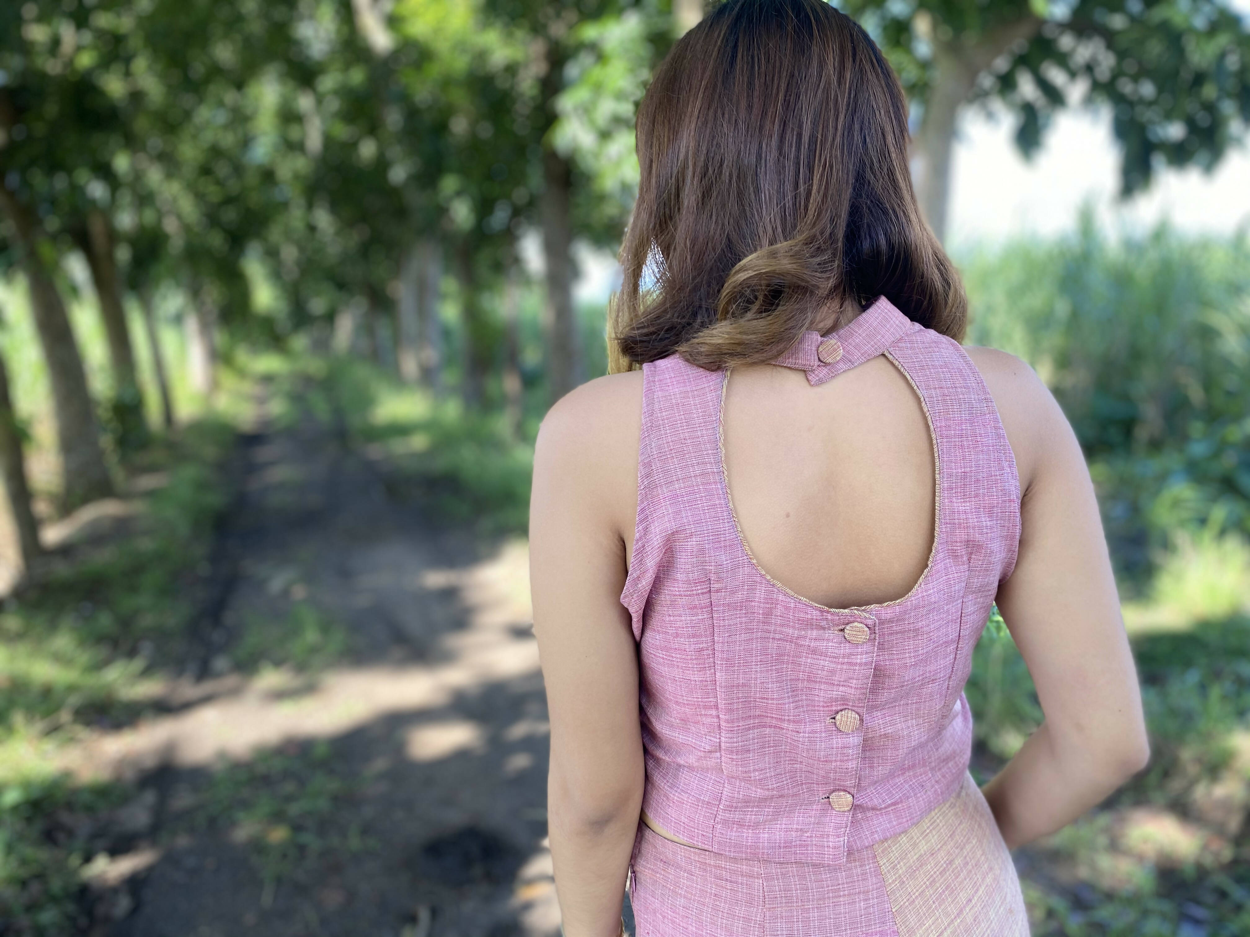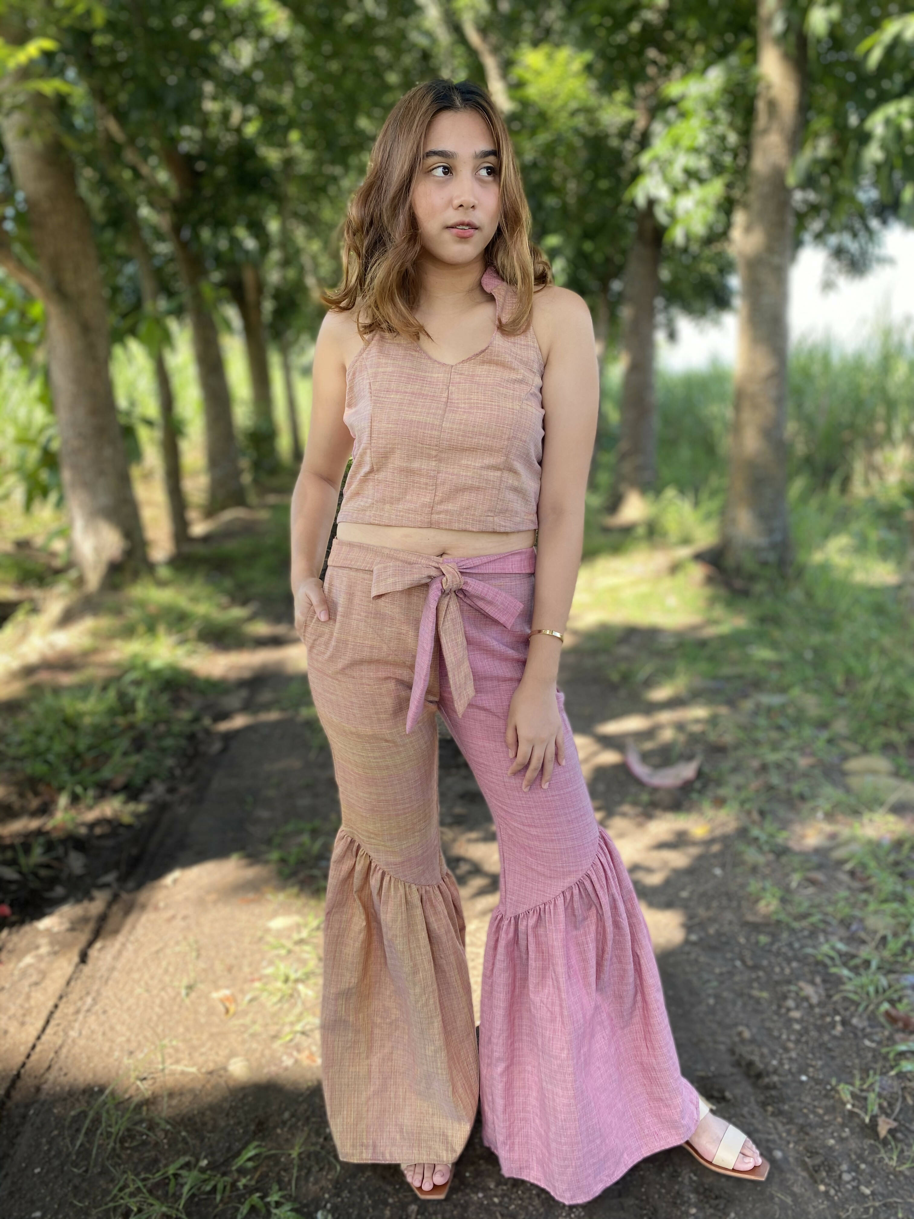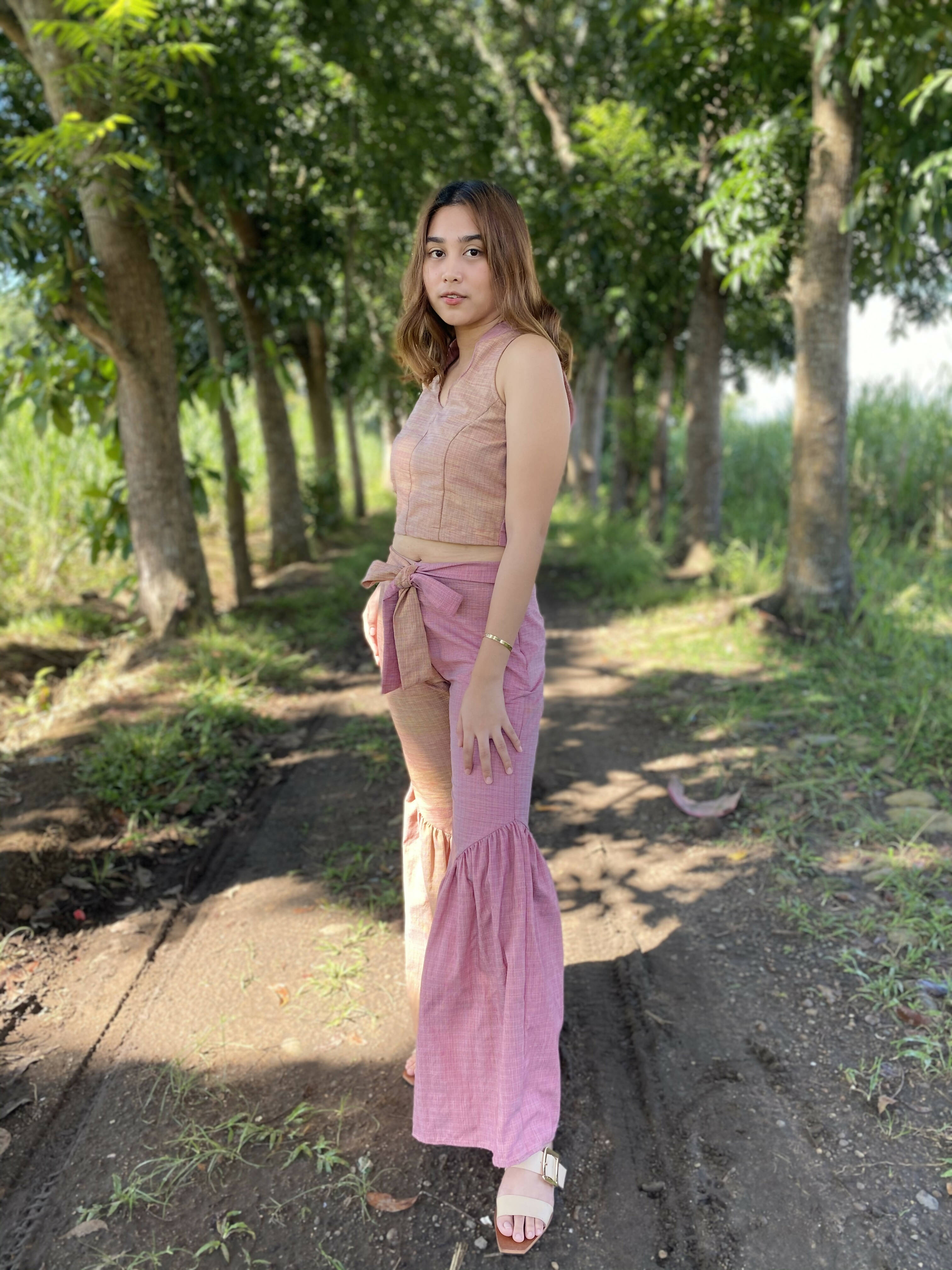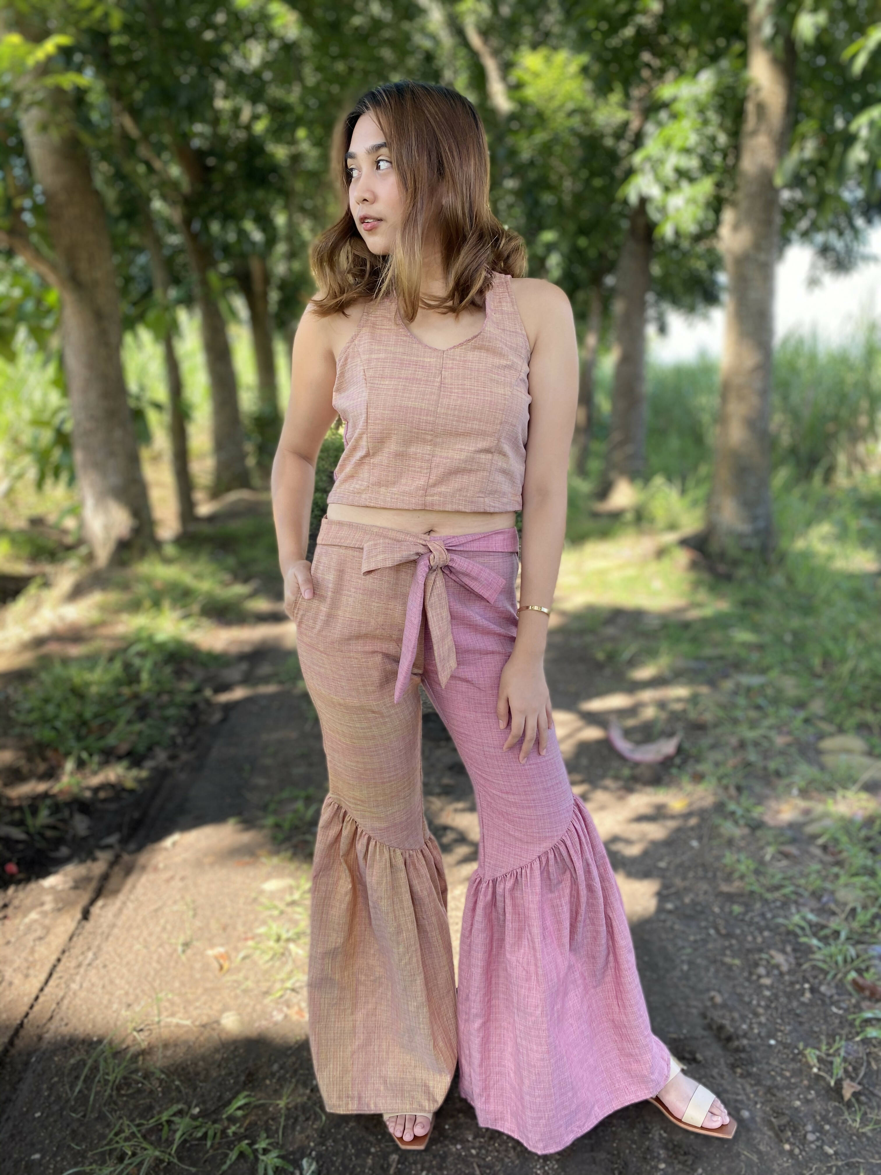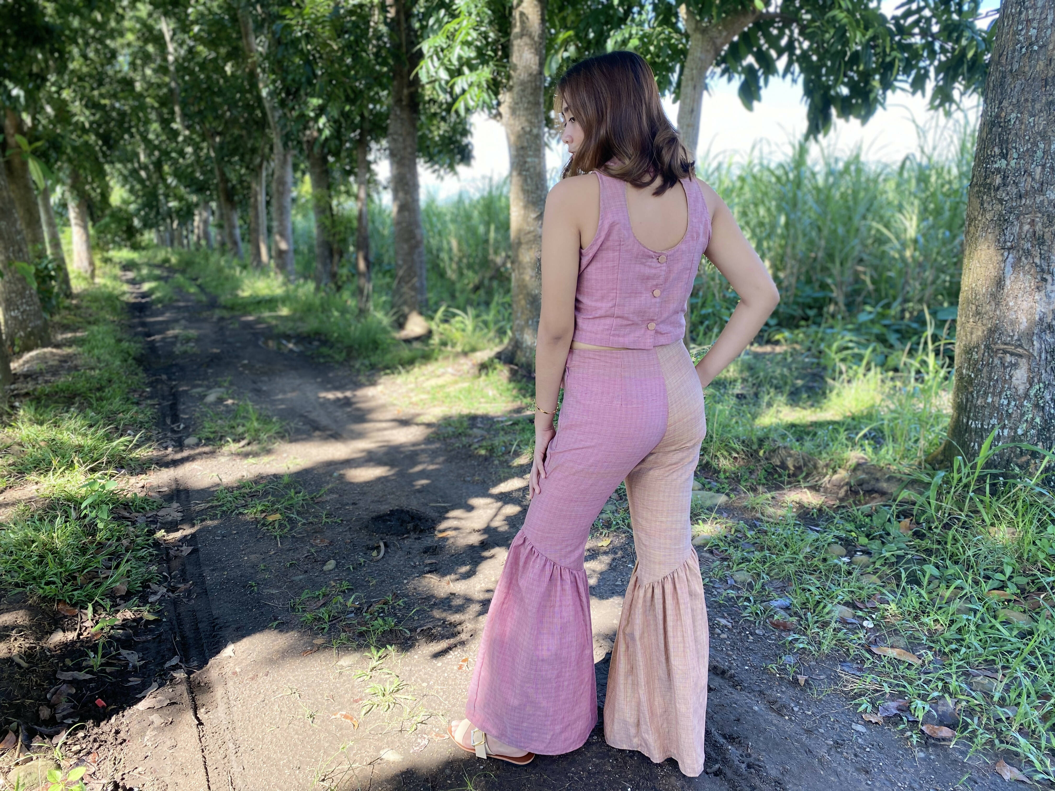 Kara's statement, this stylish pair is handwoven by Negros Island Weavers and designed by Vida Hayes. This pretty trouser features an intricate shirring cut using upcycled thread and matches the scoop top design,  this look is such a statement. The colors may vary since the threads used for this weaving are upcycled.  Model wearing - size M 350 g  100% handwoven Weaving is Hablon upcycled thread Polycotton Side zip Hand wash cold & mild detergent Dry in the shade Use warm iron Made in Negros, Philippines