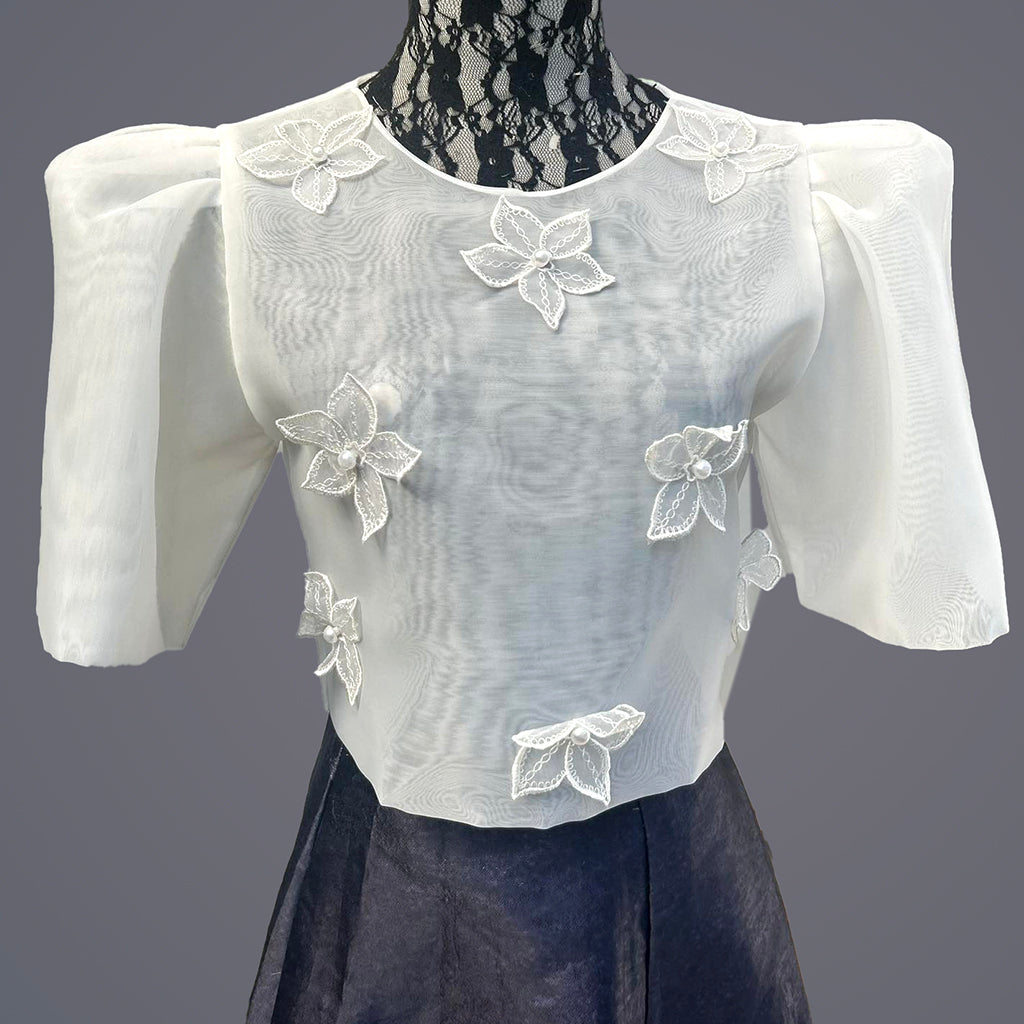 ALAINA Kimona by Filipiniana GownsKIMONA BLOUSEalso known as the top part of Filipiniana Terno attire that embodies elegance of our cultural heritage. It is characterized by its loose-fitting, short-sleeved blouse that is typically made from lightweight and colorful fabrics and flowing silhouette. Its butterfly sleeves are wide and voluminous, extending from the shoulder to the forearm, creating a distinctive and graceful appearance. Fabric: Cotton with flower patchColor: Off-white