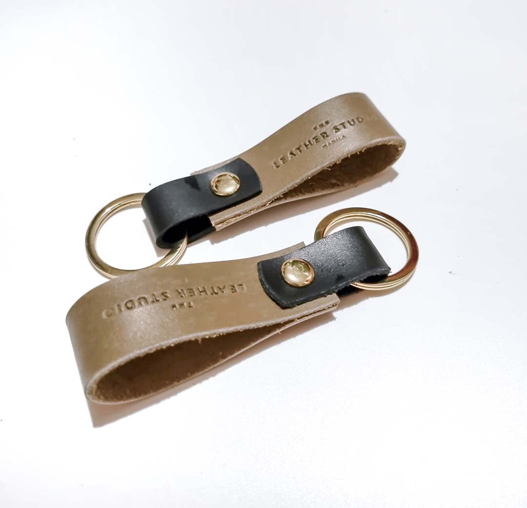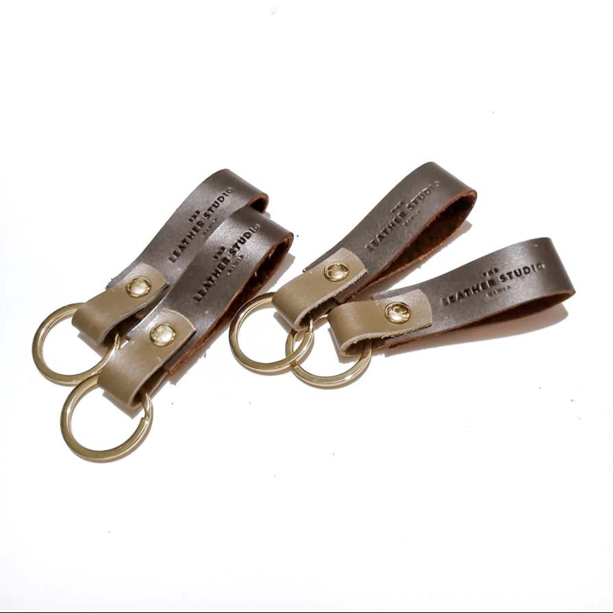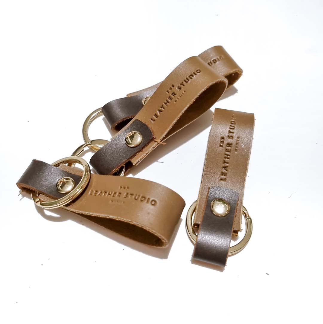 100% Cowhide Leather Hand-cut and hand-stitched Held together by a rivet and a key ring on the other end Dimensions: W-.75 inches L-3.25 inches