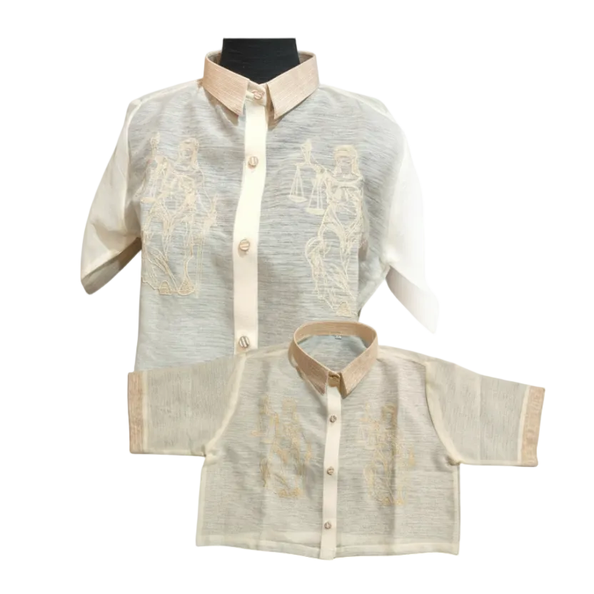 Kandama crop barong featuring Lady Justice embroidery, rendered in delicate line-art stitching on a sheer jusilyn body. Designed with a structured contrast collar and sleeve edges made from handwoven fabric sourced from Abra, the piece blends indigenous craftsmanship with a modern boxy cropped silhouette. Light, breathable, and symbolic, it is a contemporary expression of Filipino heritage—crafted for those who wear culture with intention.