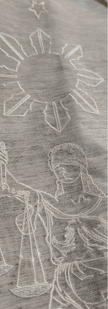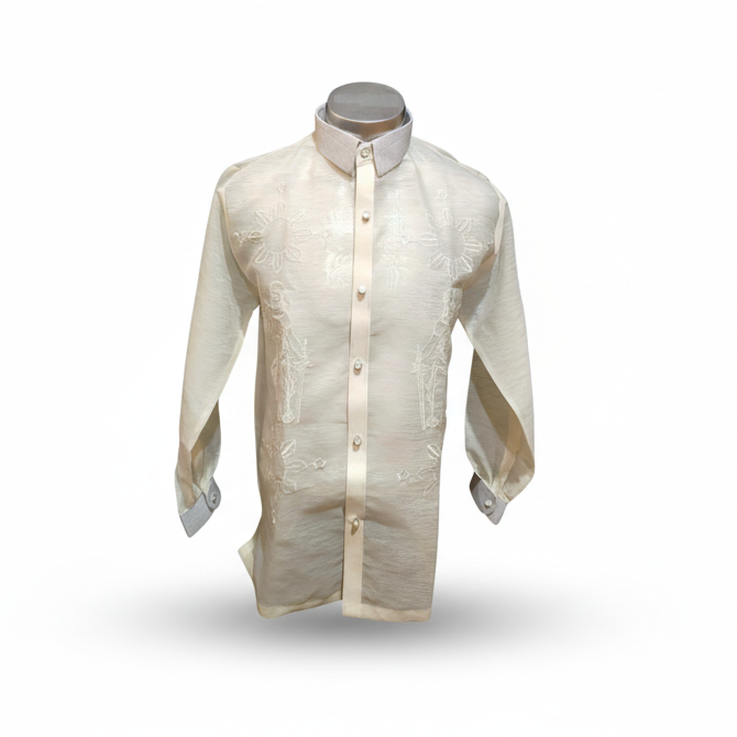 This Kandama long-sleeve barong features refined Lady Justice embroidery delicately rendered in tonal line-art across a sheer jusilyn body, symbolizing balance, integrity, and quiet strength. Designed with a clean front placket and tailored silhouette, it is elevated by handwoven fabrics from Abra used on the collar and cuffs—bringing indigenous craftsmanship into a contemporary formal piece. Light, breathable, and thoughtfully detailed, this barong offers a modern expression of Filipino heritage suited for ceremonial occasions, professional settings, and meaningful celebrations.