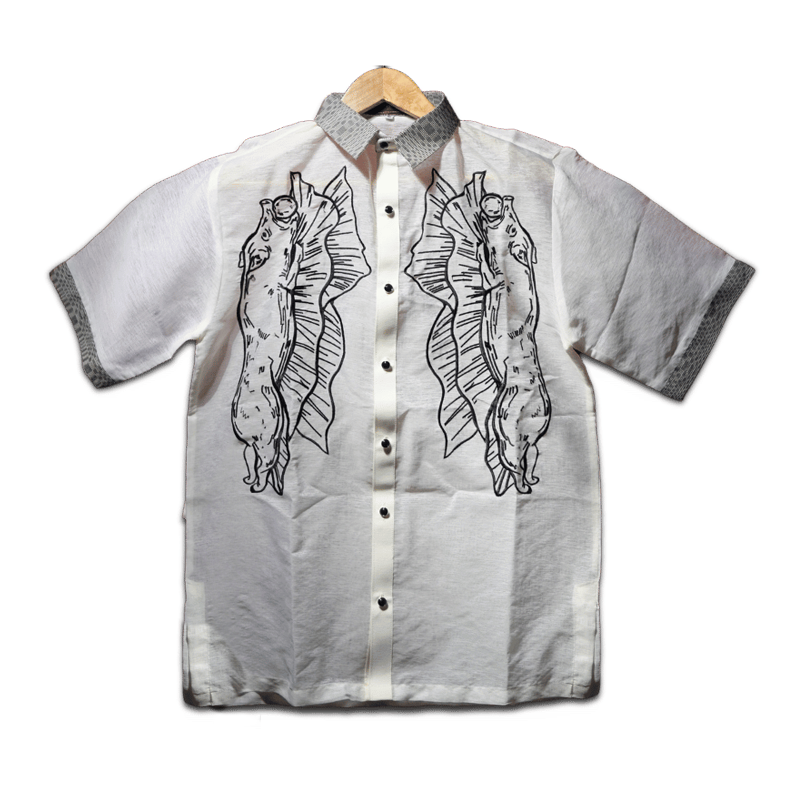 White jusi-piña barong with grey woven accents and embroidered lechon