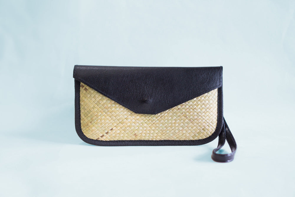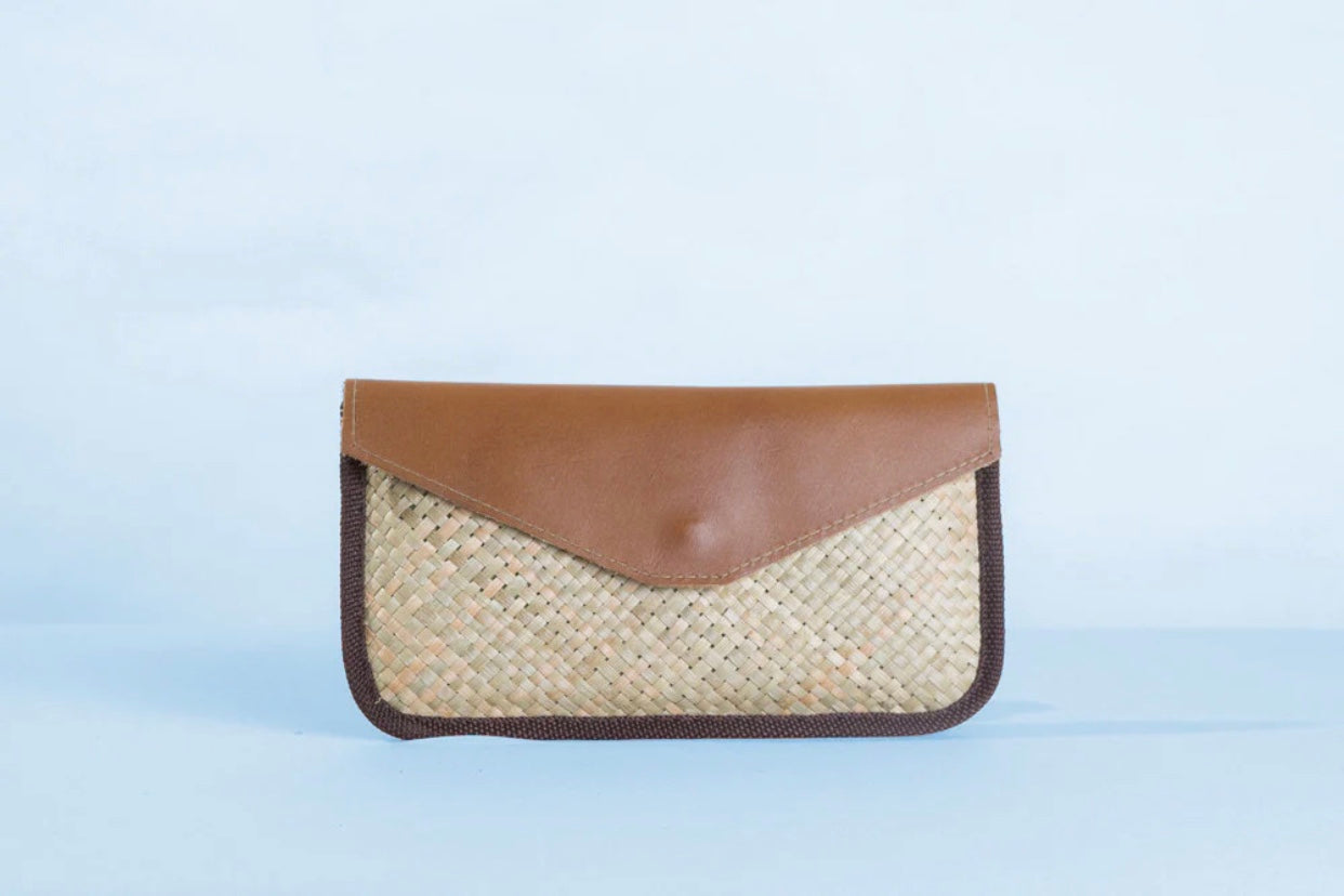 Keep your smartphone and money safe with this small but sleek Liham sleeve. Handwoven banig Flap made out of genuine local leather Magnetic snap Interior padded with foam; compartment for storing money Rear pocket for coins and other small items Available in one size: 11 cm x 21 cm