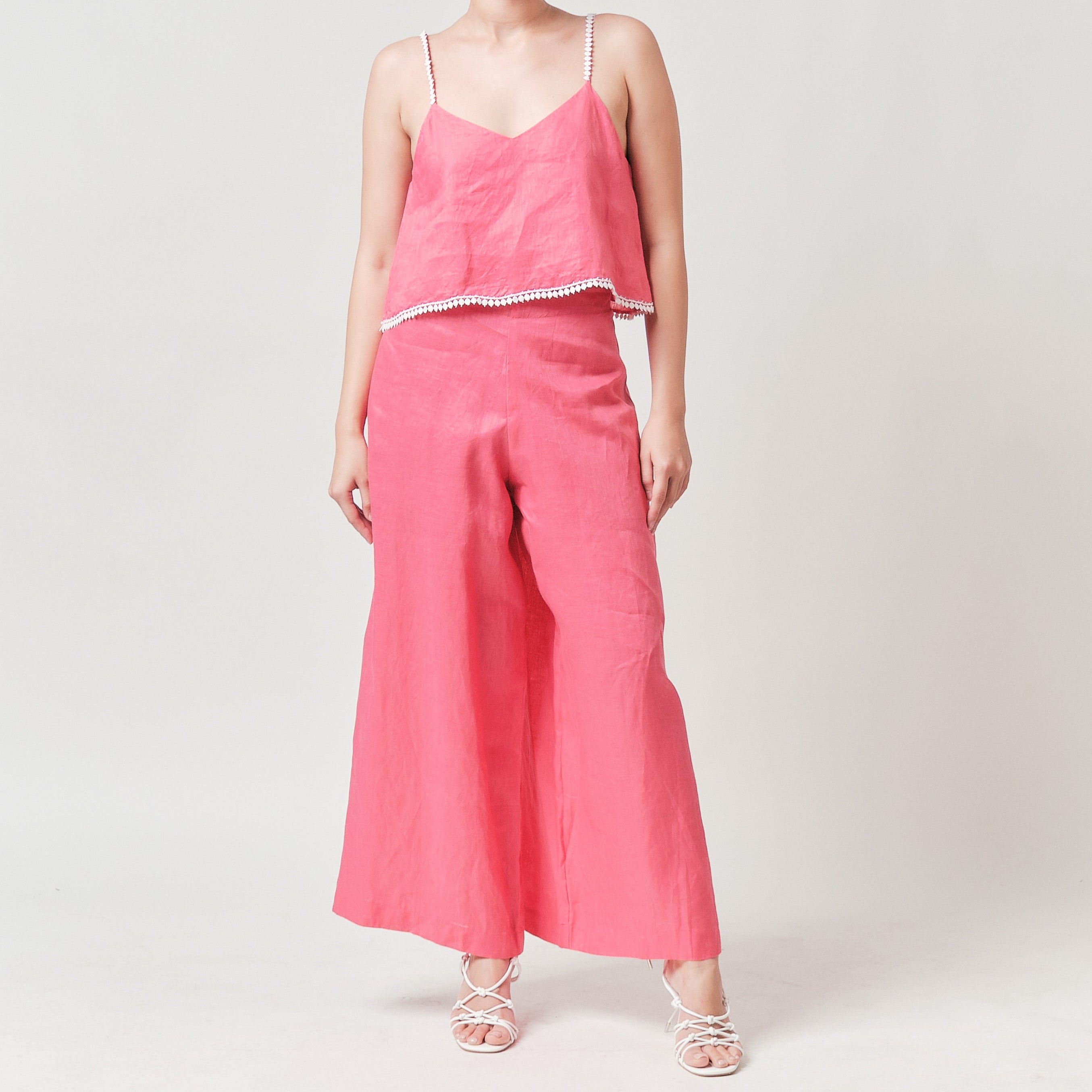 This combo is a dream ! A pretty top with white embellished details on the straps  and wide legged gartered pants. So many occasions and places to wear this set ! Limited pieces