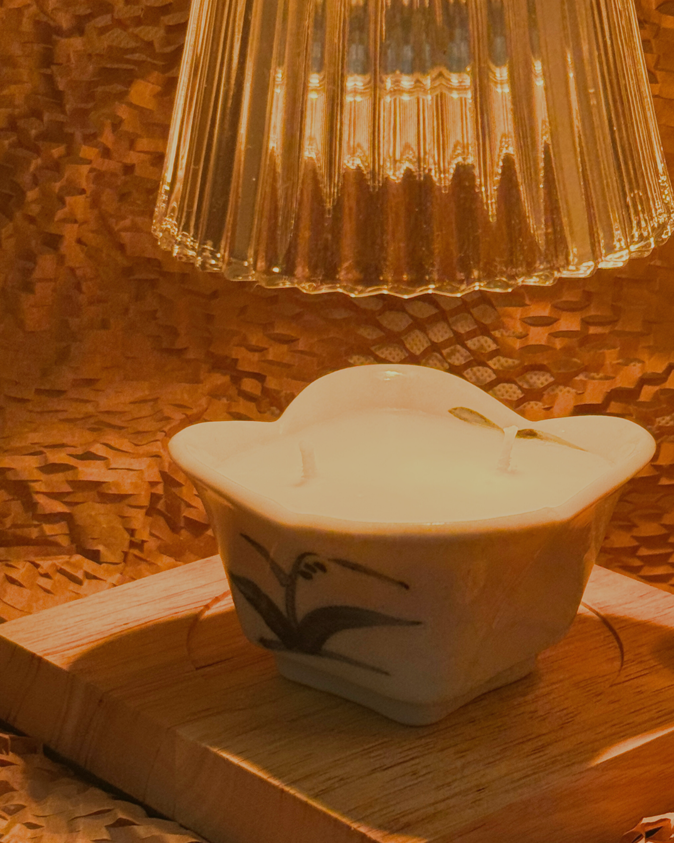 • Hand-poured soy candle in a small square ceramic teacup with pink tones and a lily design