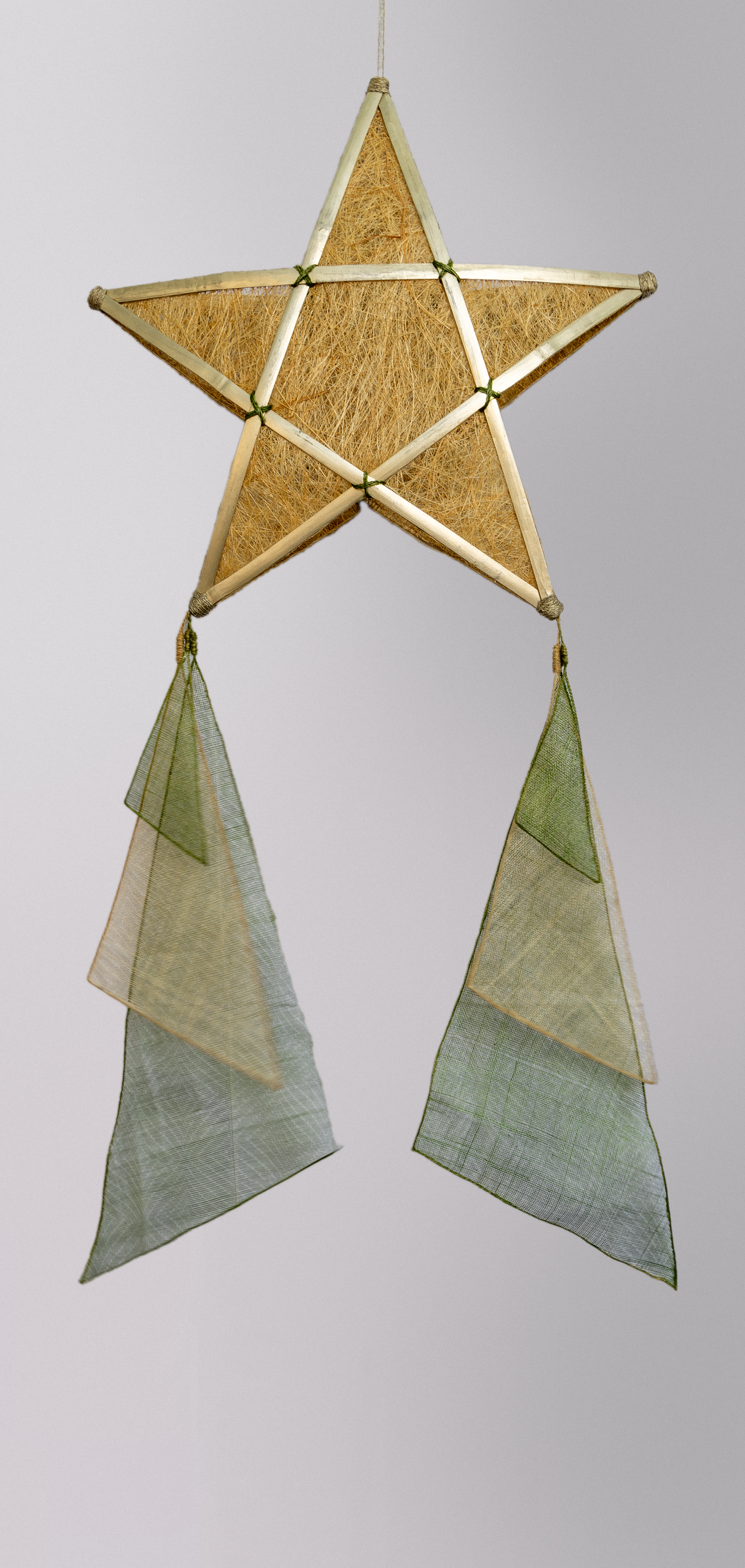 Seemingly fragile, but actually amazingly strong, abaca  woven as sinamay or gumon  is used to expose the structural bamboo frame.  In a reference to embroidery, at the five crossing-points of the star, abaca twine lashes the bamboo together, forming crosses, alluding to the destiny of the holy child.