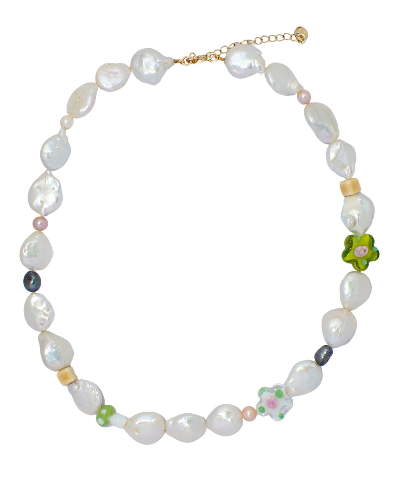 Strung with natural long coin freshwater pearls sourced from ethical farms across Asia, including the Philippines. Accented with Kyoto pearls, black pearls, and artisan-crafted ceramic beads in neutral tones. Finished with a gold-toned clasp and adjustable extension chain for an easy, elegant fit.