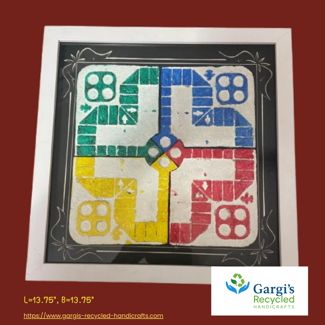 Brighten up your space with the Ludo Wall Art – Recycled Paper Edition, a nostalgic and eco-friendly tribute to one of the most loved childhood games. Handcrafted entirely from shredded paper, this vibrant square wall piece (13.75" x 13.75") showcases a complete Ludo board in bold primary colors, red, yellow, blue, and orange, bringing a playful charm to any room.Its sustainable craftsmanship and cheerful design make it an ideal décor choice for kids’ rooms, play areas, activity corners, or even children's cafés and food joints. More than just wall art, it’s a creative celebration of fun, sustainability, and timeless memories.