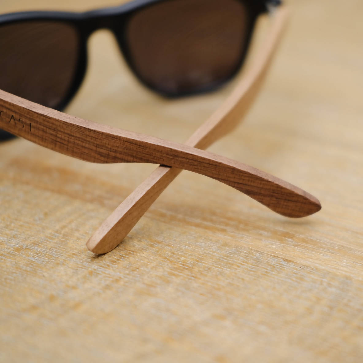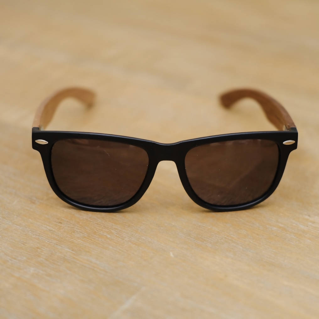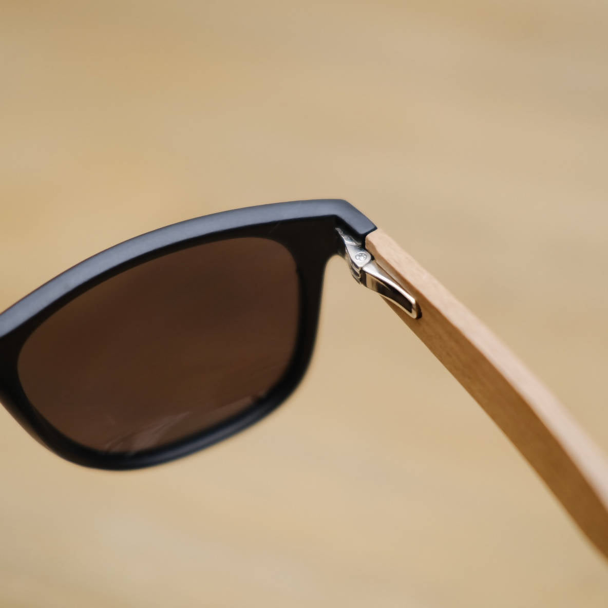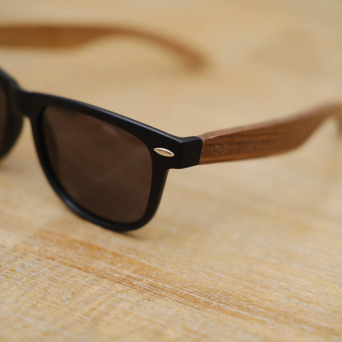 Sustainable wooden square sunglasses. • Made with sustainably sourced wood temples• Polycarbonate frames with matte finish• Saddle bridge• Metal spring hinges • Smoke black polarized lenses with maximum UV protection Lens - 55 mm | Bridge - 20 mm | Temple - 145 mm