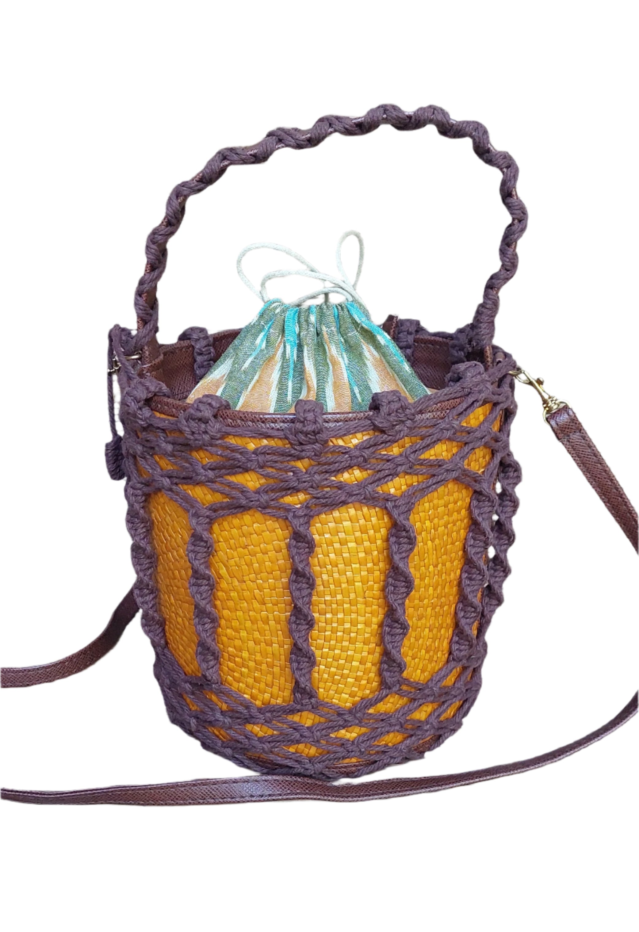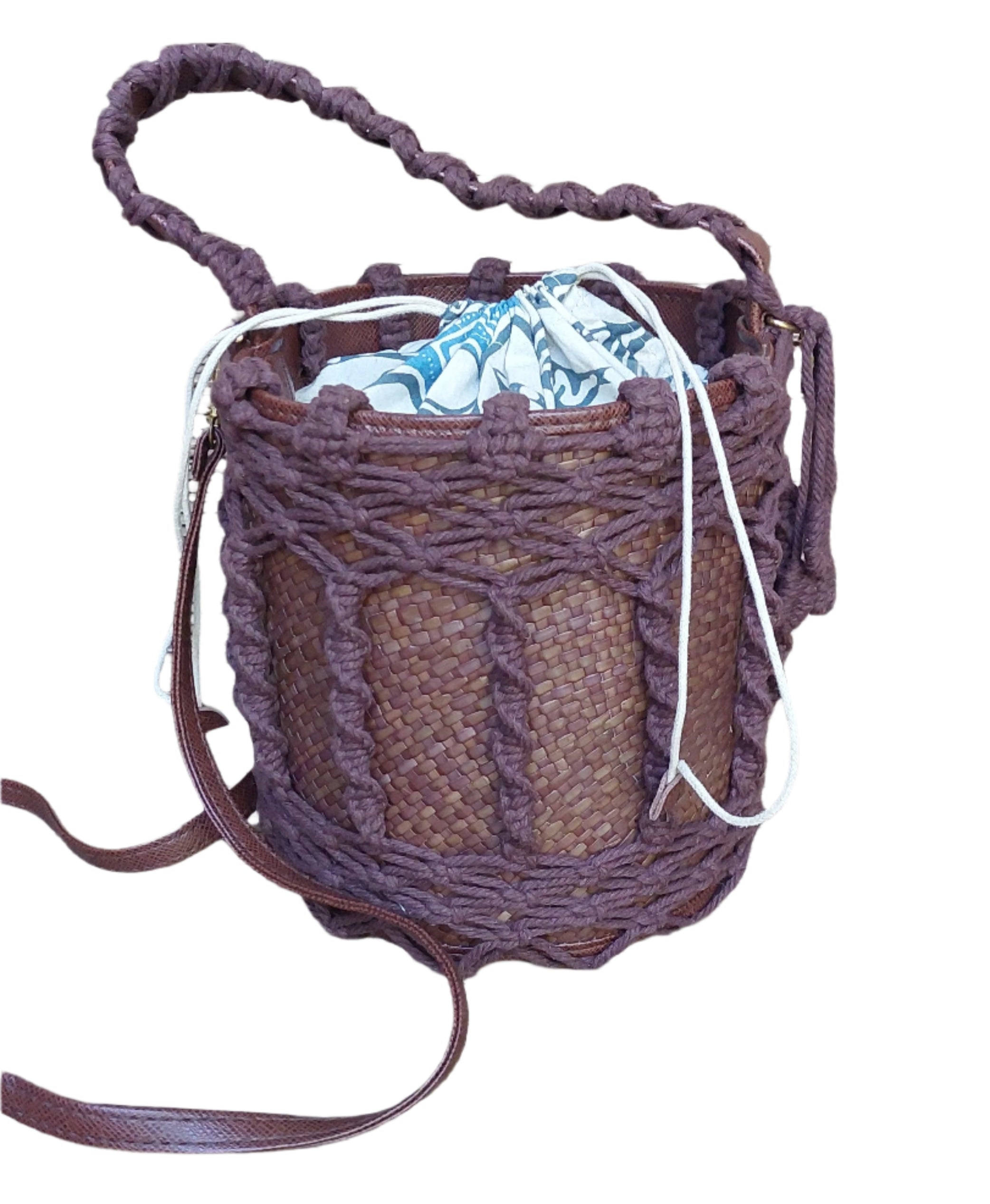 Bucket sling made out of sabutan wrapped in handwoven macrame.   Comes with Indonesian batik lining