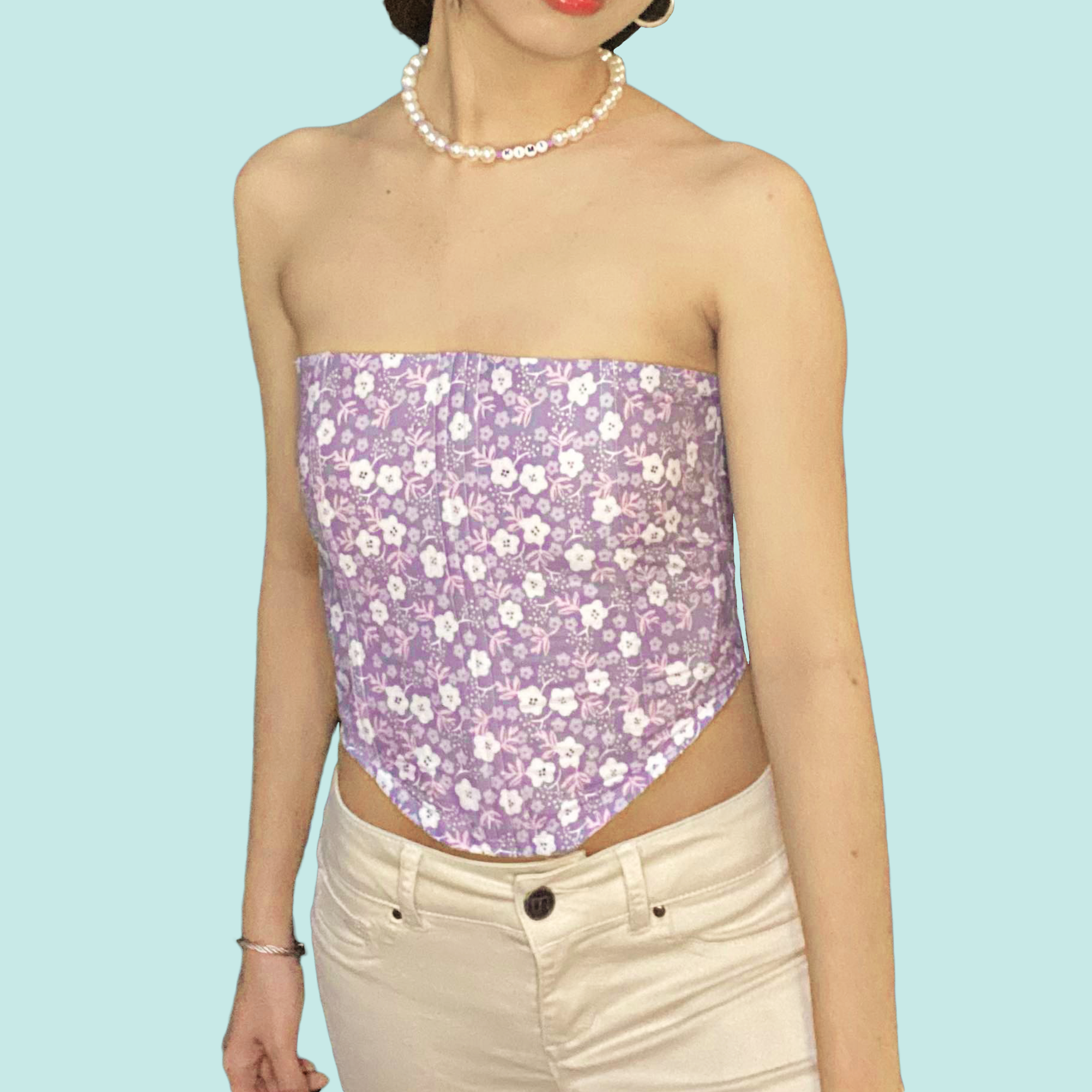 Printed cotton material, white poplin cotton lining, polyester boning, buttonhole closure with lacing.