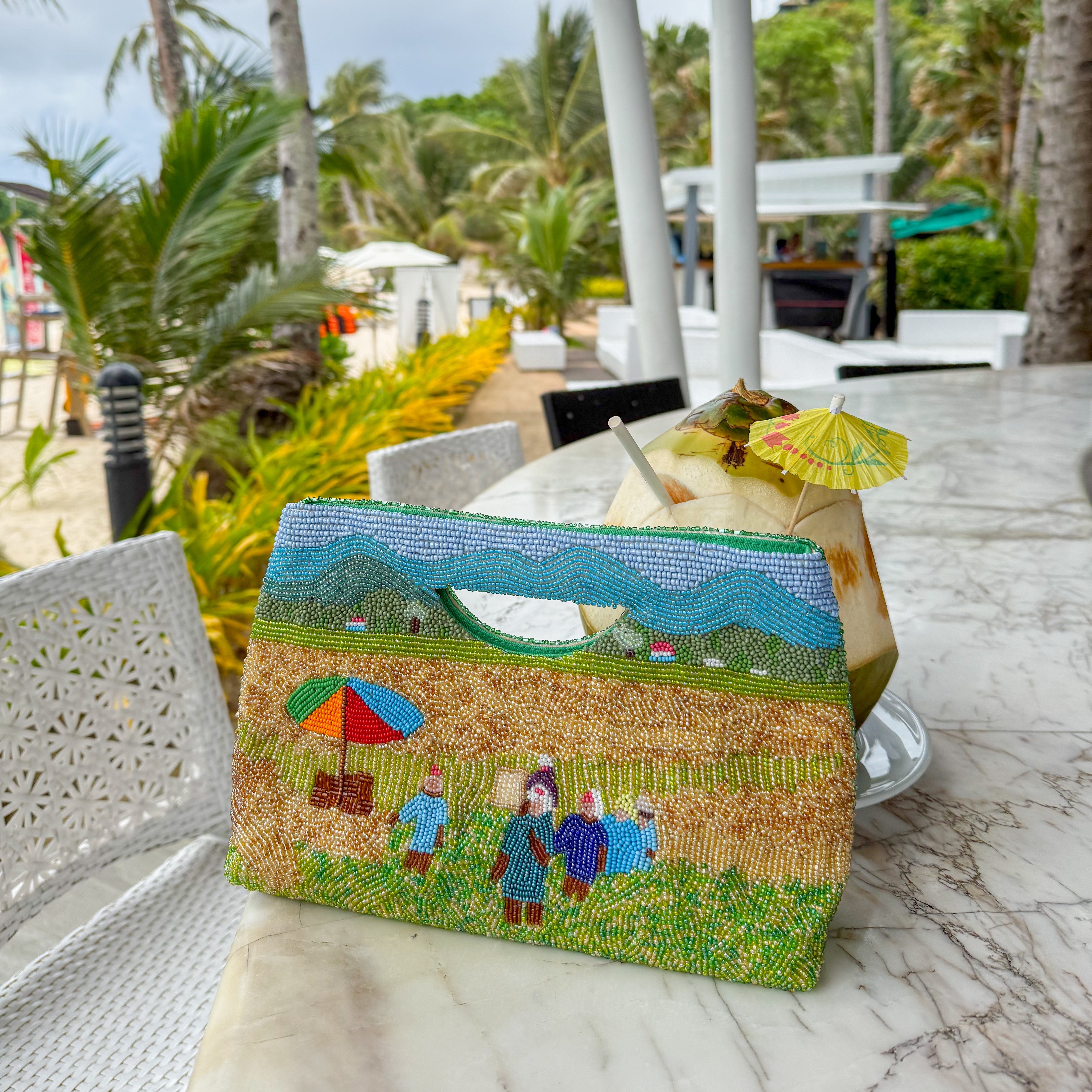 Handmade with recycled beads and cloth, this design features a 105cm removable coated iron chain for easy, hands-free use.