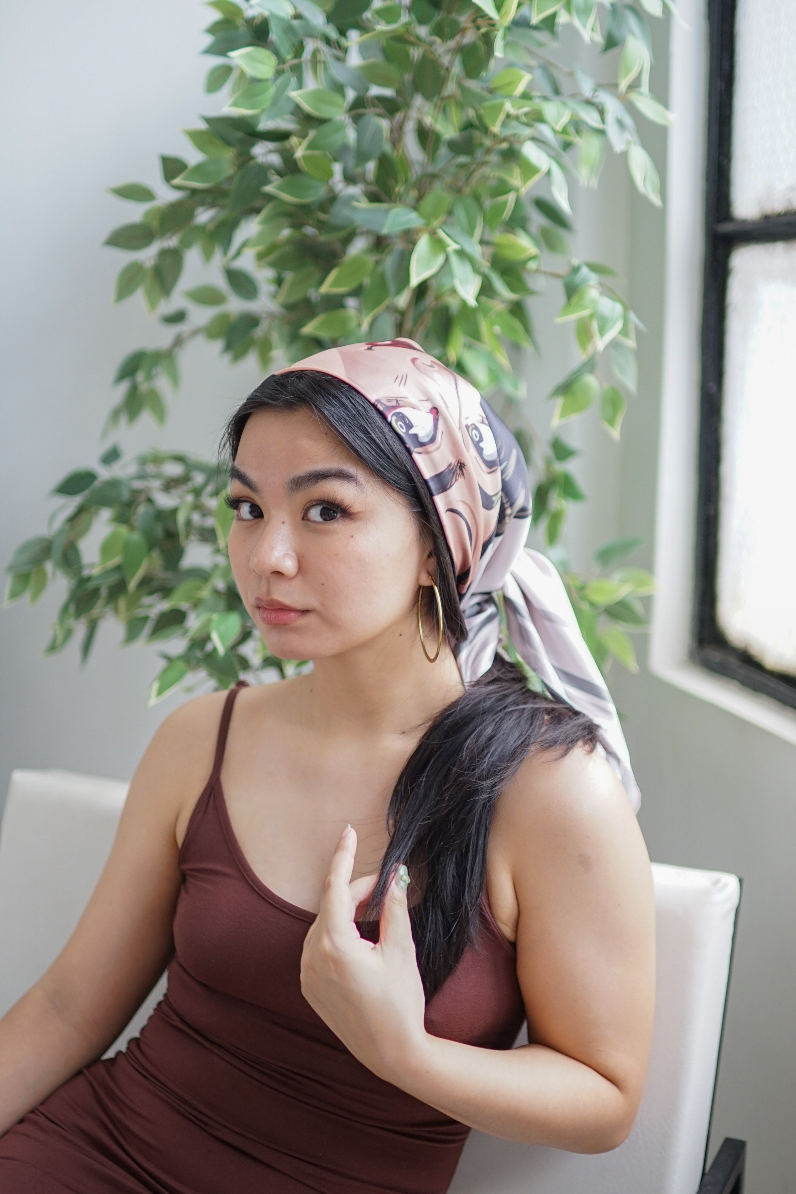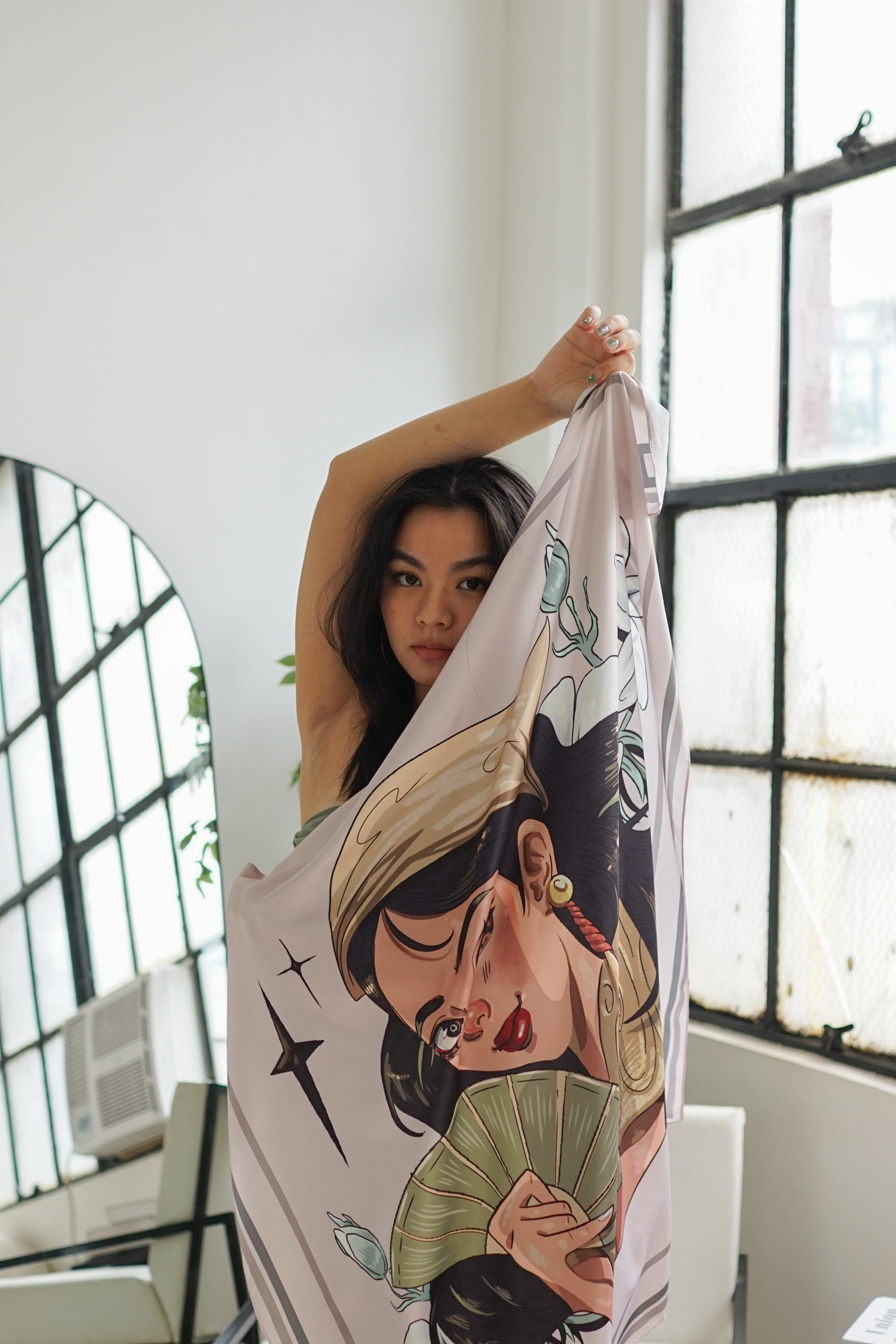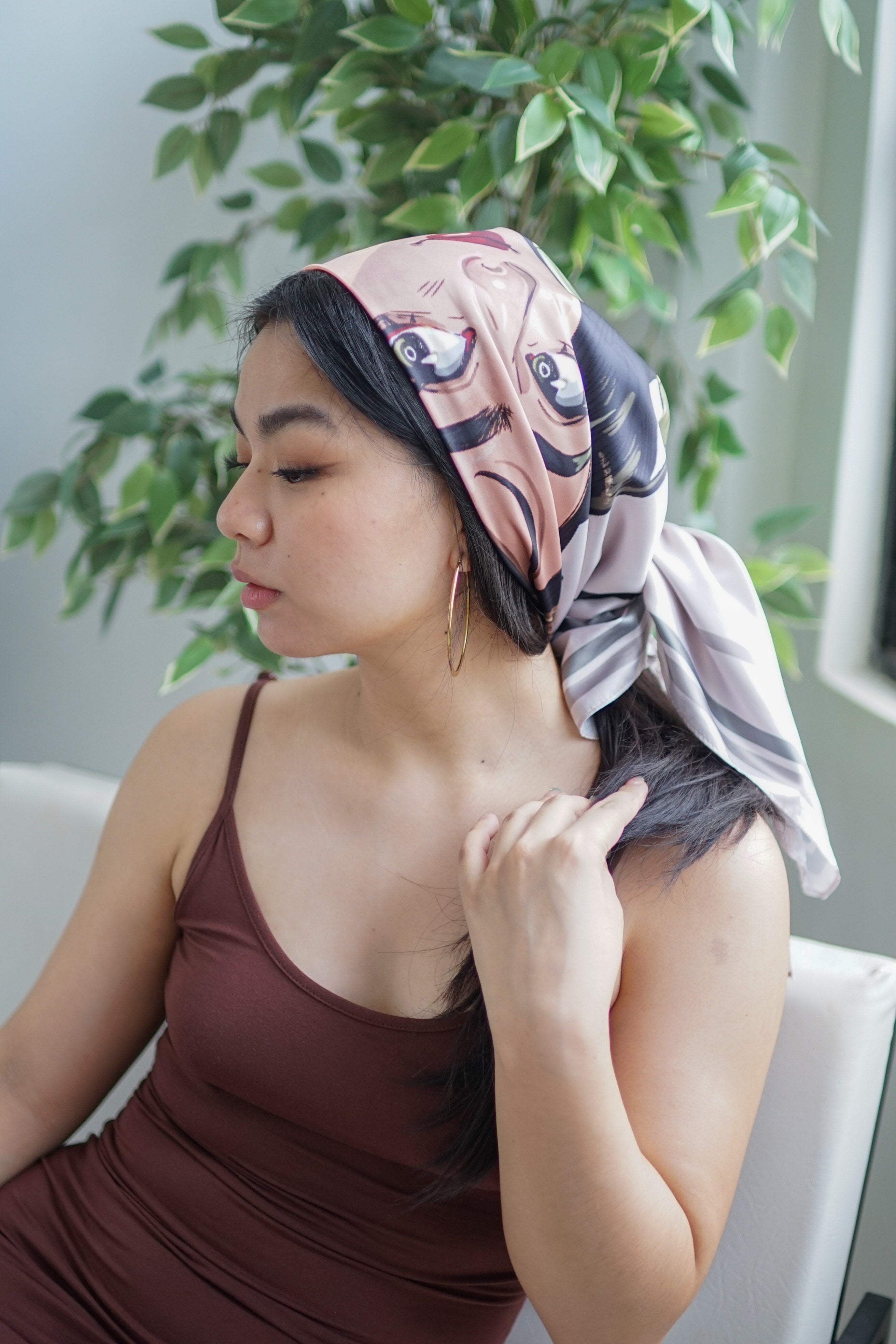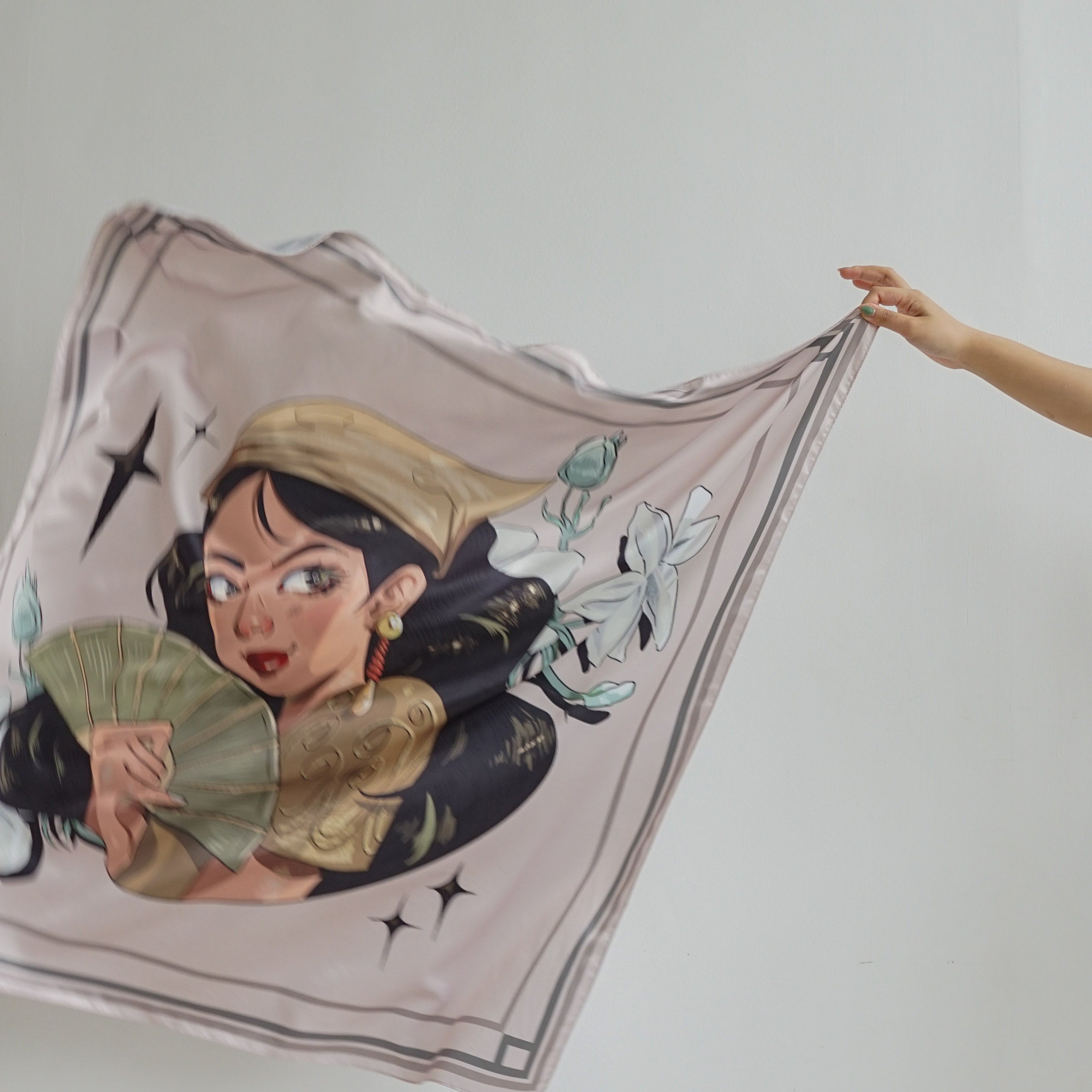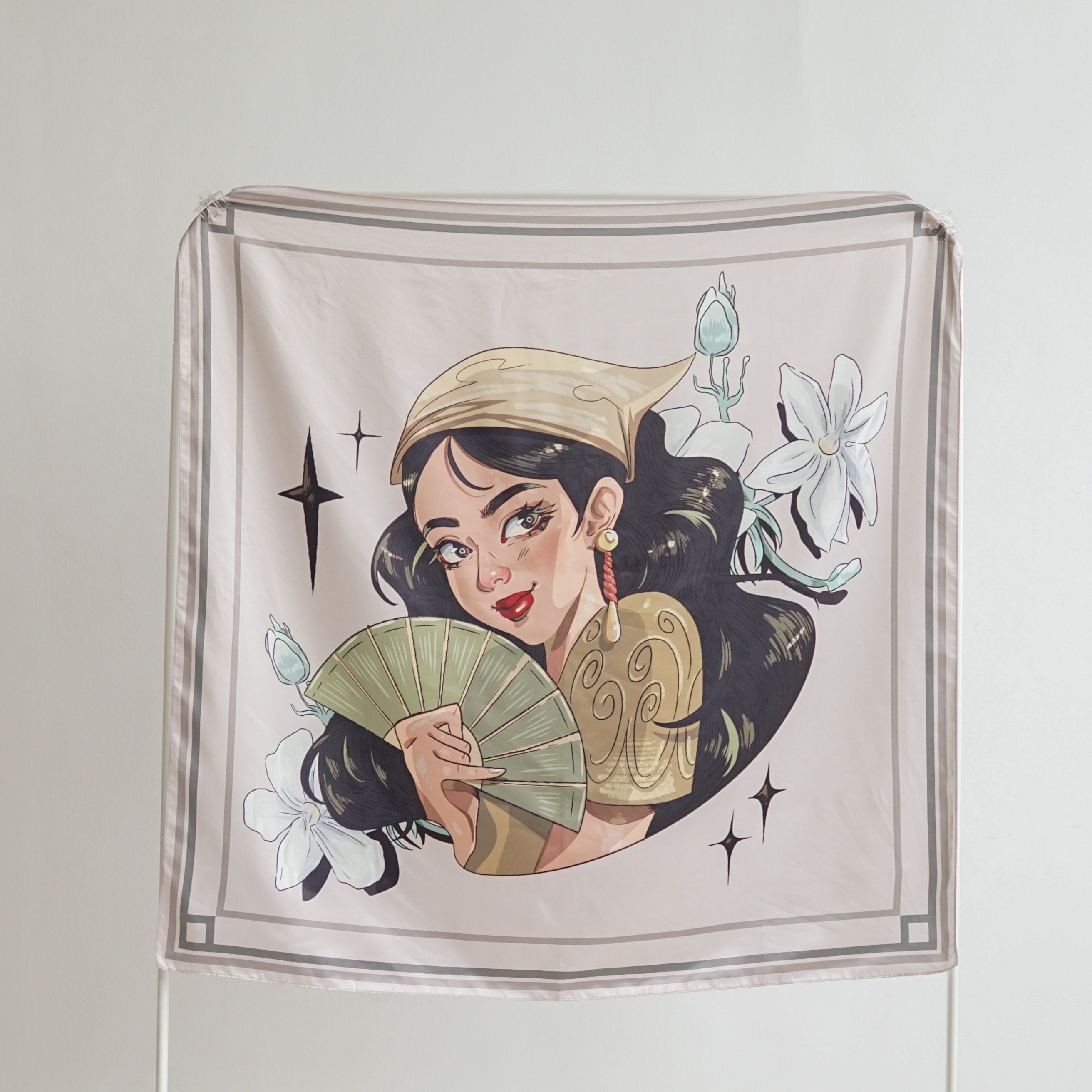 The design highlights elements of Filipino beauty and symbolism, showcasing the artist's unique style and attention to detail. Perfect for adding a touch of sophistication to any outfit, this scarf can be styled in multiple ways—as a chic neck accessory, a statement headpiece, or even a decorative wrap.