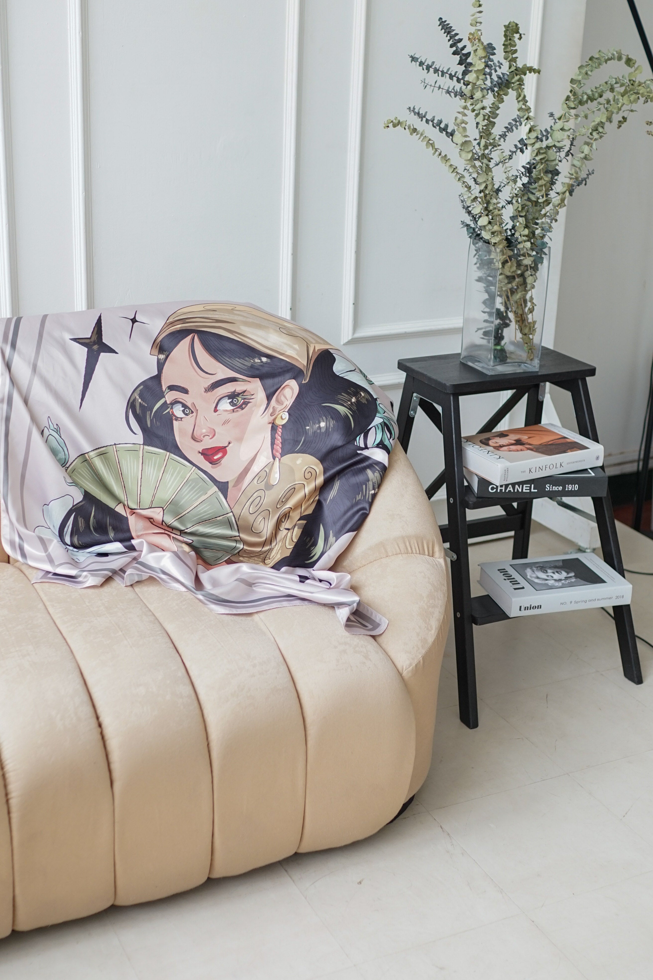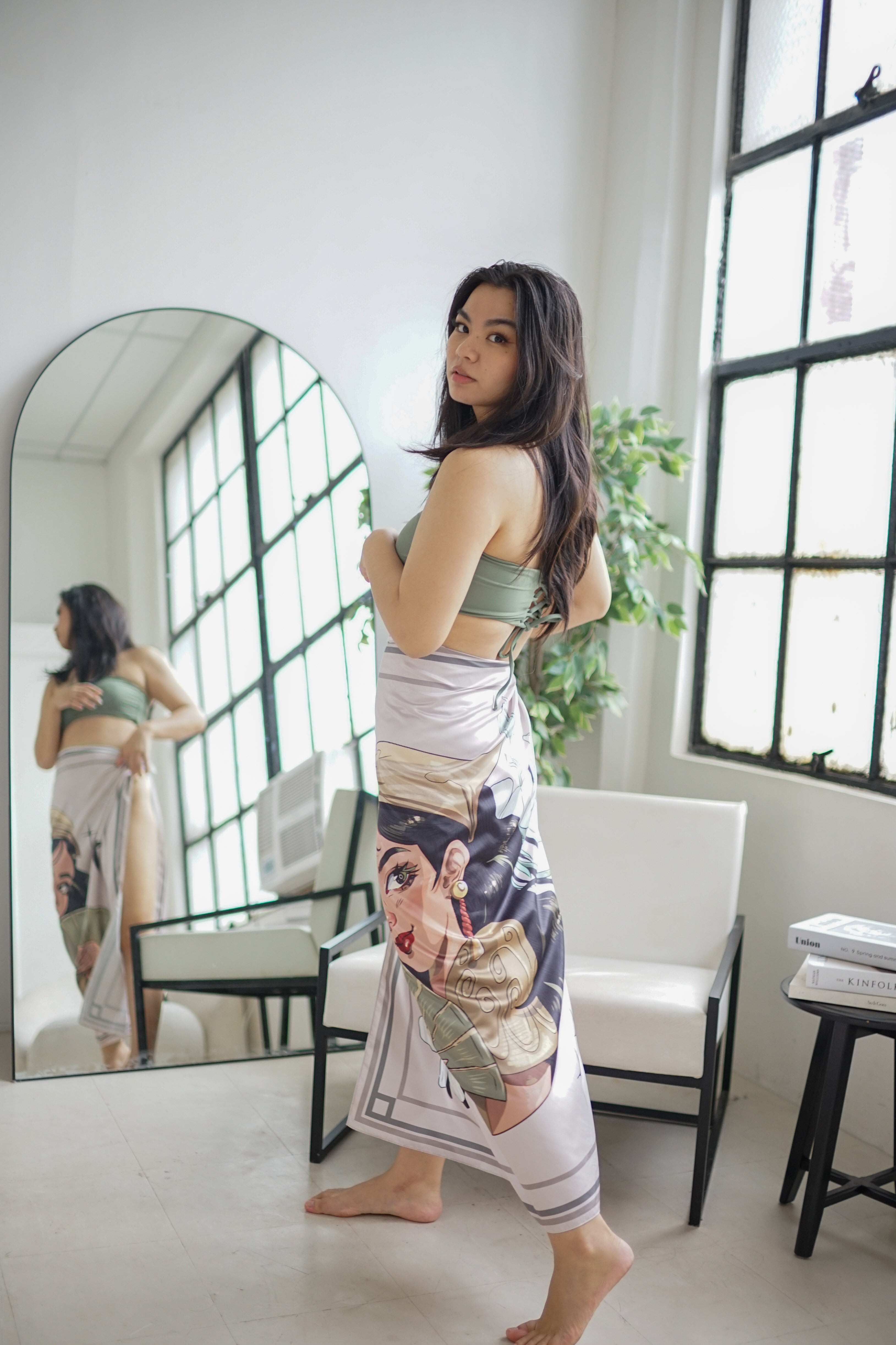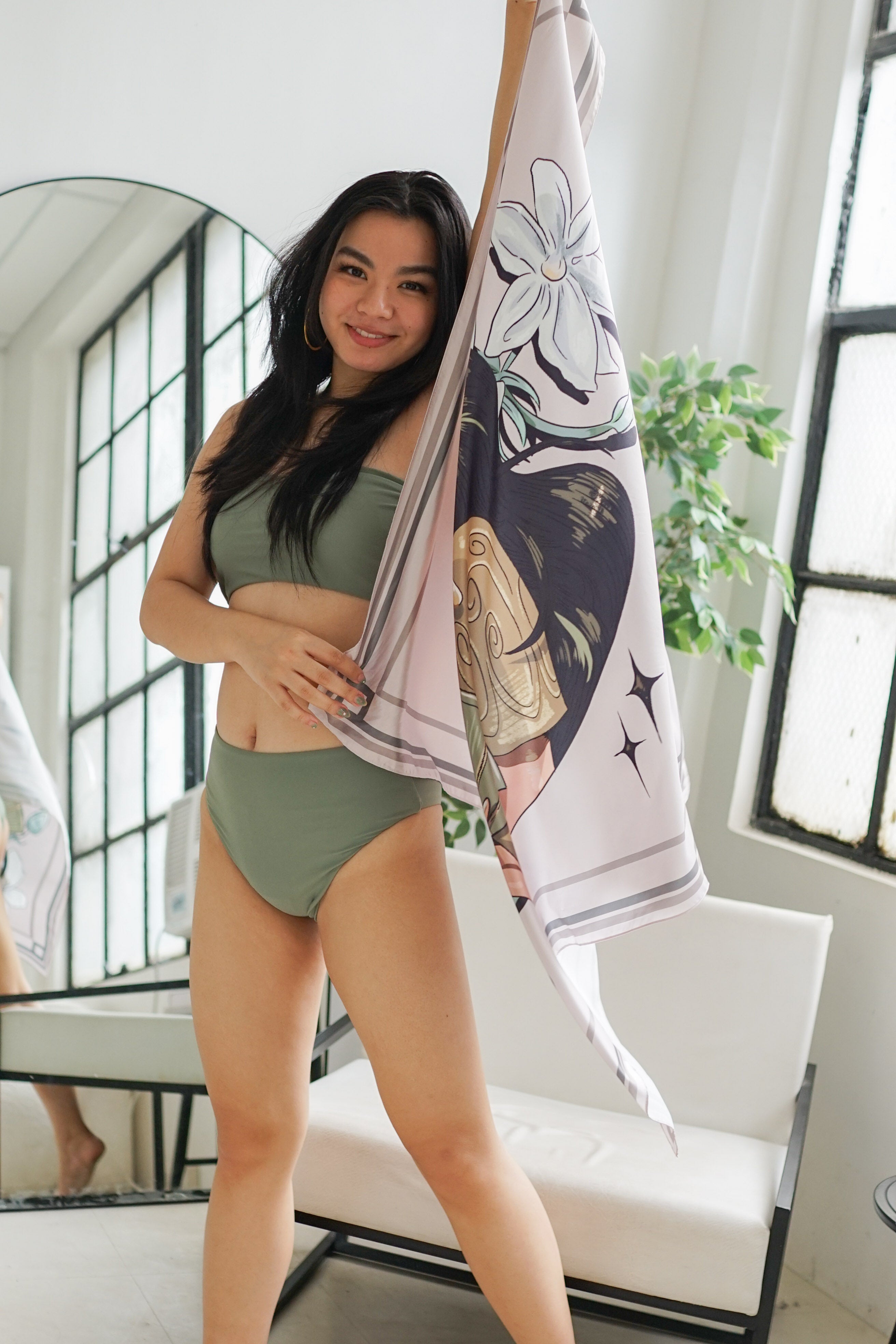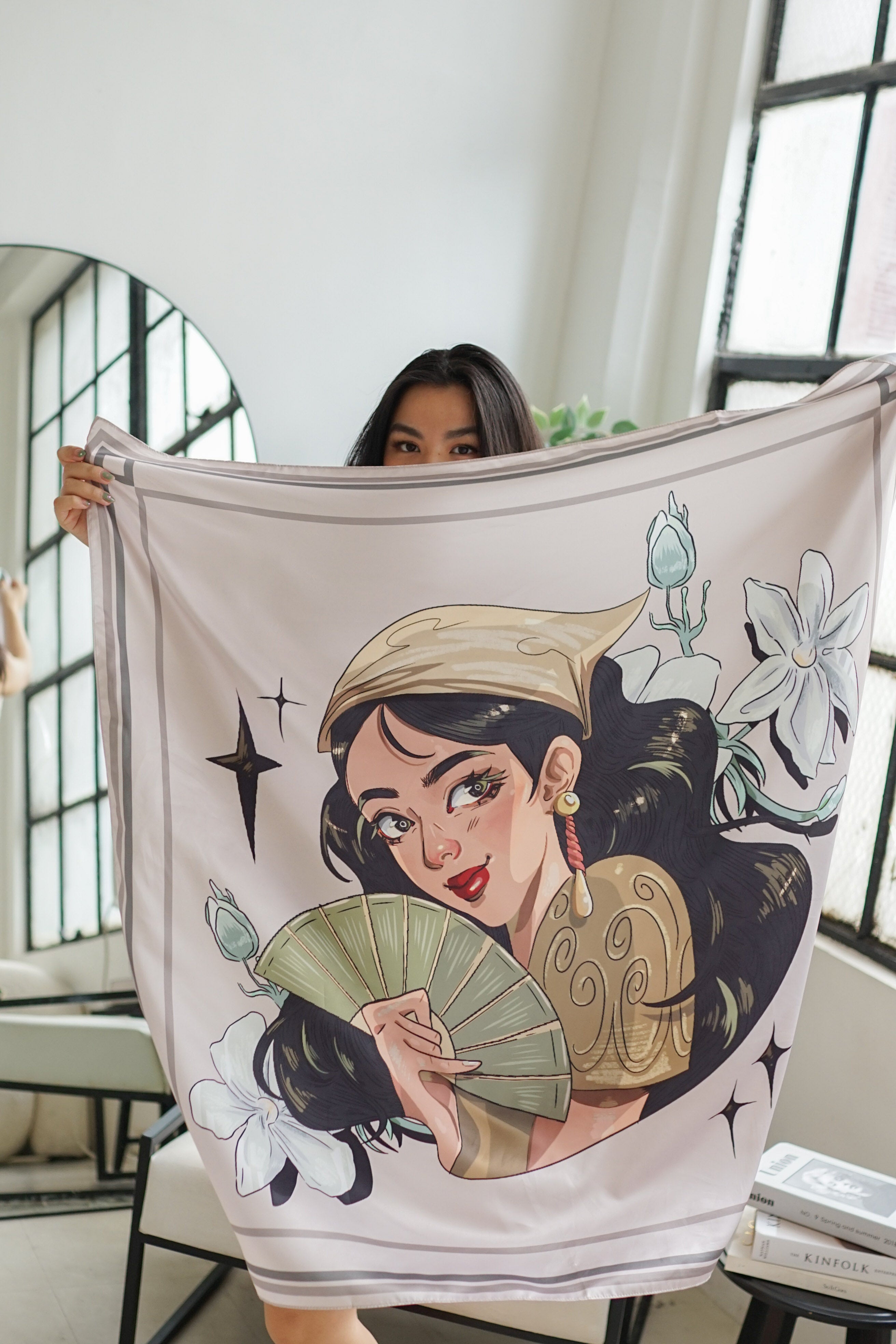 The design highlights elements of Filipino beauty and symbolism, showcasing the artist's unique style and attention to detail. Perfect for adding a touch of sophistication to any outfit, this scarf can be styled in multiple ways—as a chic neck accessory, a statement headpiece, or even a decorative wrap.