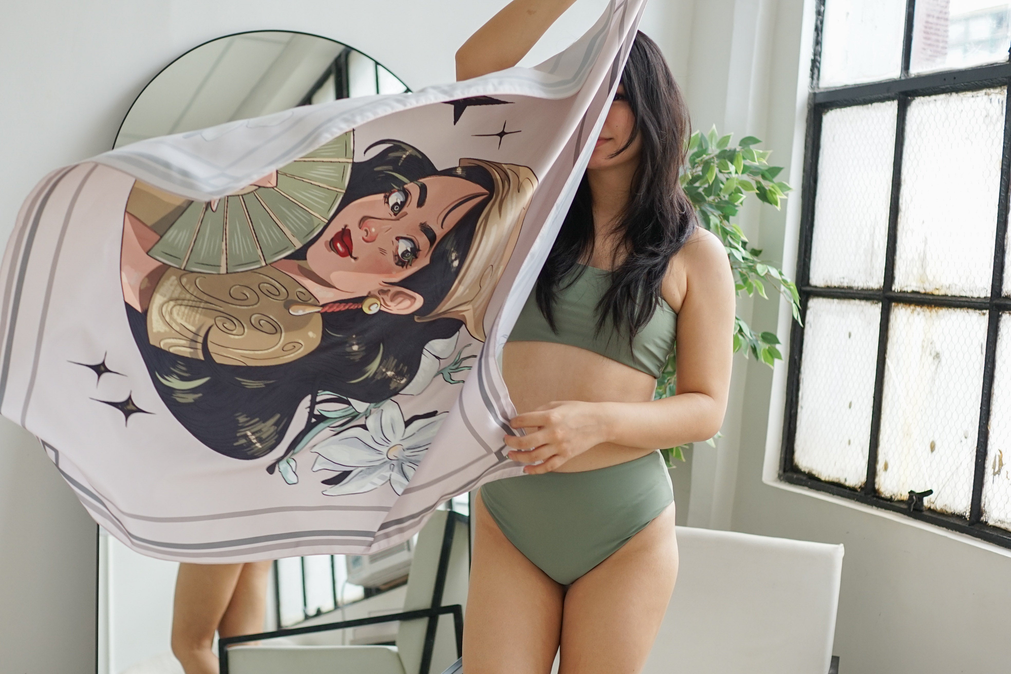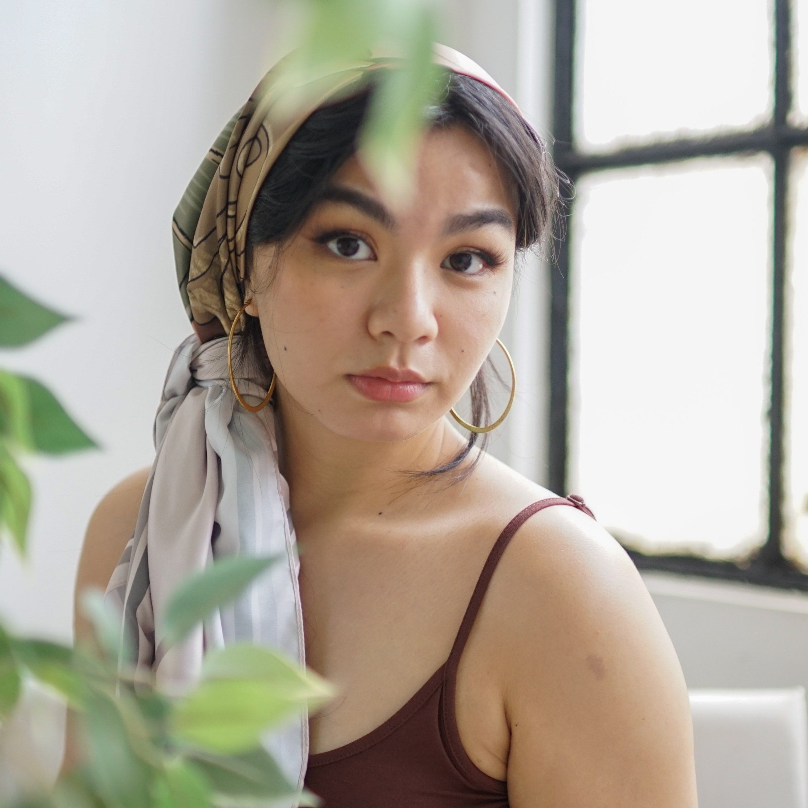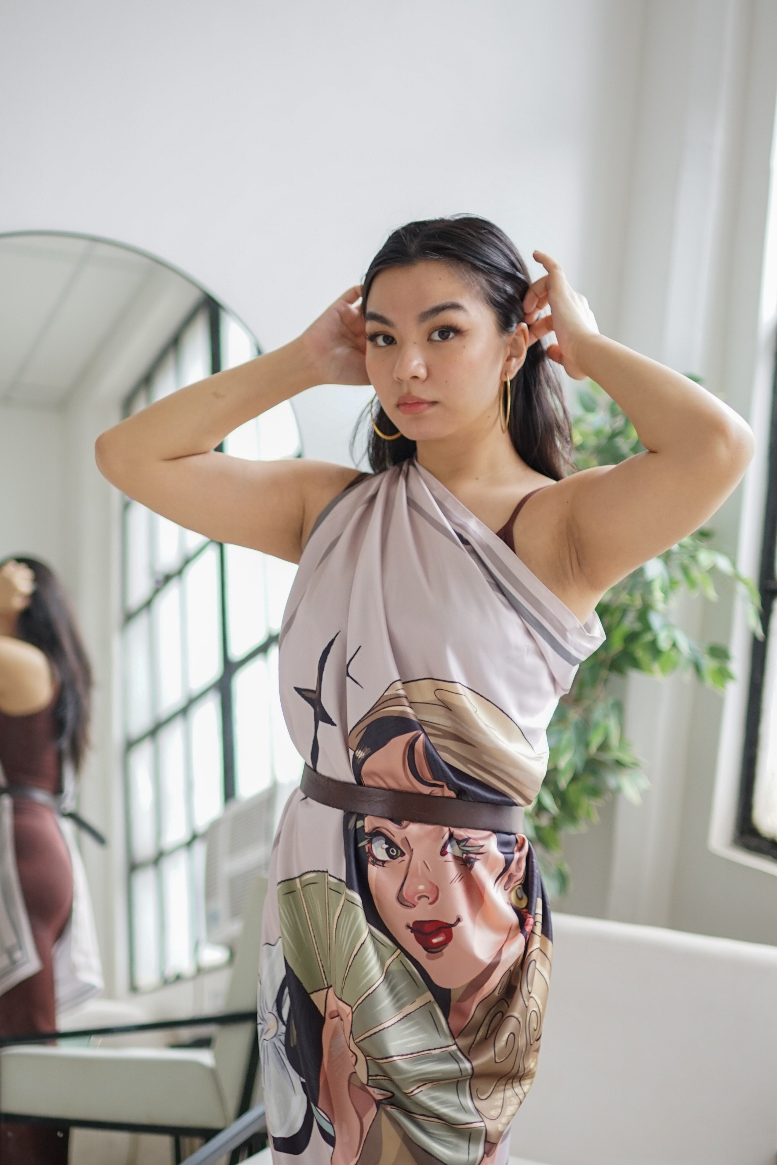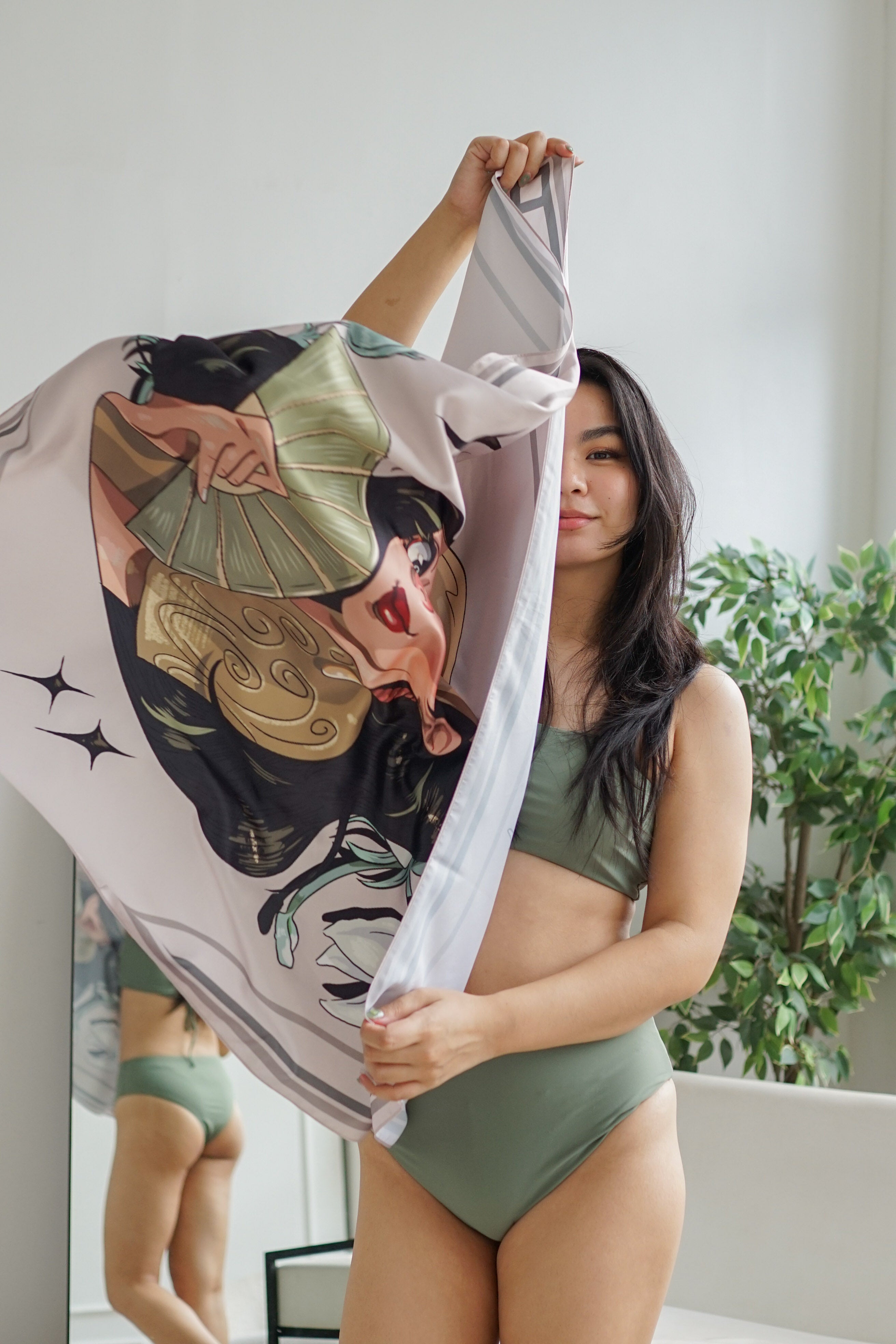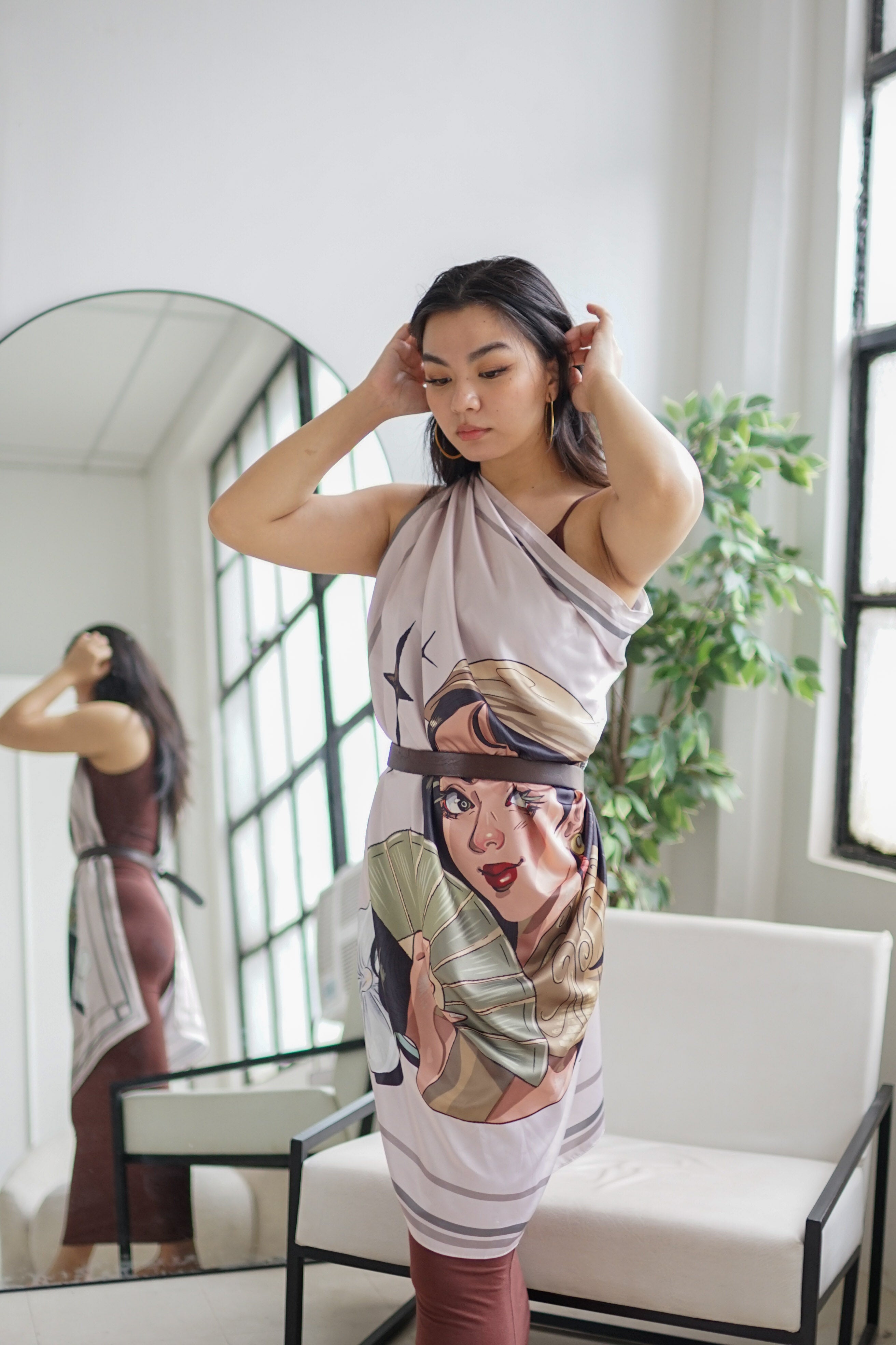 The design highlights elements of Filipino beauty and symbolism, showcasing the artist's unique style and attention to detail. Perfect for adding a touch of sophistication to any outfit, this scarf can be styled in multiple ways—as a chic neck accessory, a statement headpiece, or even a decorative wrap.