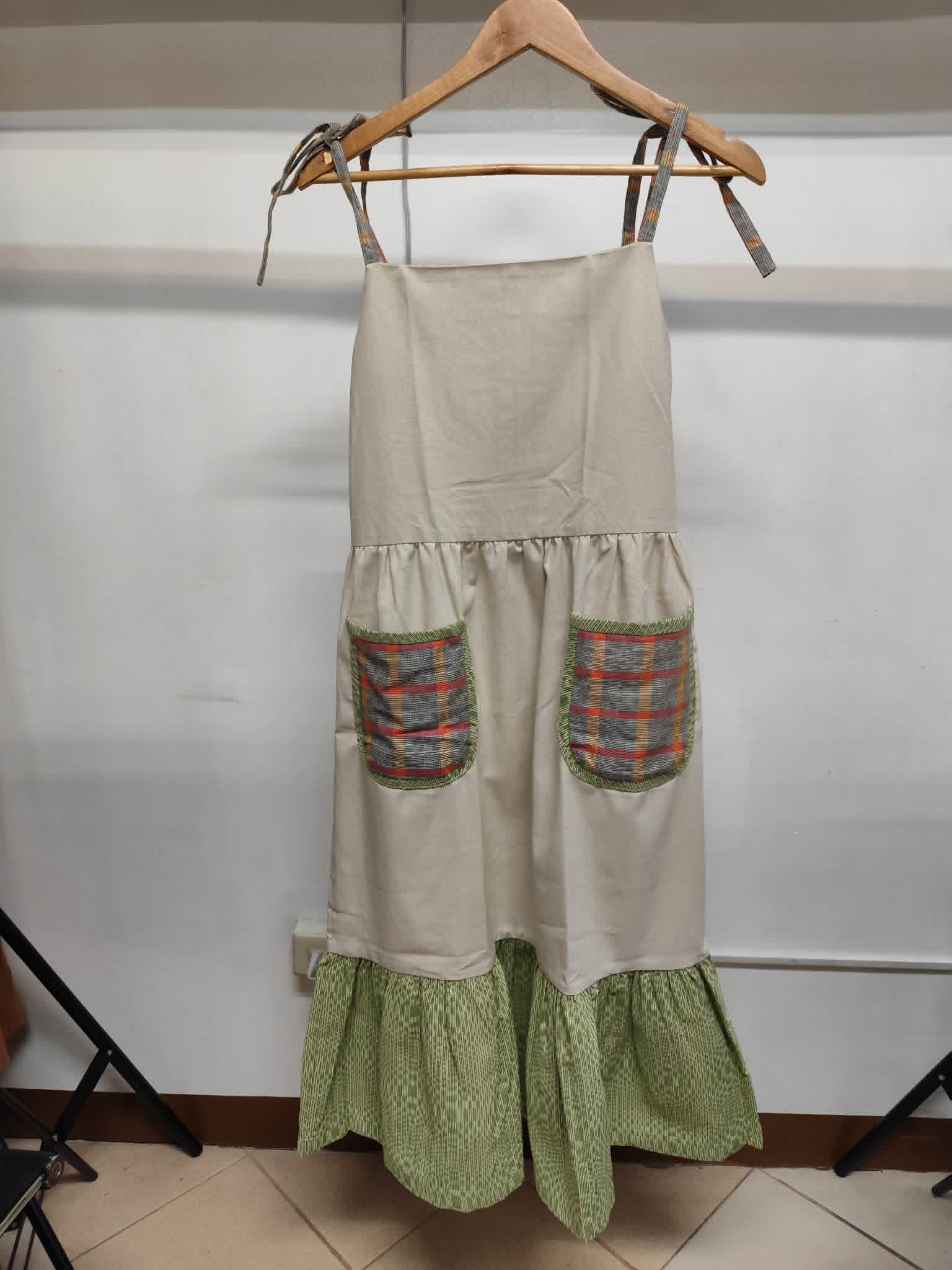 Be in your Sunday's Best with our Marie Strapless Ruffle Midi Dress designed for comfort and whimsy. Comes in Cream and Olive, but with contrasting and a play on binakol accents in Green with Blue/Orange and Striped Pink with Beige on the pockets, straps, and ruffled hem. This dress is perfect for summer days out! Available in sizes Small to Extra Large.