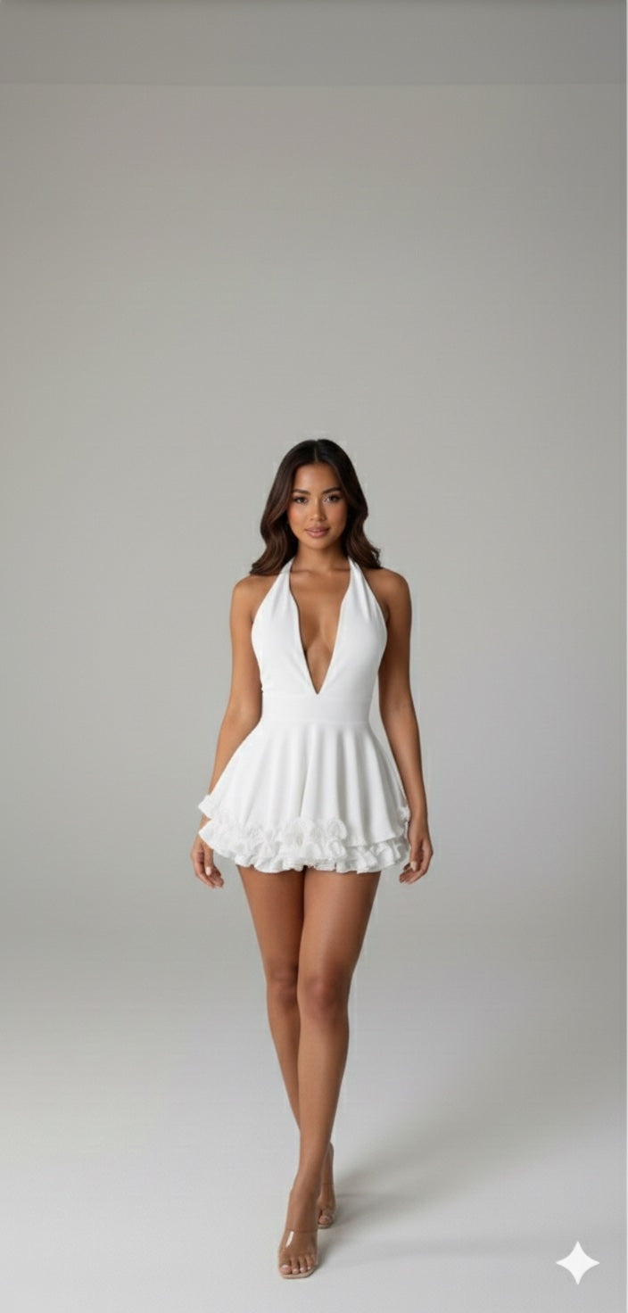 Mini dress, party look, elegant and fun. deep plunging halter V-neck, fitted, cinched at the waist for hourglass effect, short, flared mini skirt with layered ruffle flower trim at the hem, smooth stretchy fabrics, structured with good drape.