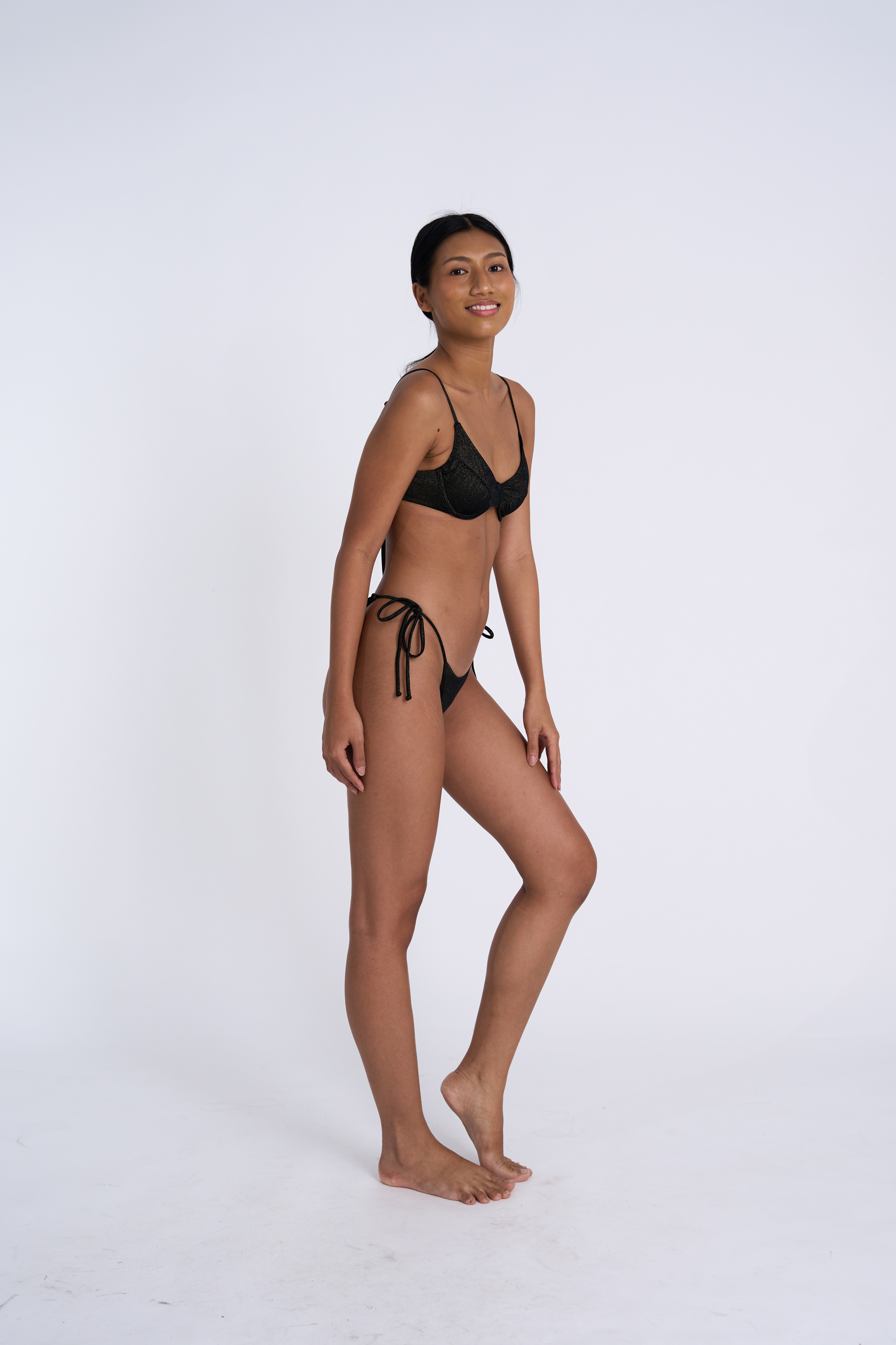 This underwire bikini top brings the perfect mix of support and style, giving you a lifted, structured look with a flattering scoop neckline. The adjustable spaghetti straps and tie-back closure ensure a comfy, customizable fit, while the shimmer fabric catches the light for a radiant, head-turning glow.