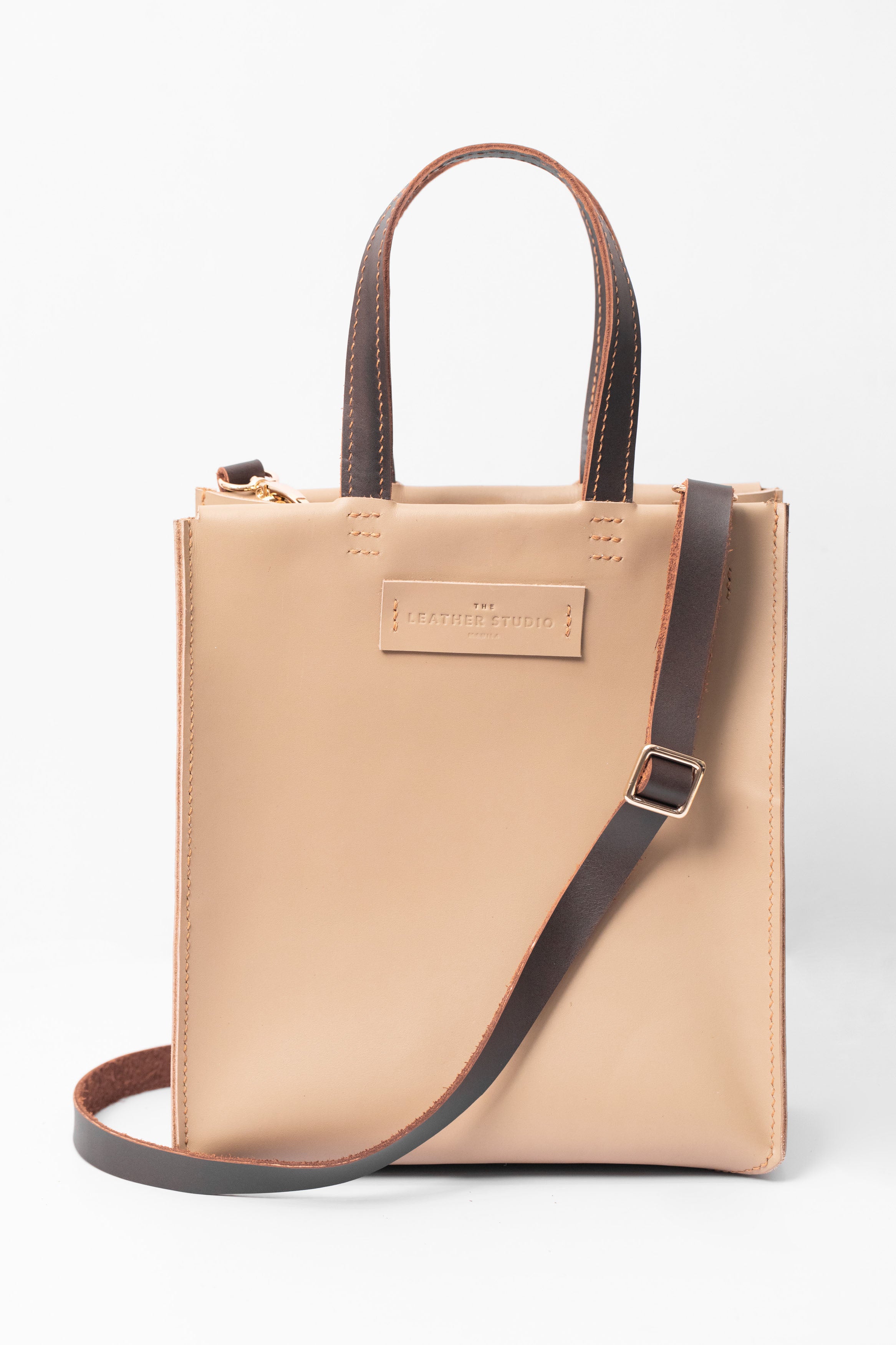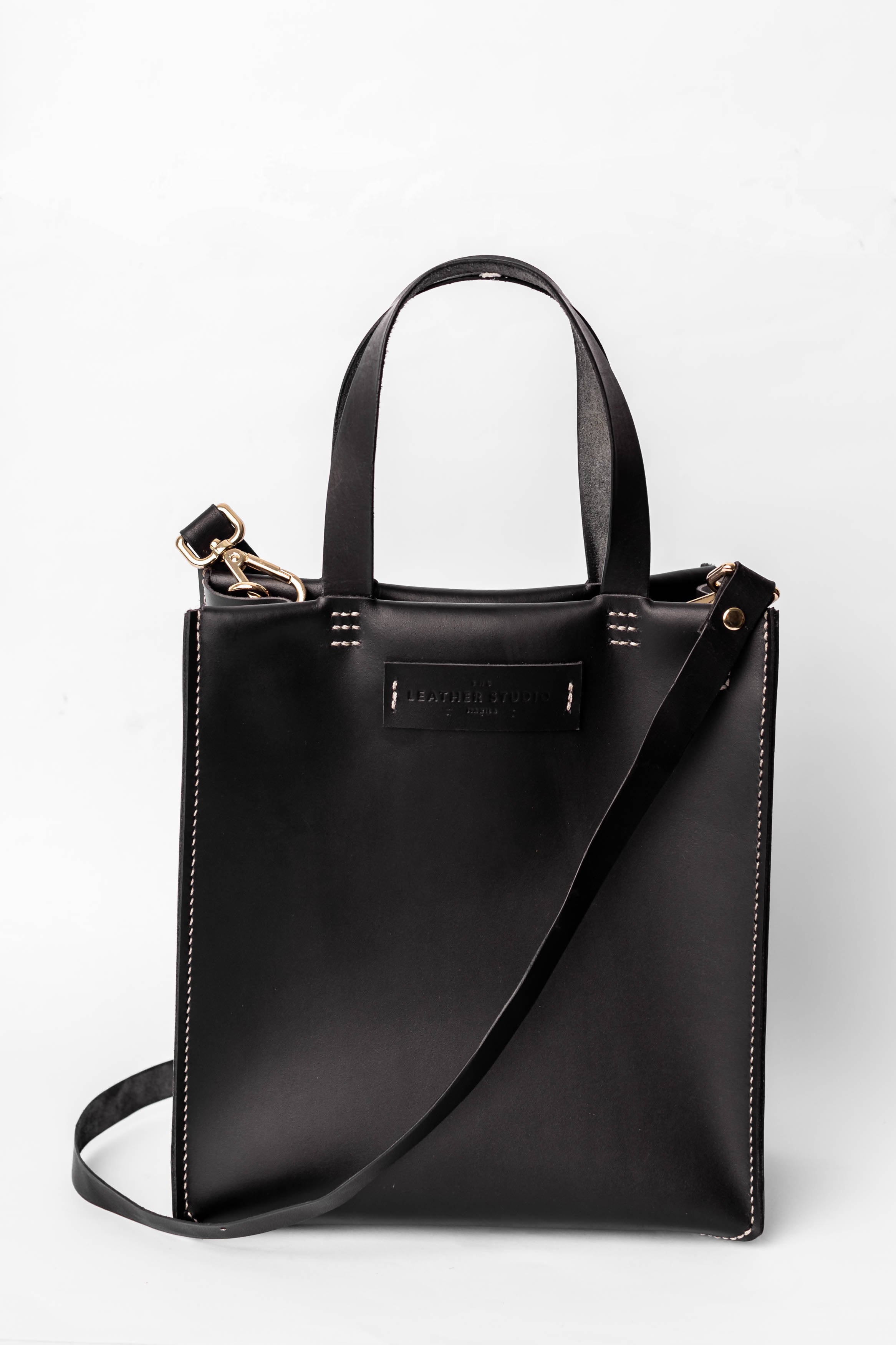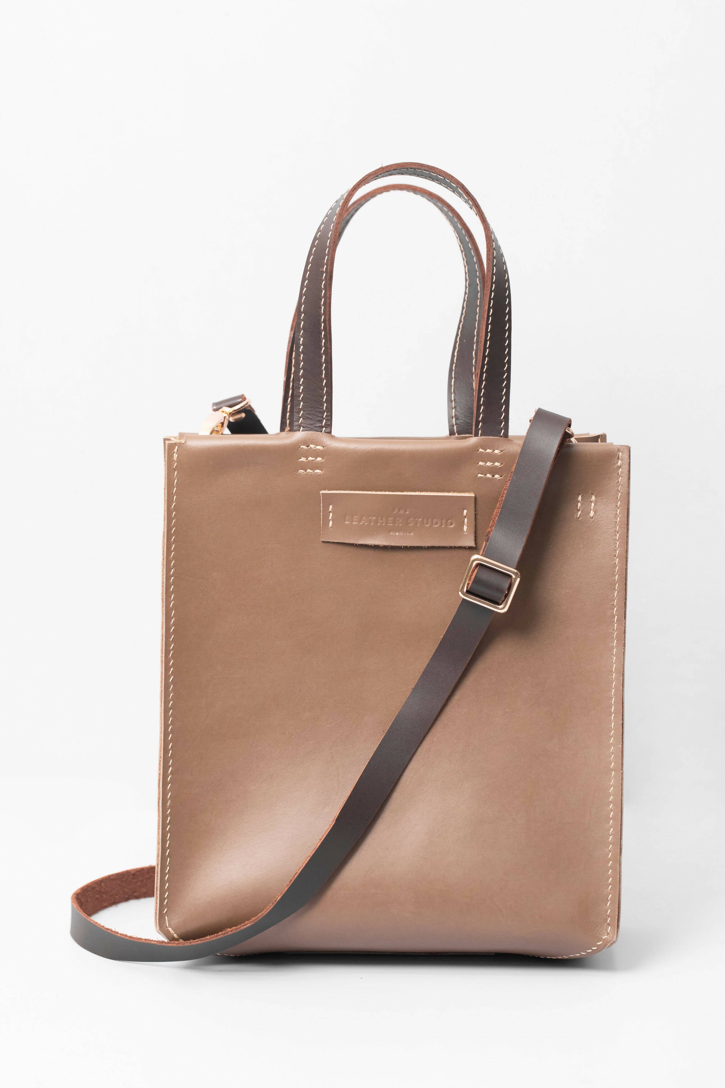 Hand-cut and Hand-stitched  Colors: Khaki, Black and Ivory Made from genuine cowhide leather With magnetic enclosure Unlined Has removable and adjustable straps Dimensions: L9 x D4.25 x H10 inches