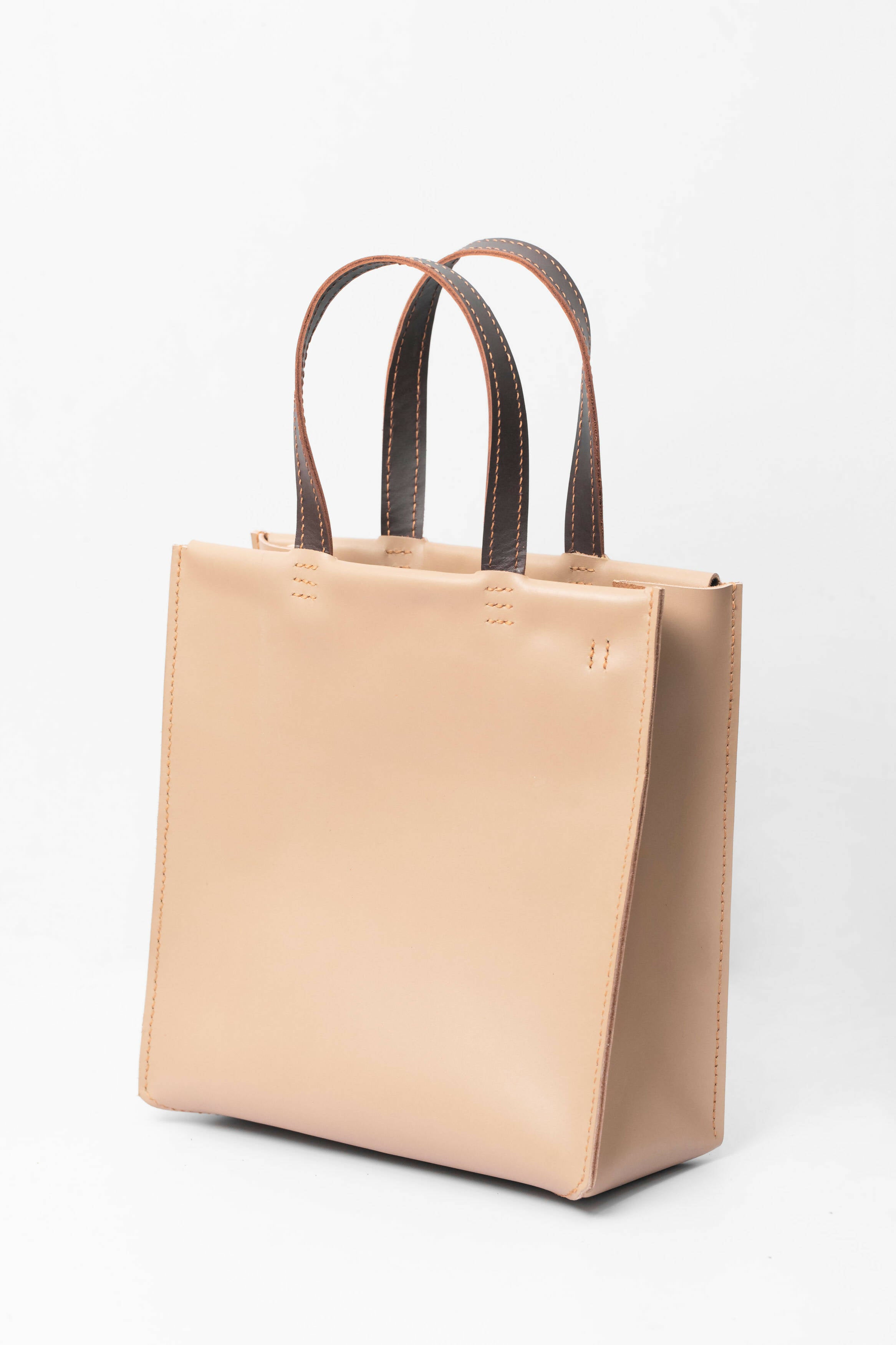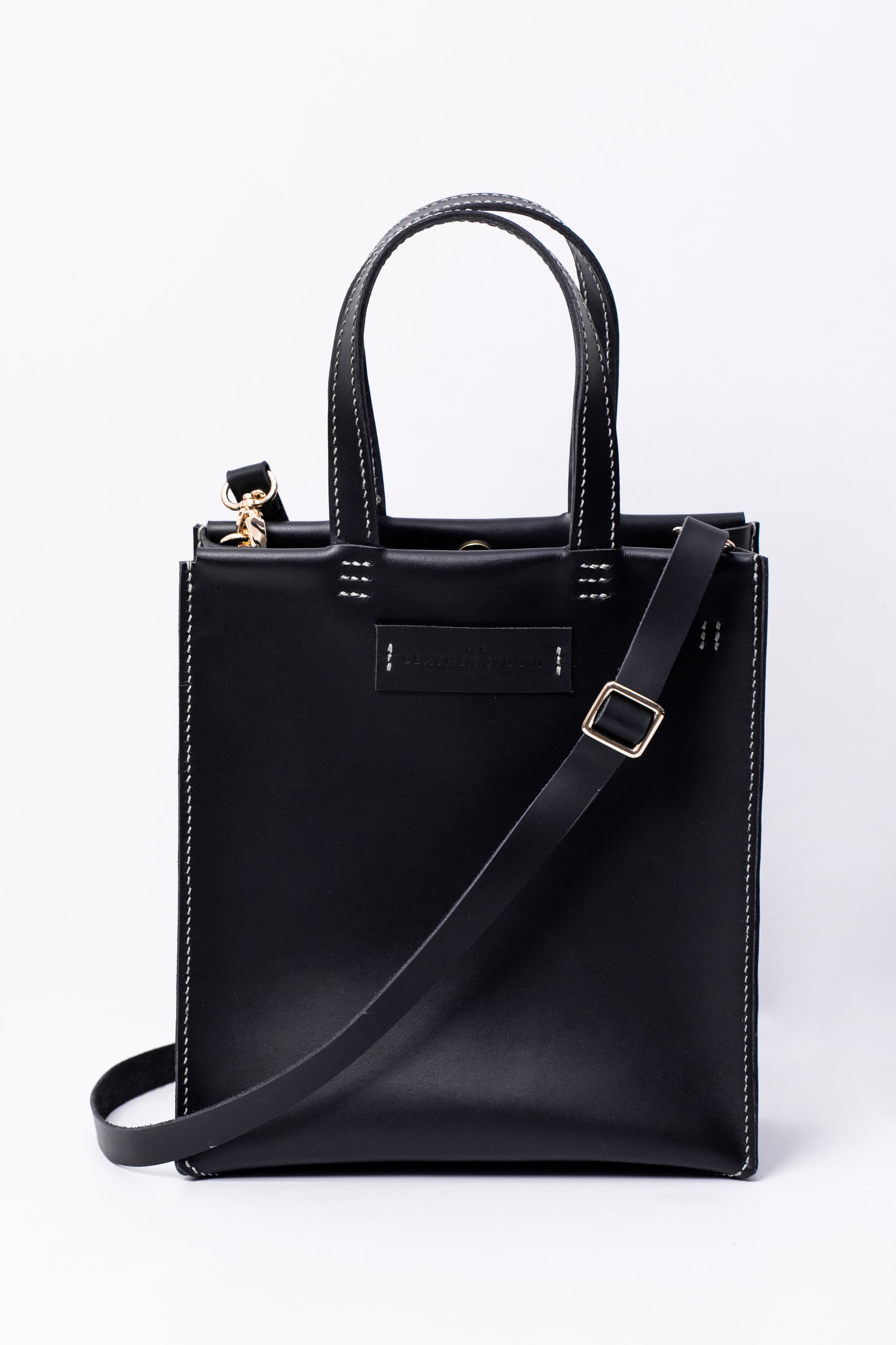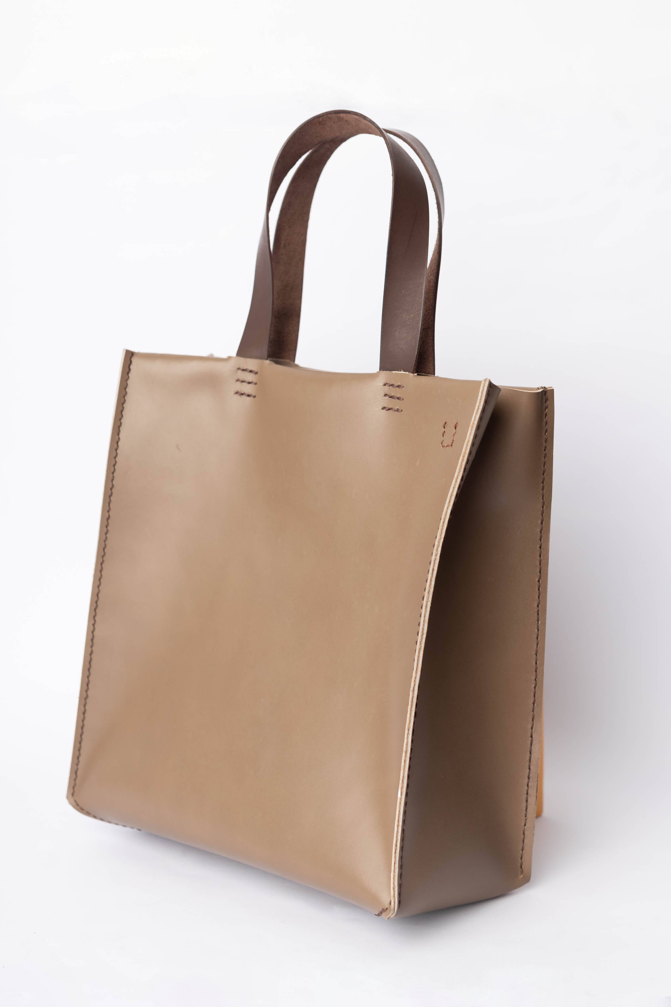Hand-cut and Hand-stitched  Colors: Khaki, Black and Ivory Made from genuine cowhide leather With magnetic enclosure Unlined Has removable and adjustable straps Dimensions: L9 x D4.25 x H10 inches