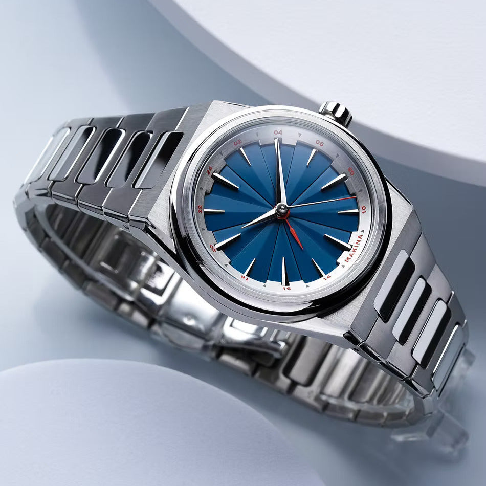 DIAL: Blue multi-faceted brass dial with thick metallic indices and faceted alpha hands.