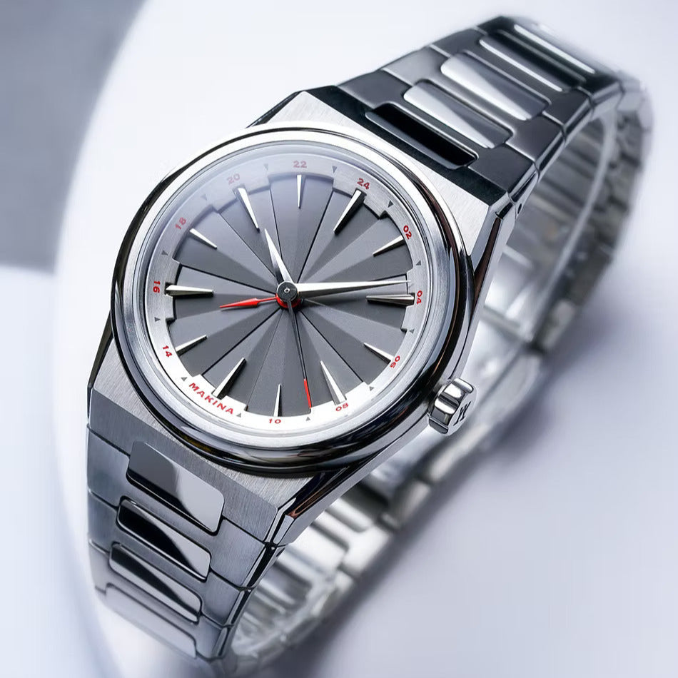 Inspired by the original Mephisto, this evolution features multiple layers, tall metallic indices, and faceted alpha hands, creating a dynamic interplay of light with every wrist movement. The stainless steel-colored outer ring, finished with a refined brushed texture, integrates seamlessly with the bezel and prominently displays a 24-hour scale in red, enhancing separation, improving visibility, and establishing a clear visual connection to the matching red GMT hand.