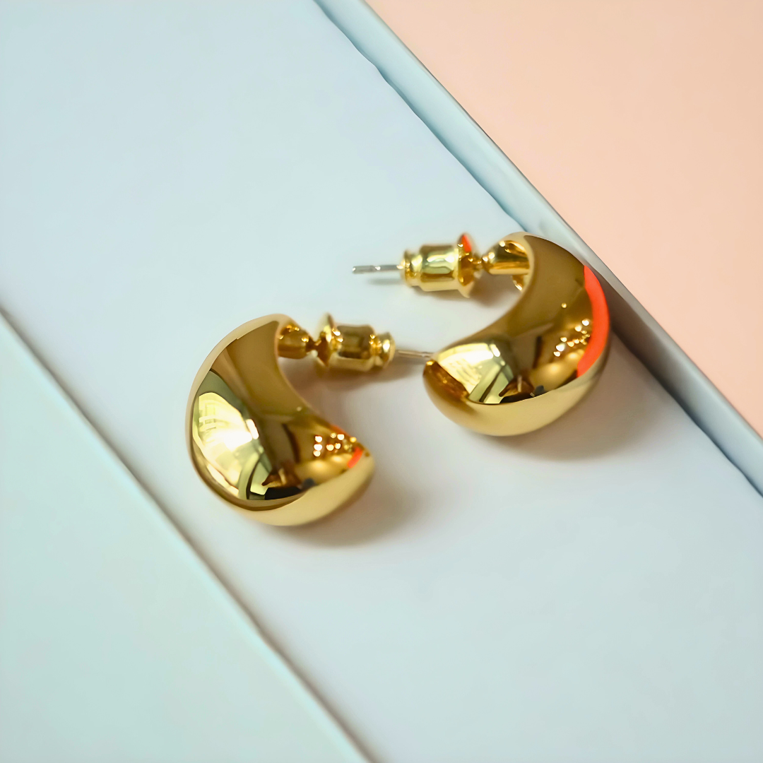 Material: sustainable brass Finishing: thick18k gold plating Size: the earrings is about 4cm The overall shape of the earrings is like a bay of bright moon, wrapping the earlobes well