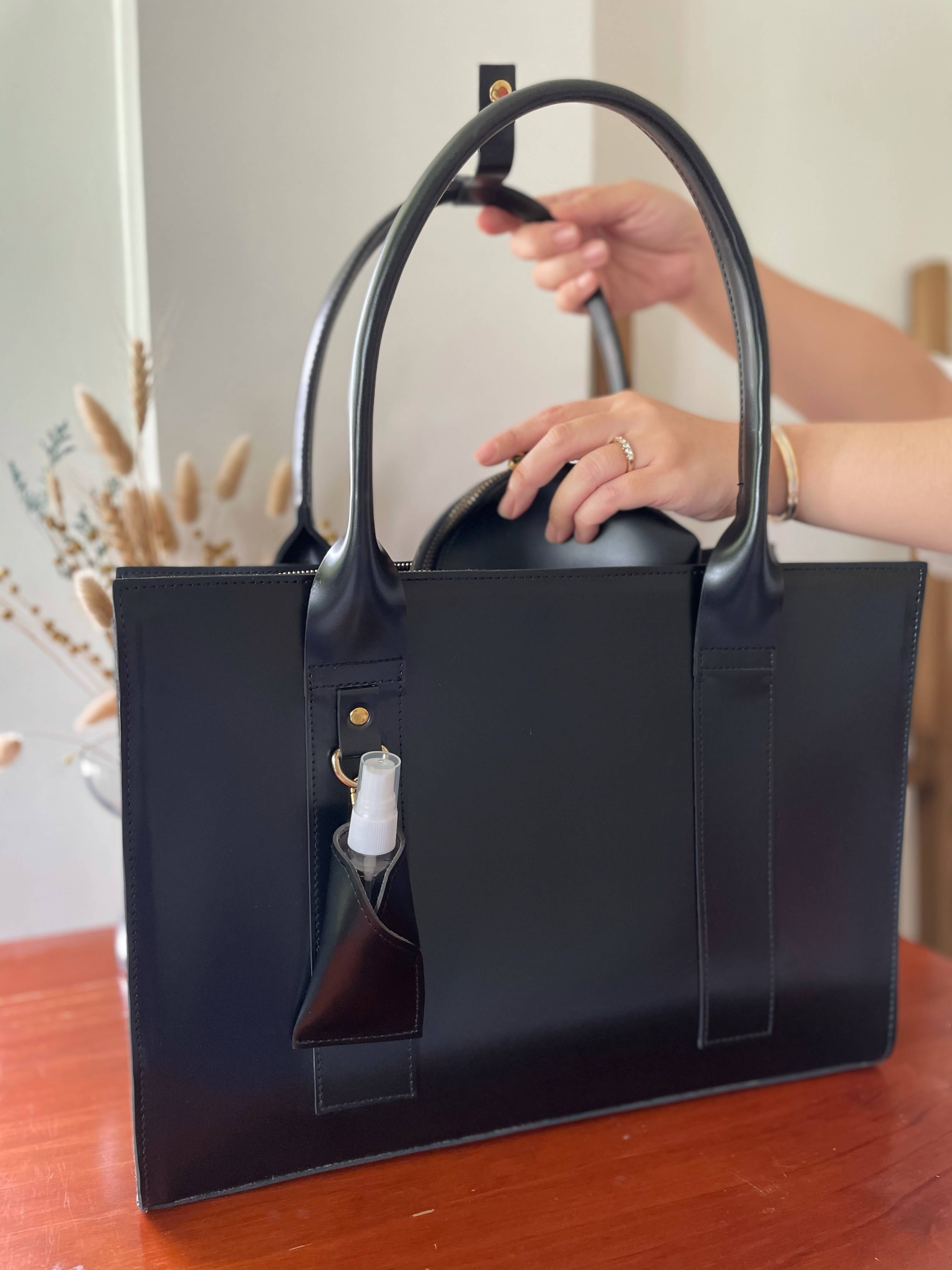 Lightweight. Roomy. Structured ToteZipped ToteCan fit 15" LaptopLined interior5 internal pockets (1 zipped, 4 side pockets)Detachable Spray Bottle Sleeve includedKey Chain Hook